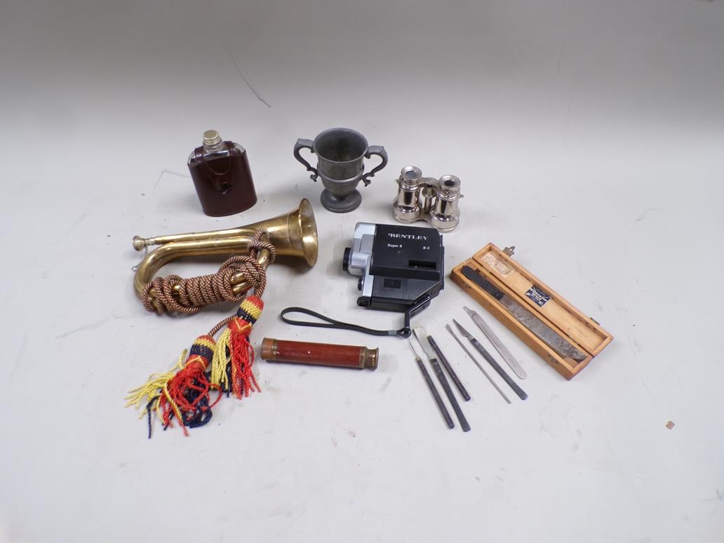 BOX OF MISC. ITEMS INC. TRUMPET AND BENTLEY SUPER 8 CAMERA