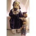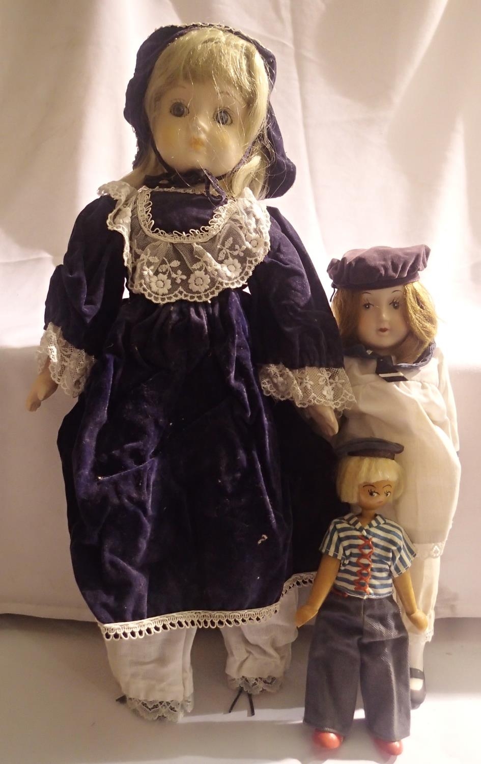 Two porcelain dolls, largest H: 45 cm plus small wooden doll H: 18 cm. P&P Group 1 (£14+VAT for the first lot and £1+VAT for subsequent lots)