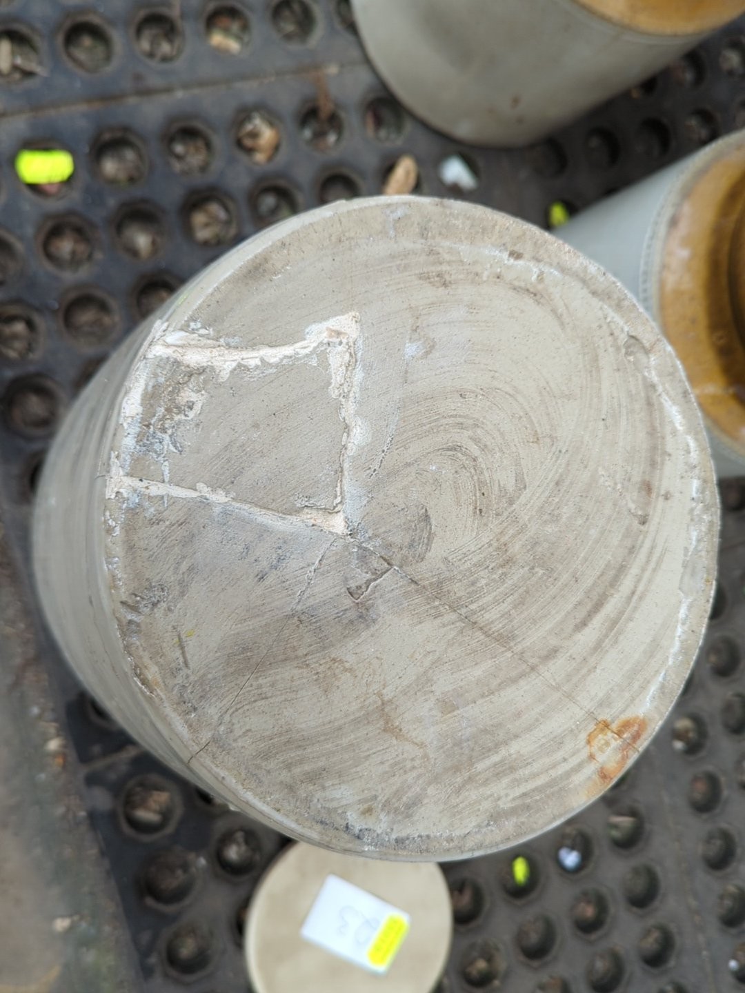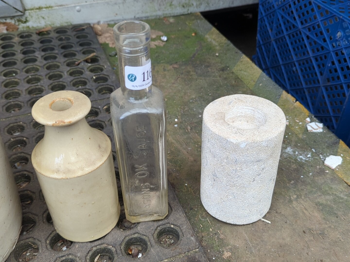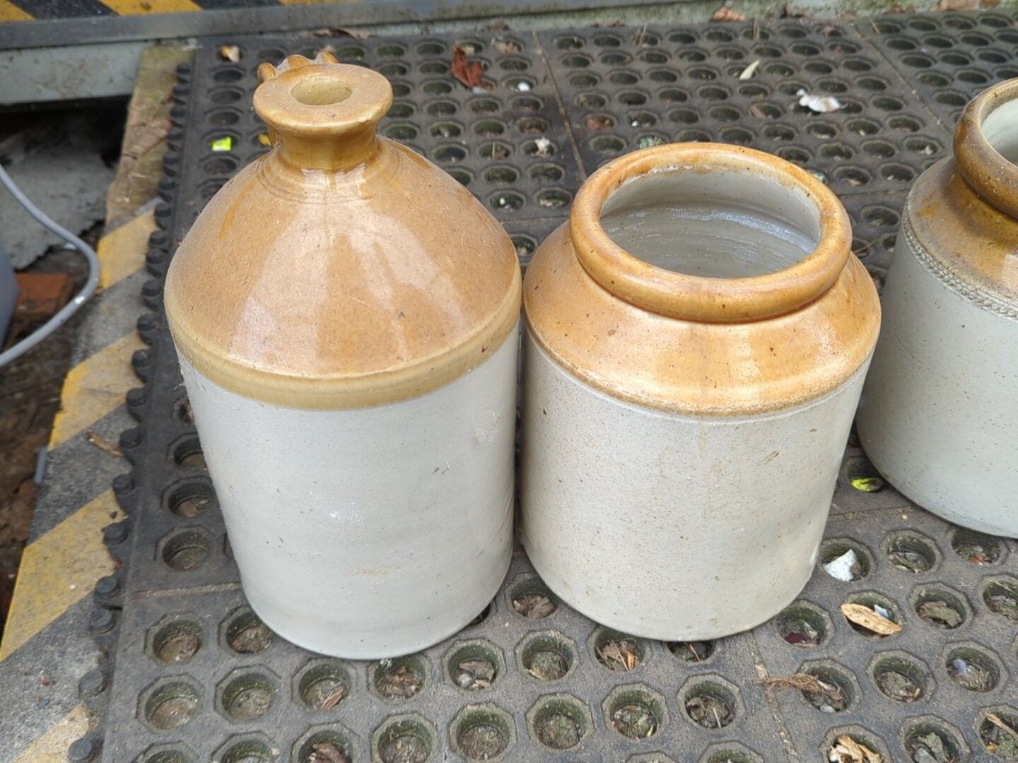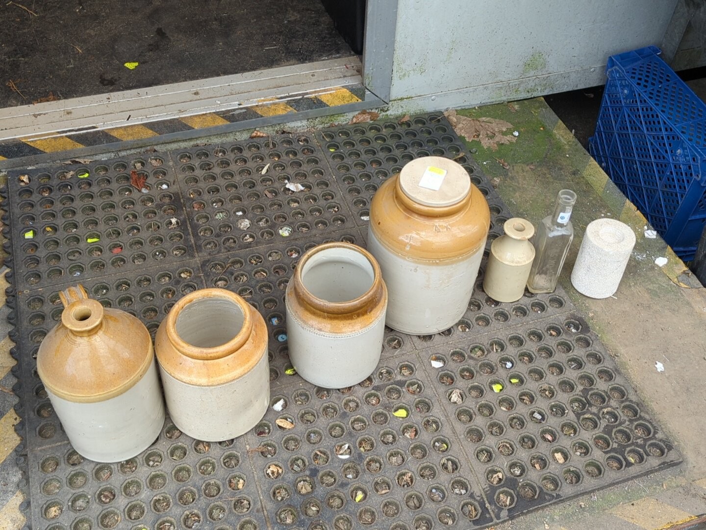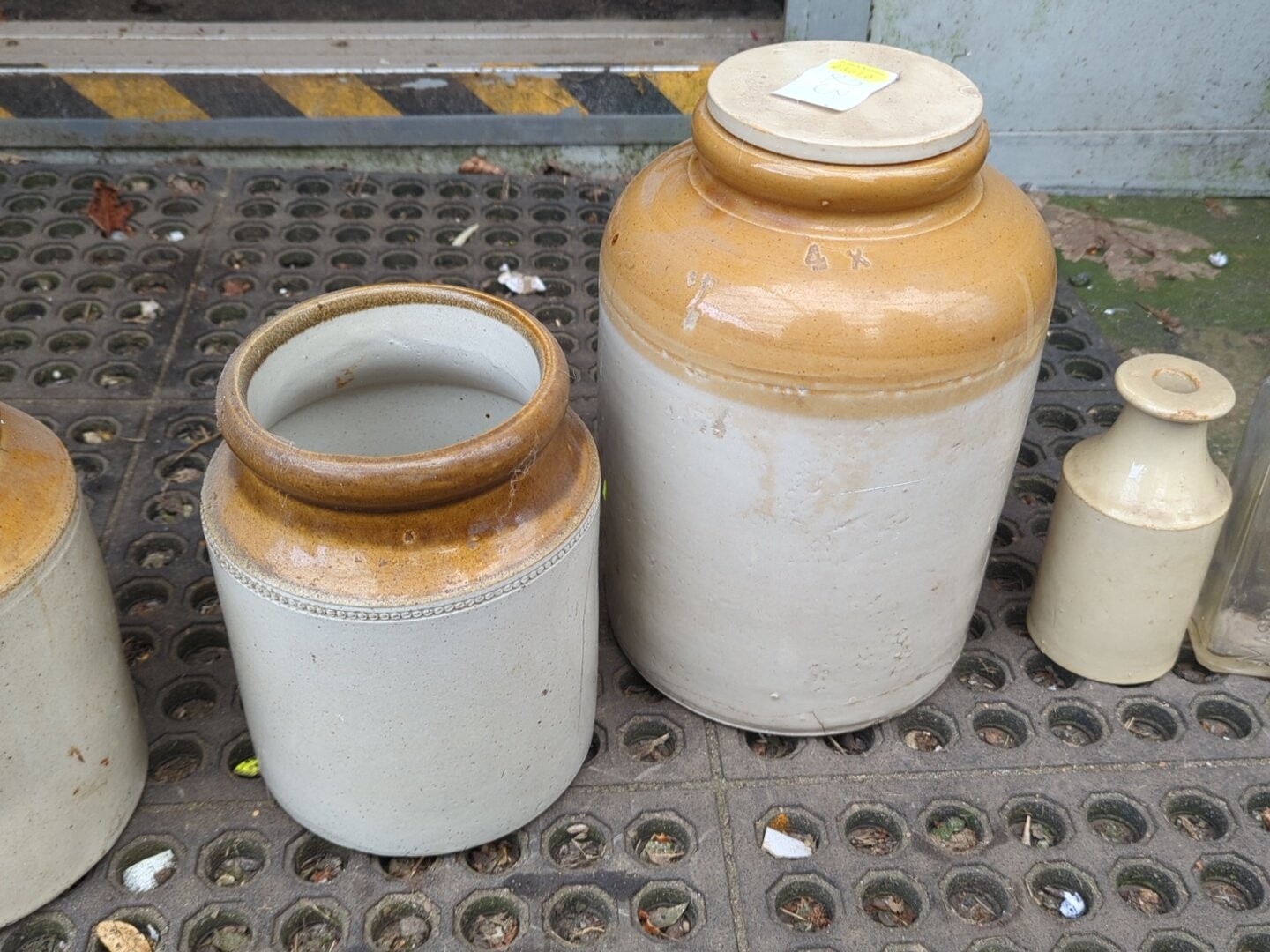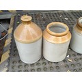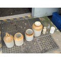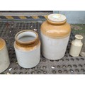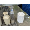 A group of salt-glazed stoneware storage jars and bottles, including several cylindrical crocks and a lidded jar, with brown-glazed shoulders; together with a small stoneware bottle, a square-section glass bottle.