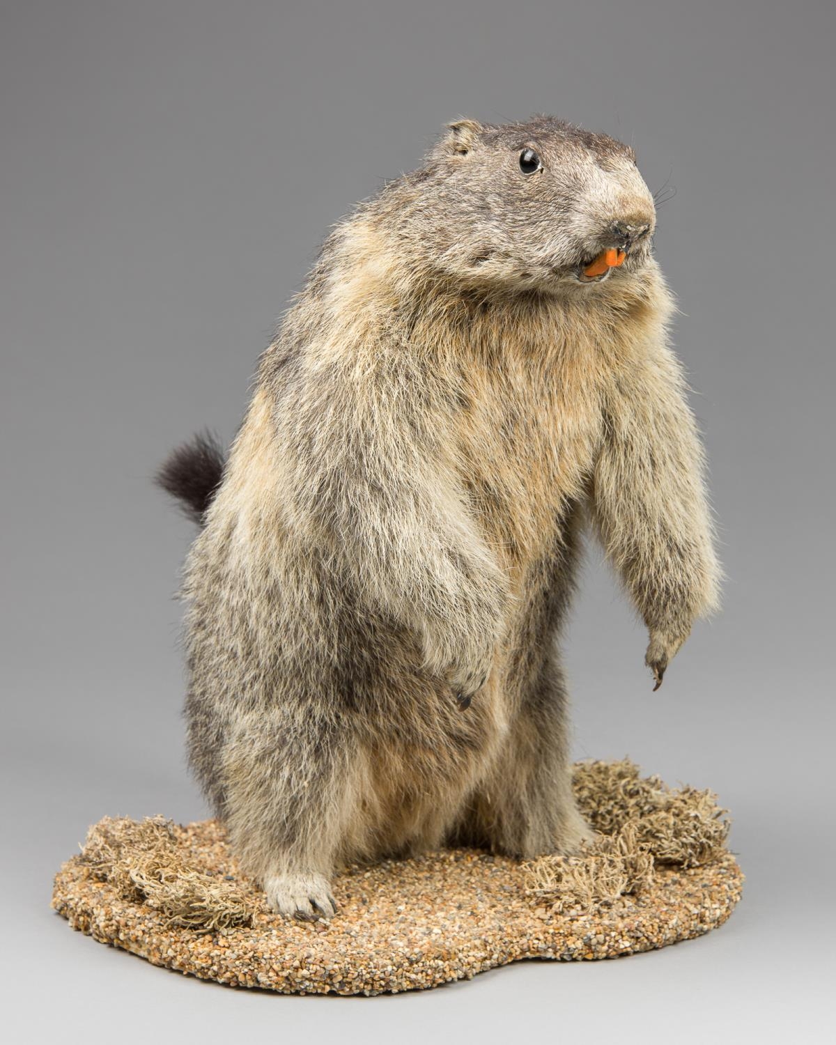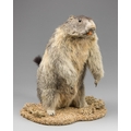A LATE 20TH CENTURY TAXIDERMY ALPINE MARMOT UPON A NATURALISTIC BASE. (h 38cm x w 30cm x d 33cm)