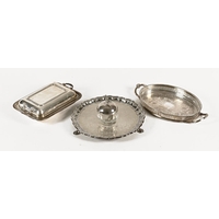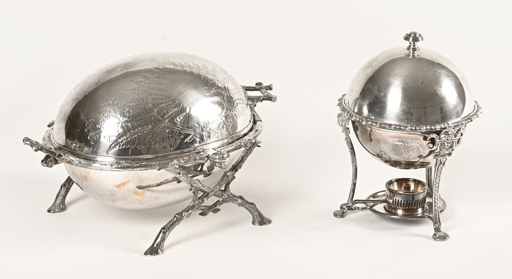 An antique plated silver rollover breakfast dish, with branch form supports and a similar style egg coddler.