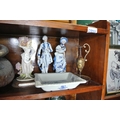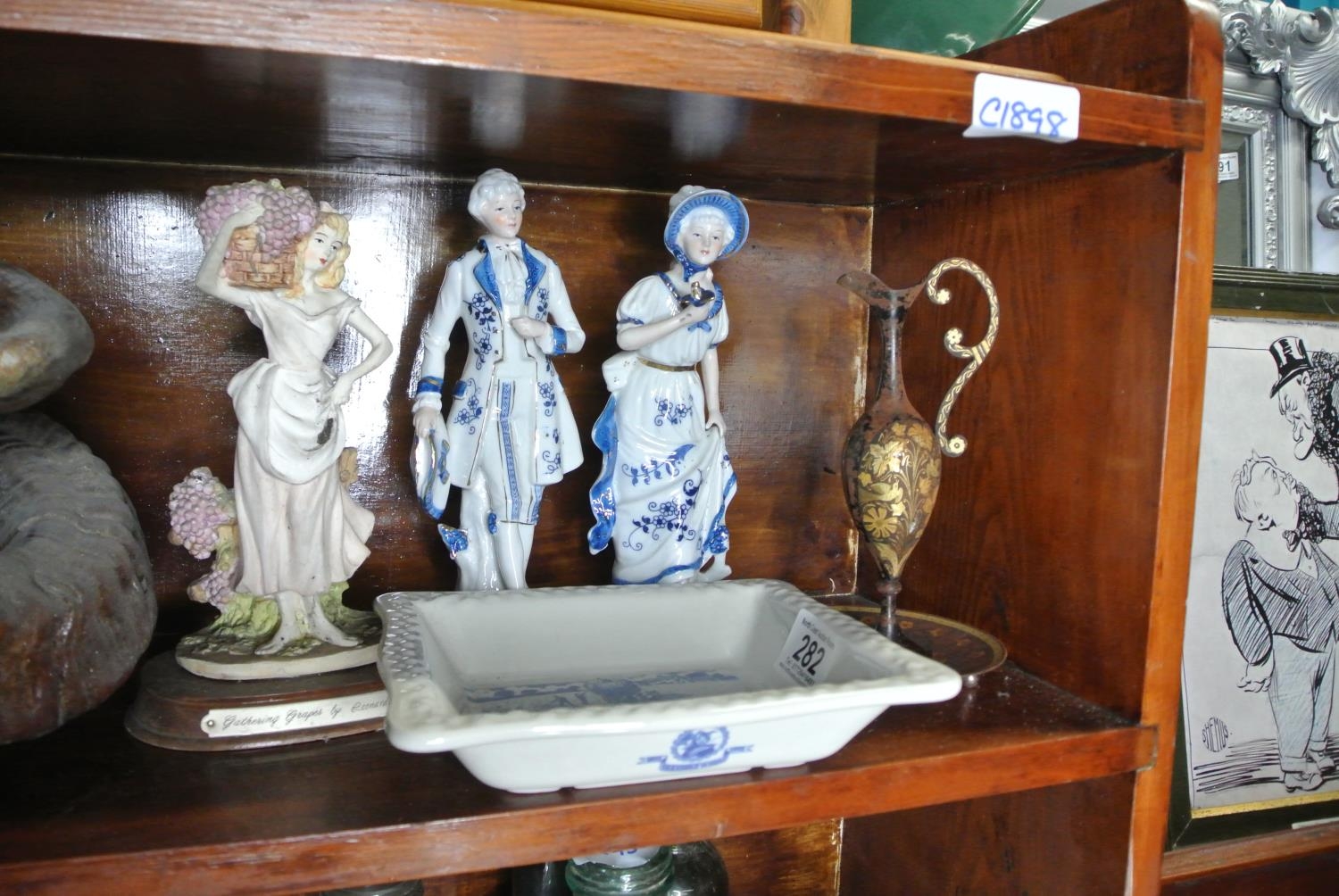 Three antique style ceramic figures, a 'Shredded Wheat' bowl and a miniature jug.