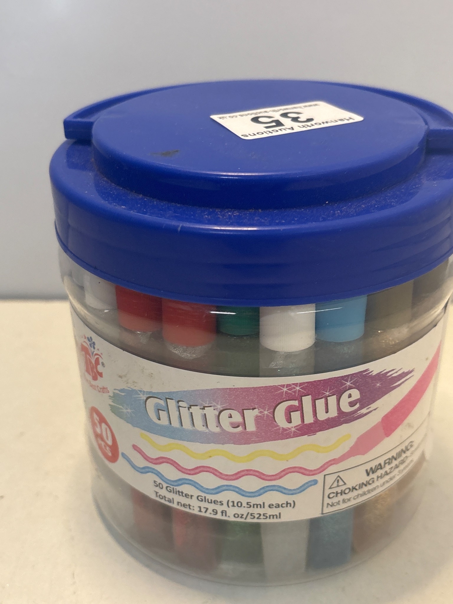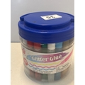 50 pieces of glitter glue in assorted colors, 10.5 ml each, in a plastic container.