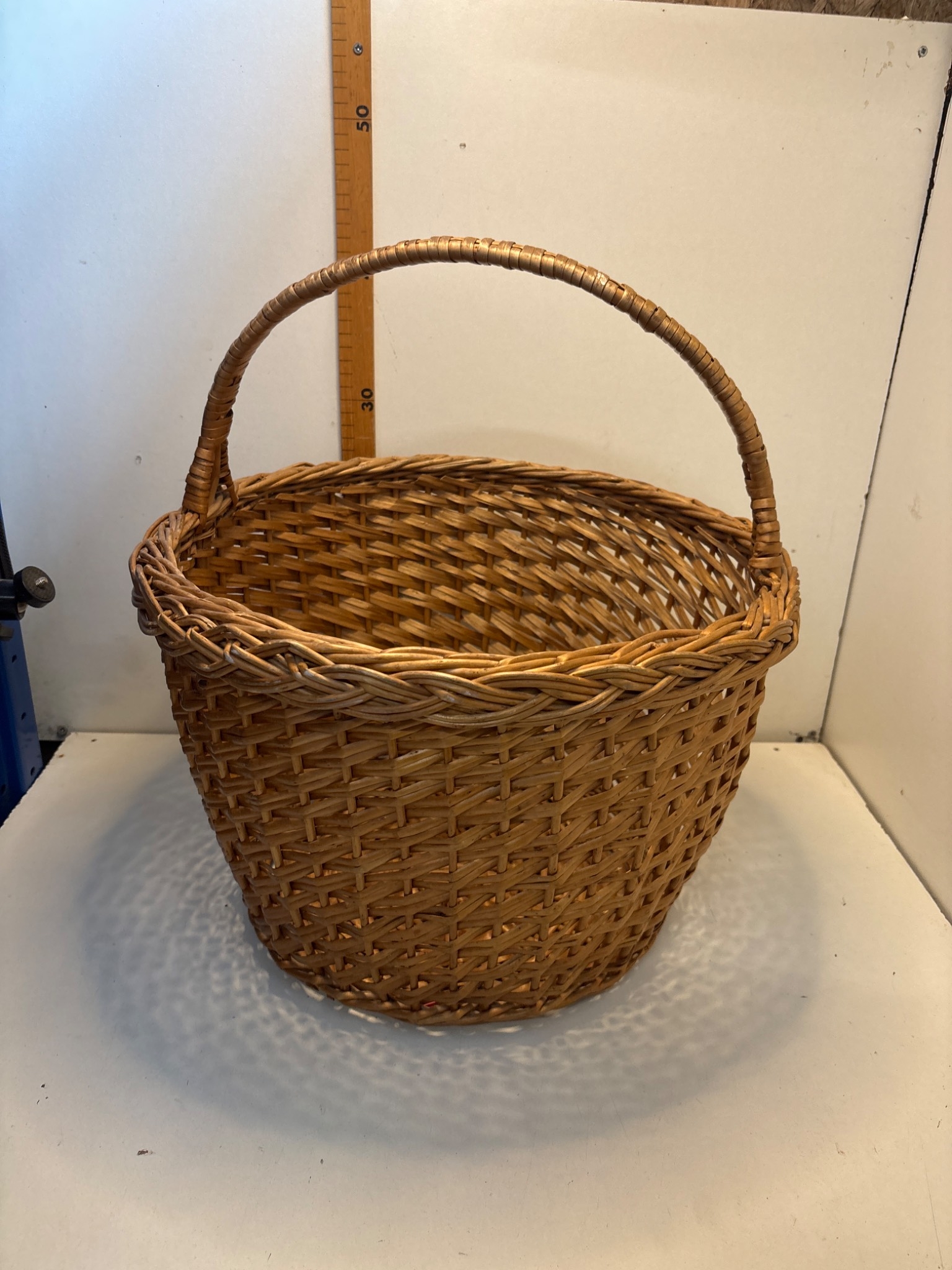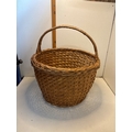 Handwoven wicker basket with a single handle, featuring a natural finish and circular opening.