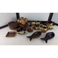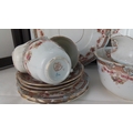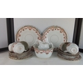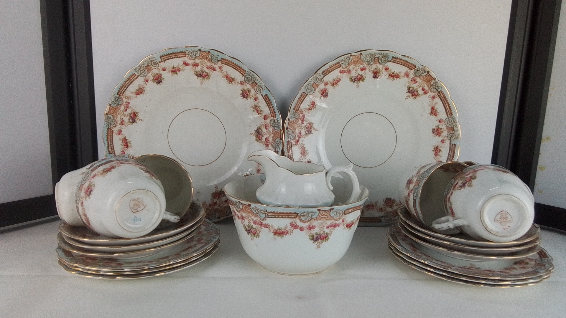 An early Grafton bone china tea wares, including two large serving plates, a sucrier/bowl, milk jug, cups and matching saucers and side plates, each with gilt rims and floral garland borders.