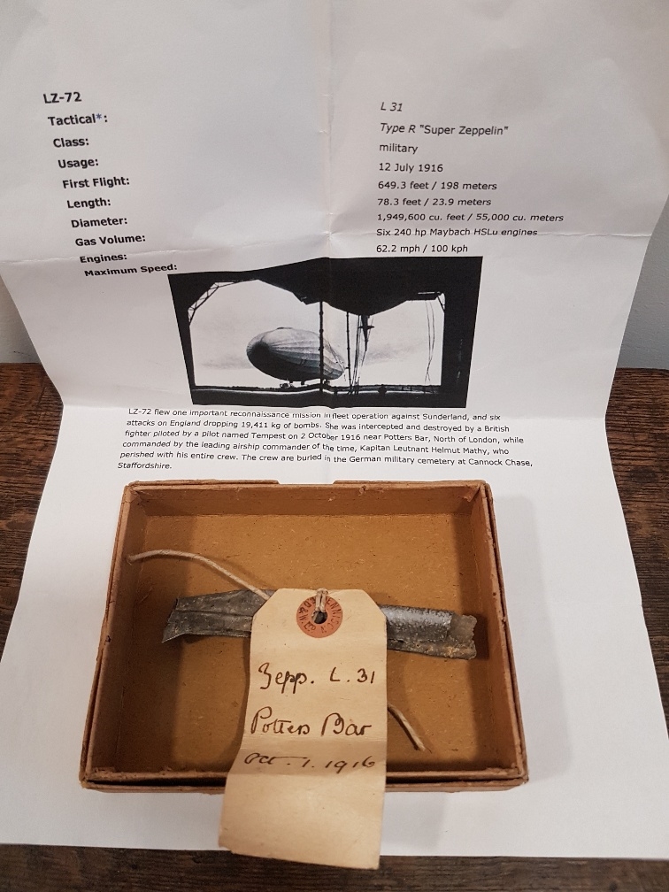 A fragment of The LZ-72 Type R "Super Zeppelin" airship which was shot down by a British fighter on 2nd October 1916 near Potters Bar. Captained at the time by Kapitan Leutnant Helmut Mathy, who perished with his entire crew. The crew are buried in the Germany military cemetary at Cannock Chase, Staffordshire.