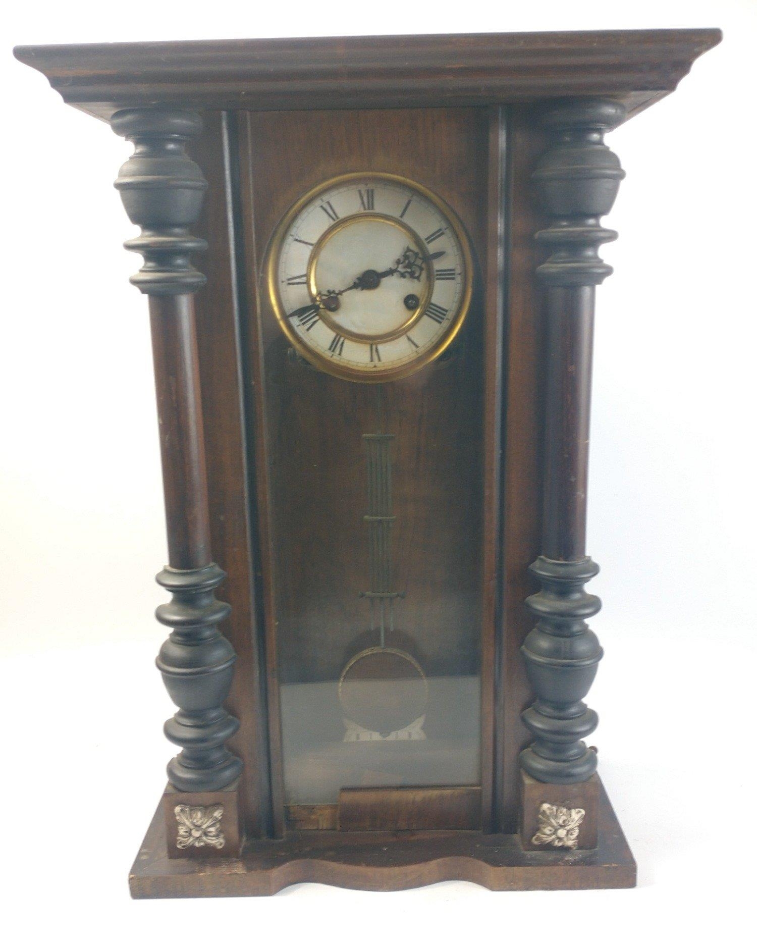 A large wooden pendulum wall clock measuring 57cm high. Complete with pendulum but no key. Seems to be ticking. Once graced the walls of the TRAQUAIR ARMS HOTEL in INNERLEITHEN.