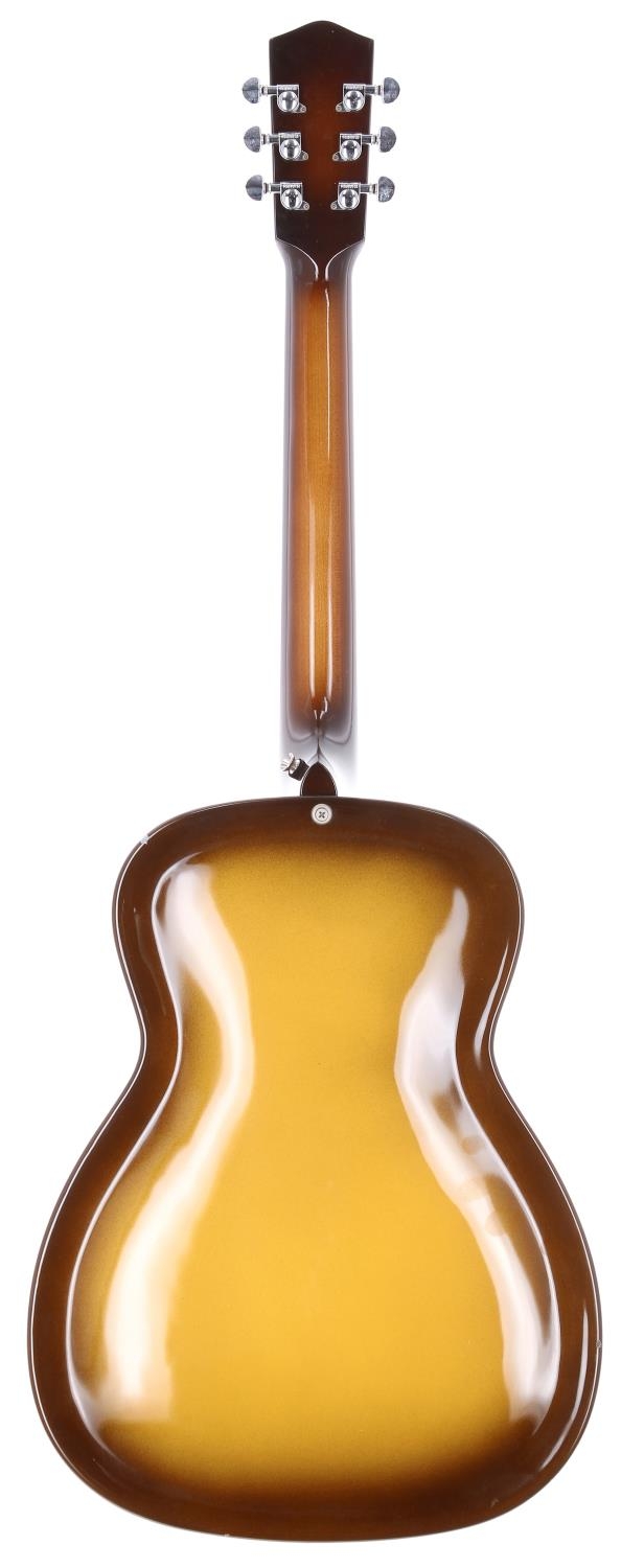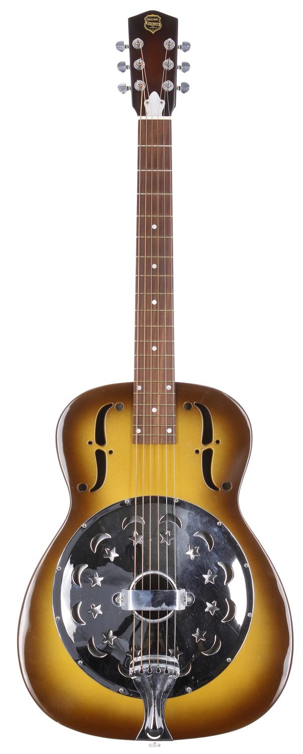 1995 Dobro Duolian Moon and Stars single cone resonator guitar, made in USA; Body: two-tone burst finish, minor chips to edges; Neck: sunburst finish maple; Fretboard: rosewood; Frets: light tarnishing; Hardware: good; Case: original hard case; Overall condition: good