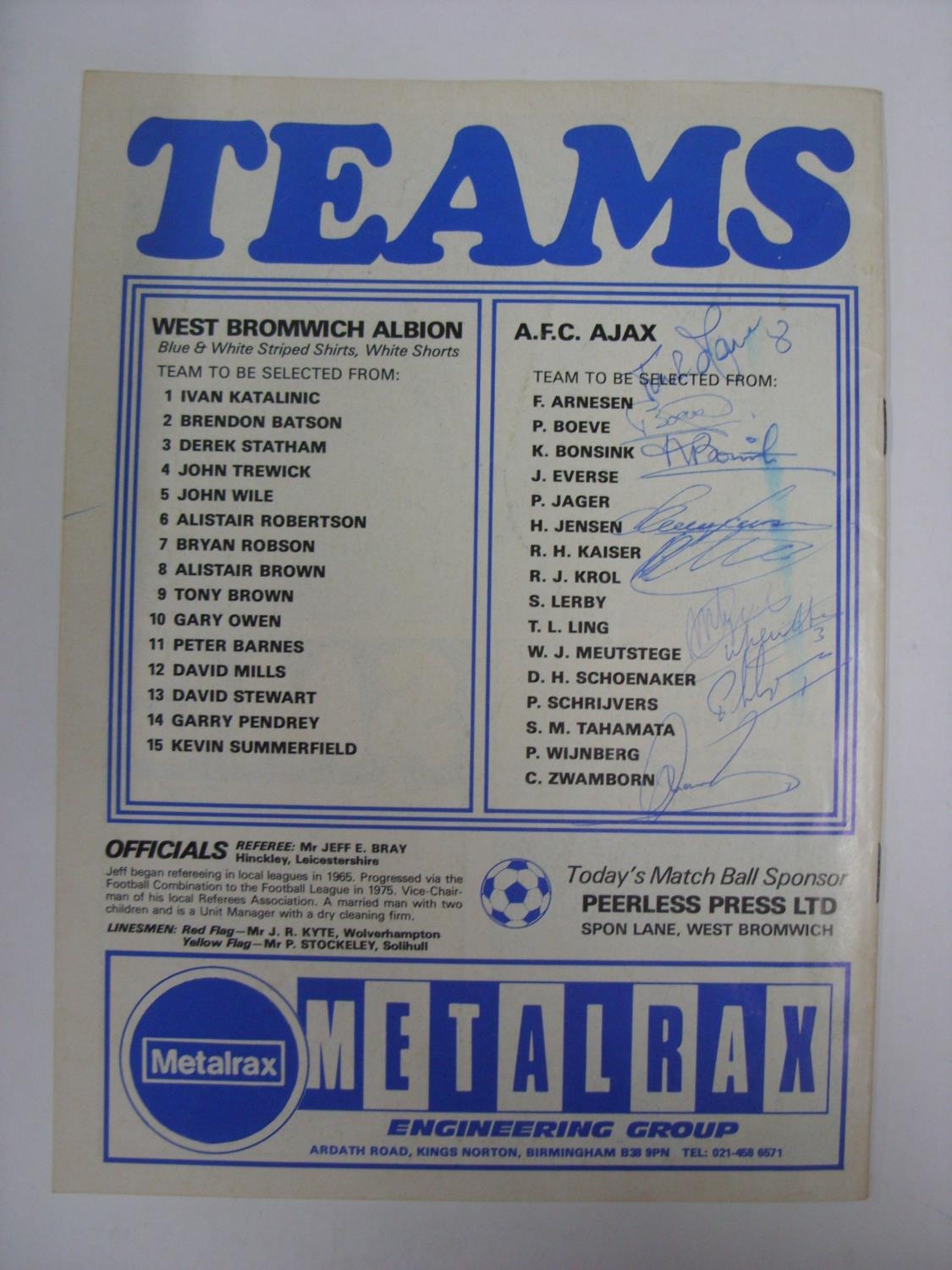 AUTOGRAPHED PROGRAMME, 1979/1980, West Bromwich Albion v Ajax, a Football Programme for the fixture played 11/08/1979, the programme is Hand Signed by 9 Ajax players, Signatures to Include F Arnesen, P Boeve, K Bonsink, WJ Meutstege, P Schrijvers etc. Estimate: £10/£12 - Opening Bid: £8