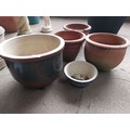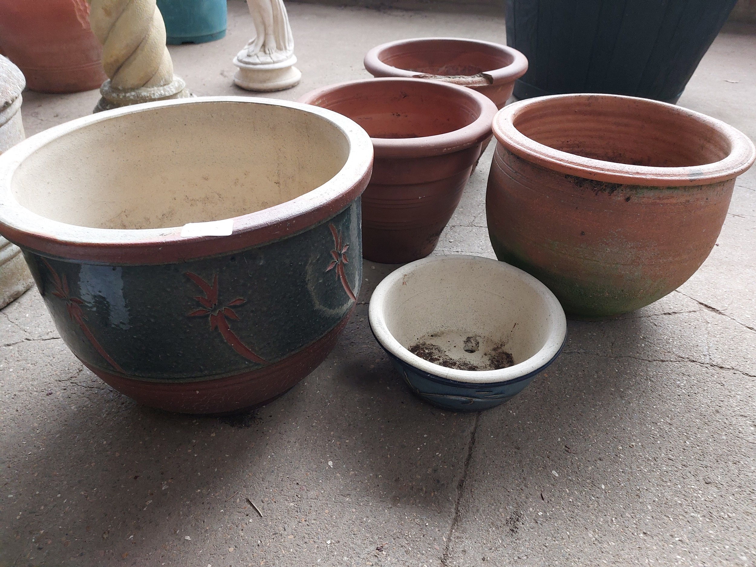 Five garden pots, 3 being terracotta, the largest pot measuring 29cm x 38cm diameter.
