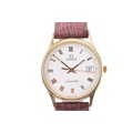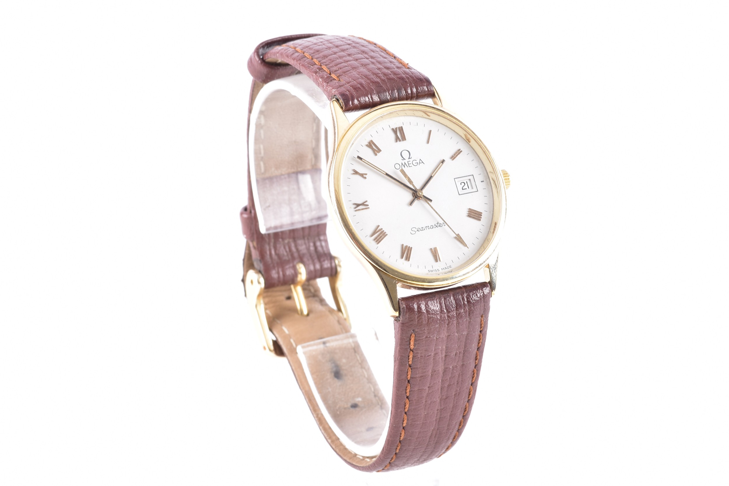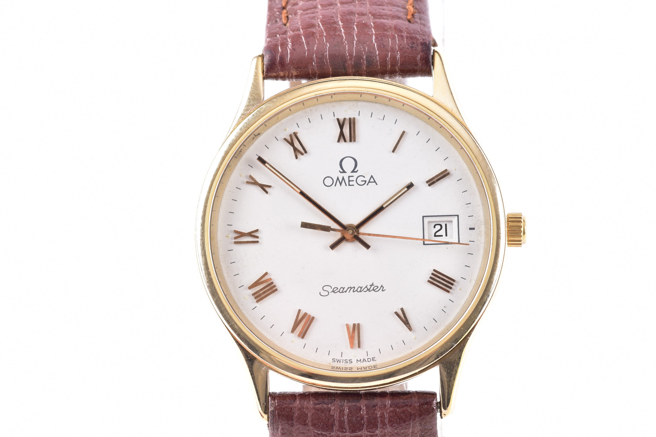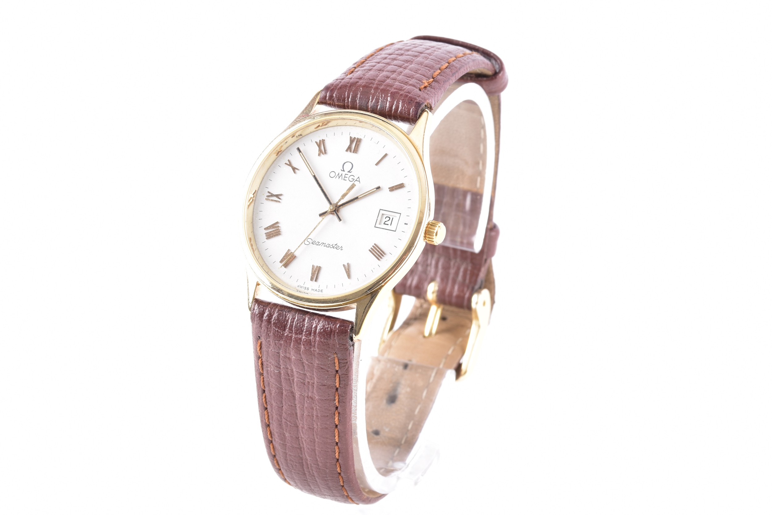 An Omega Seamaster 9ct gold quartz wristwatch, cal.1458, the white dial with Roman numeral indices, date aperture, case size 30 mm, on a brown leather strap, accompanied by original receipts and booklet.