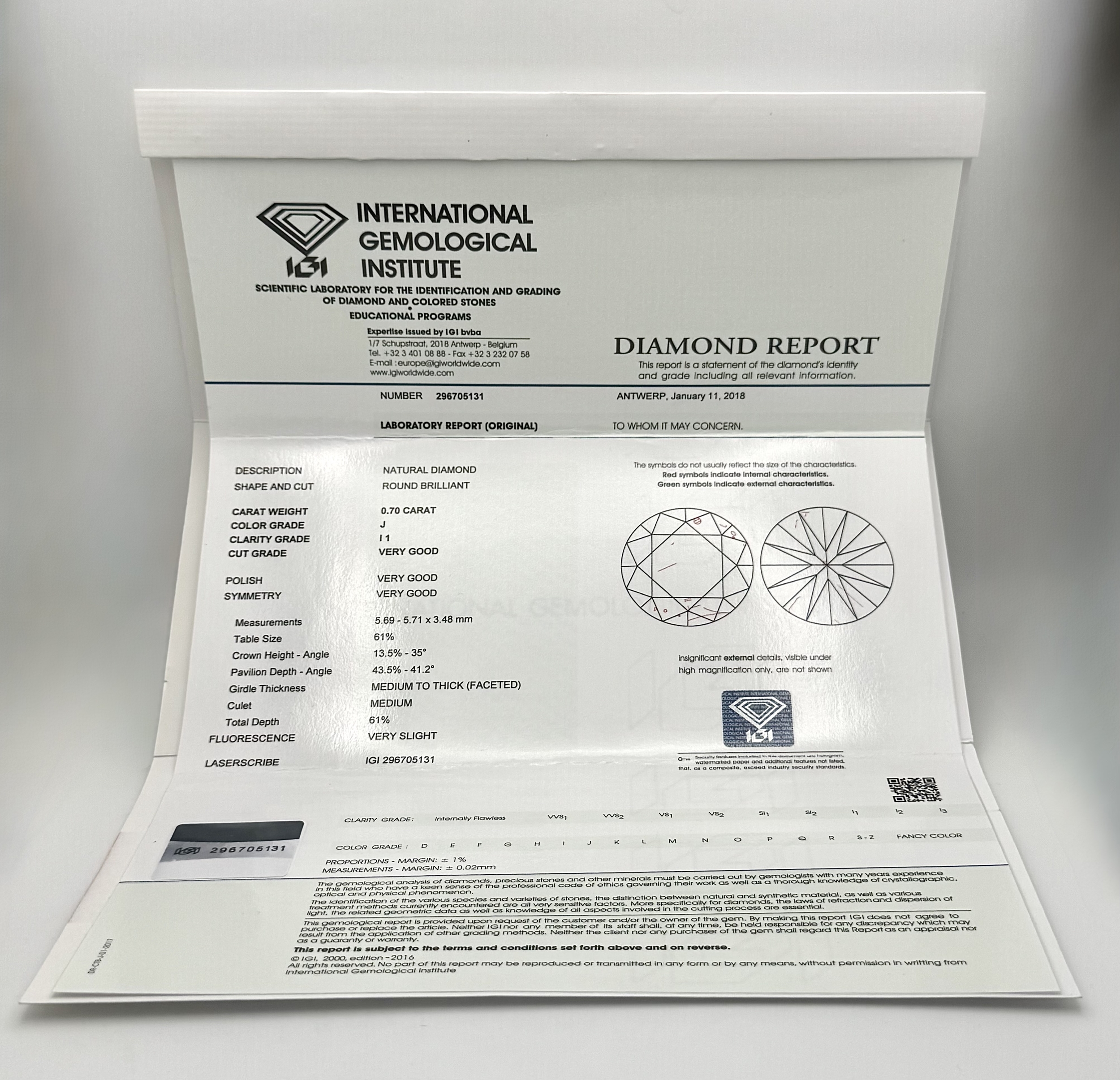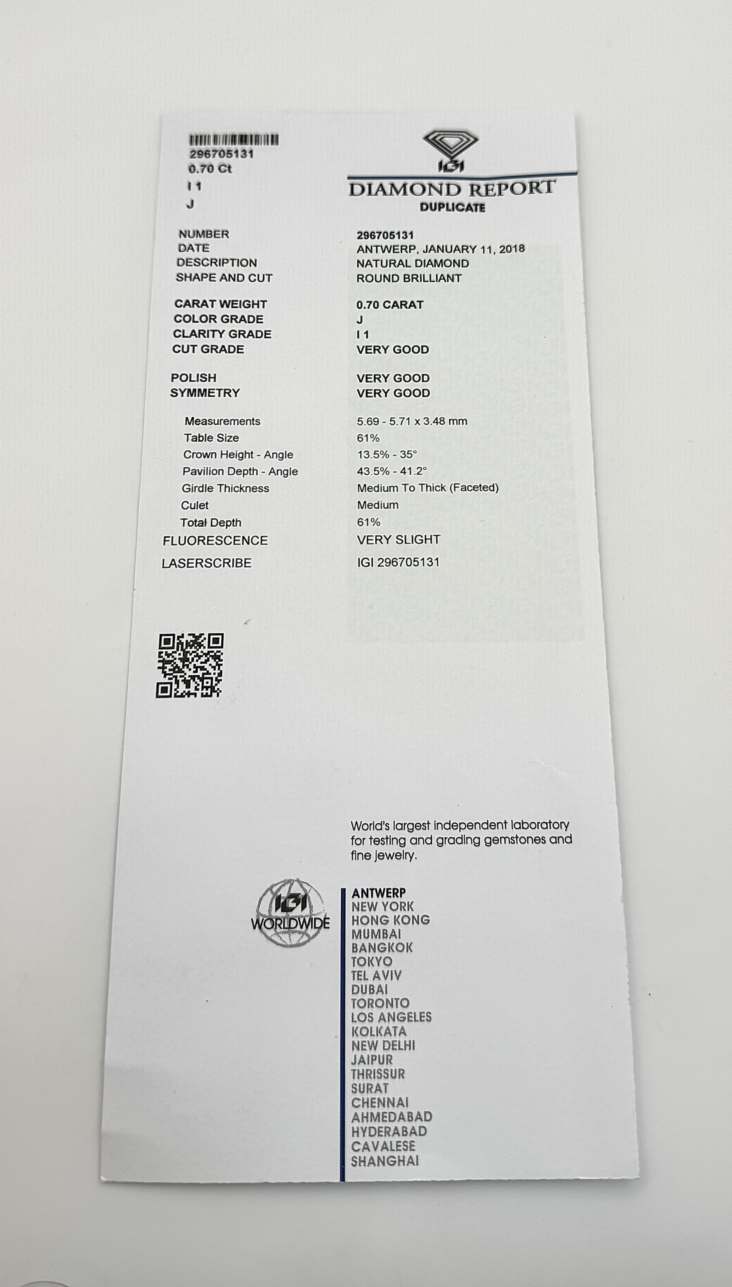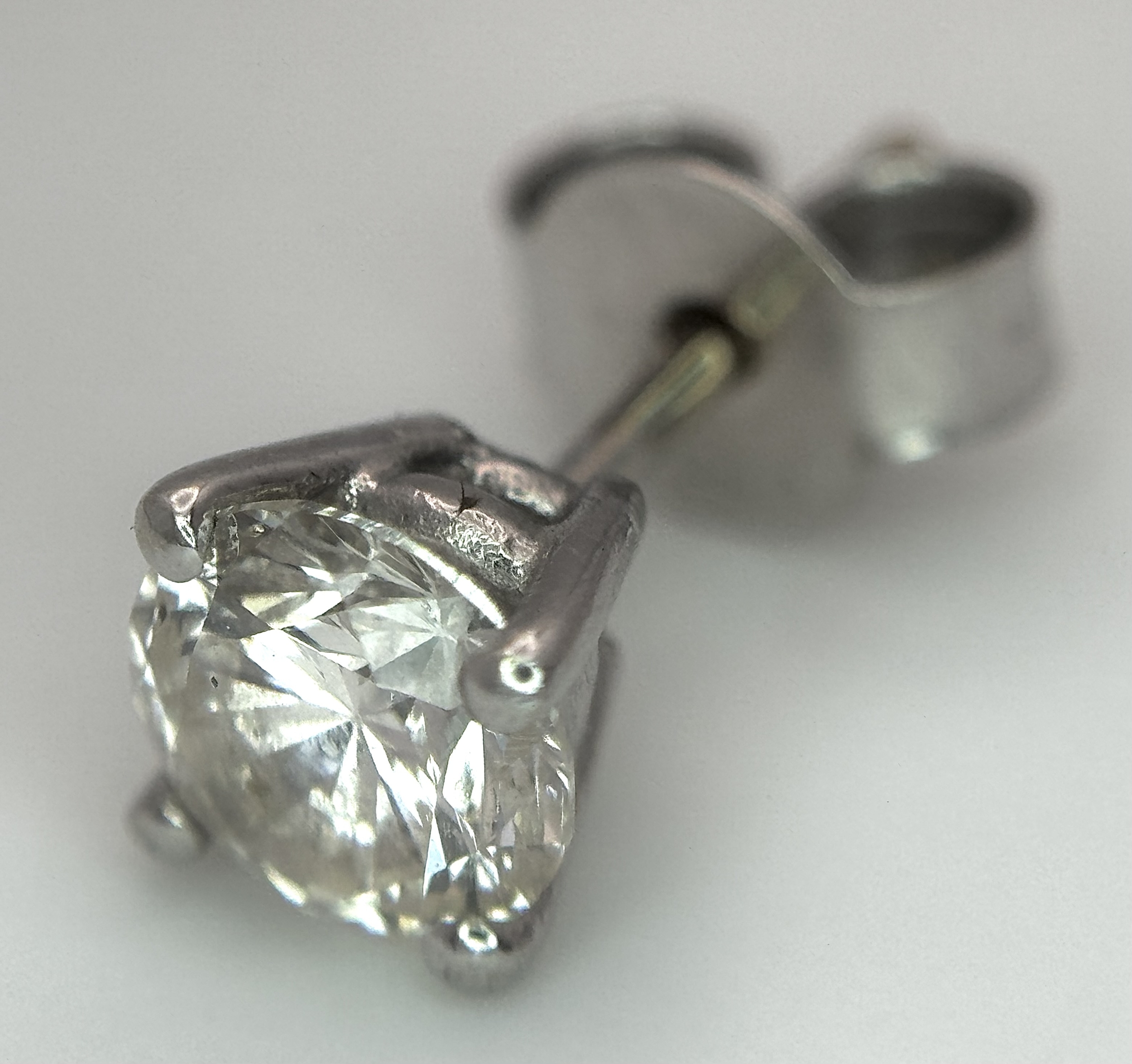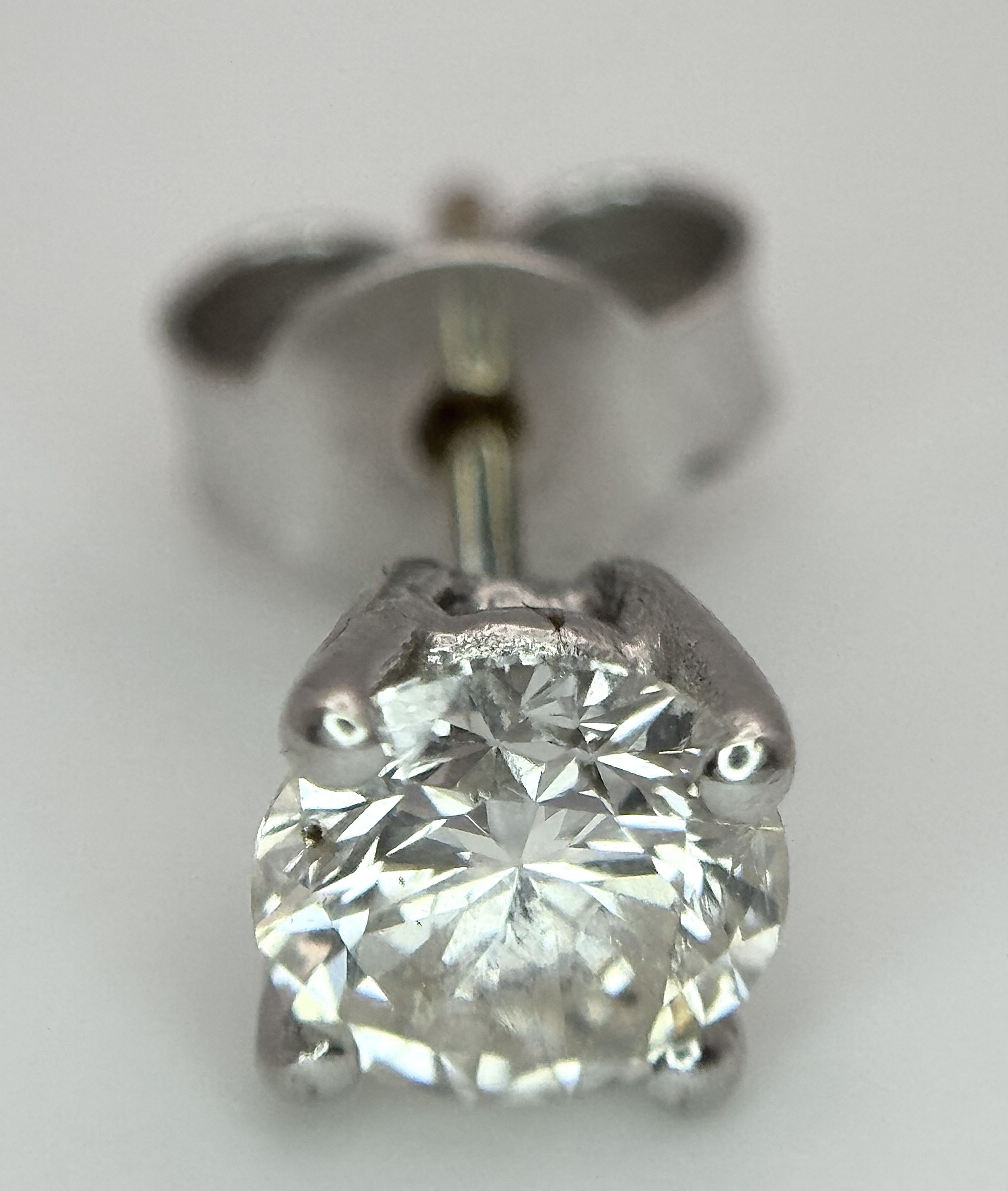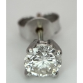 A Single 18K White Gold Diamond Stud Earring. 0.70ct round brilliant cut having J colour and I1 clarity. 0.84g total weight. Comes with a IGI certificate. Ref: 27627.