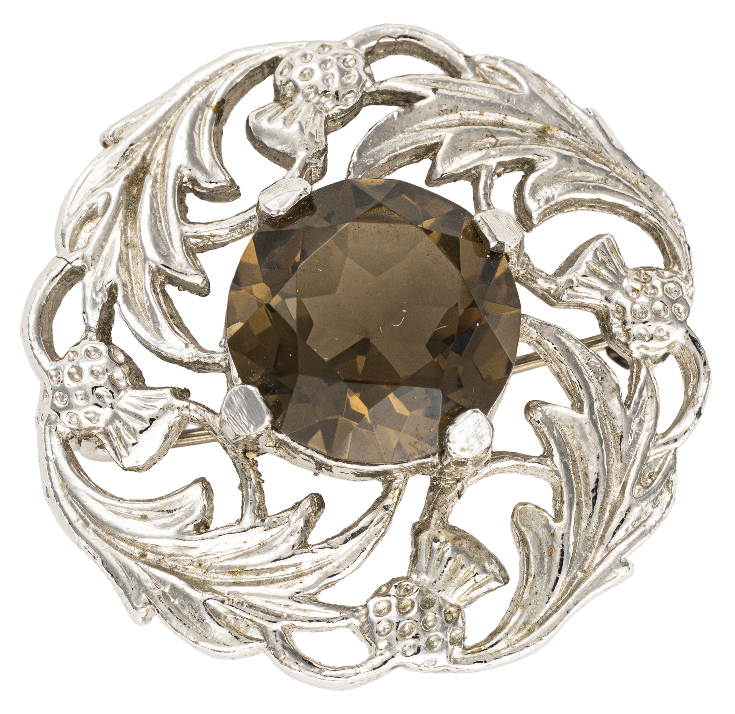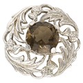 Claw set to the centre, the round brilliant cut smoky quartz topaz, weighing approximately 8 carats, in a white metal brooch, 4,5cm long