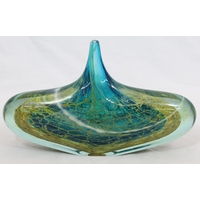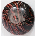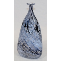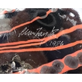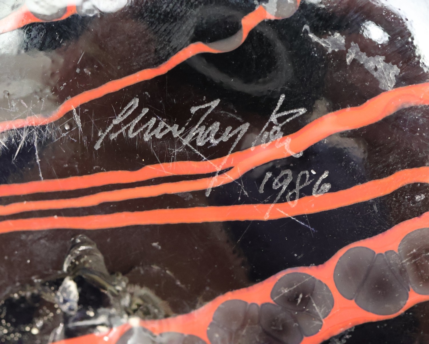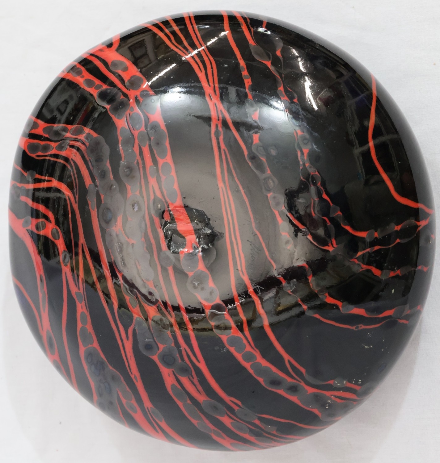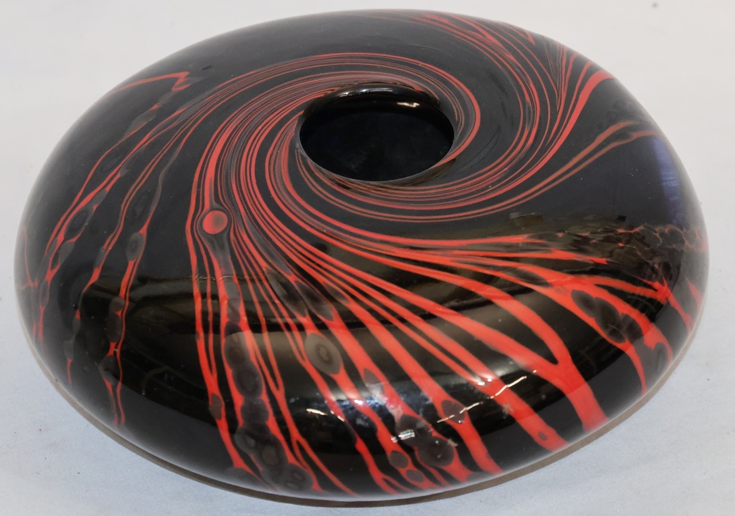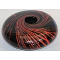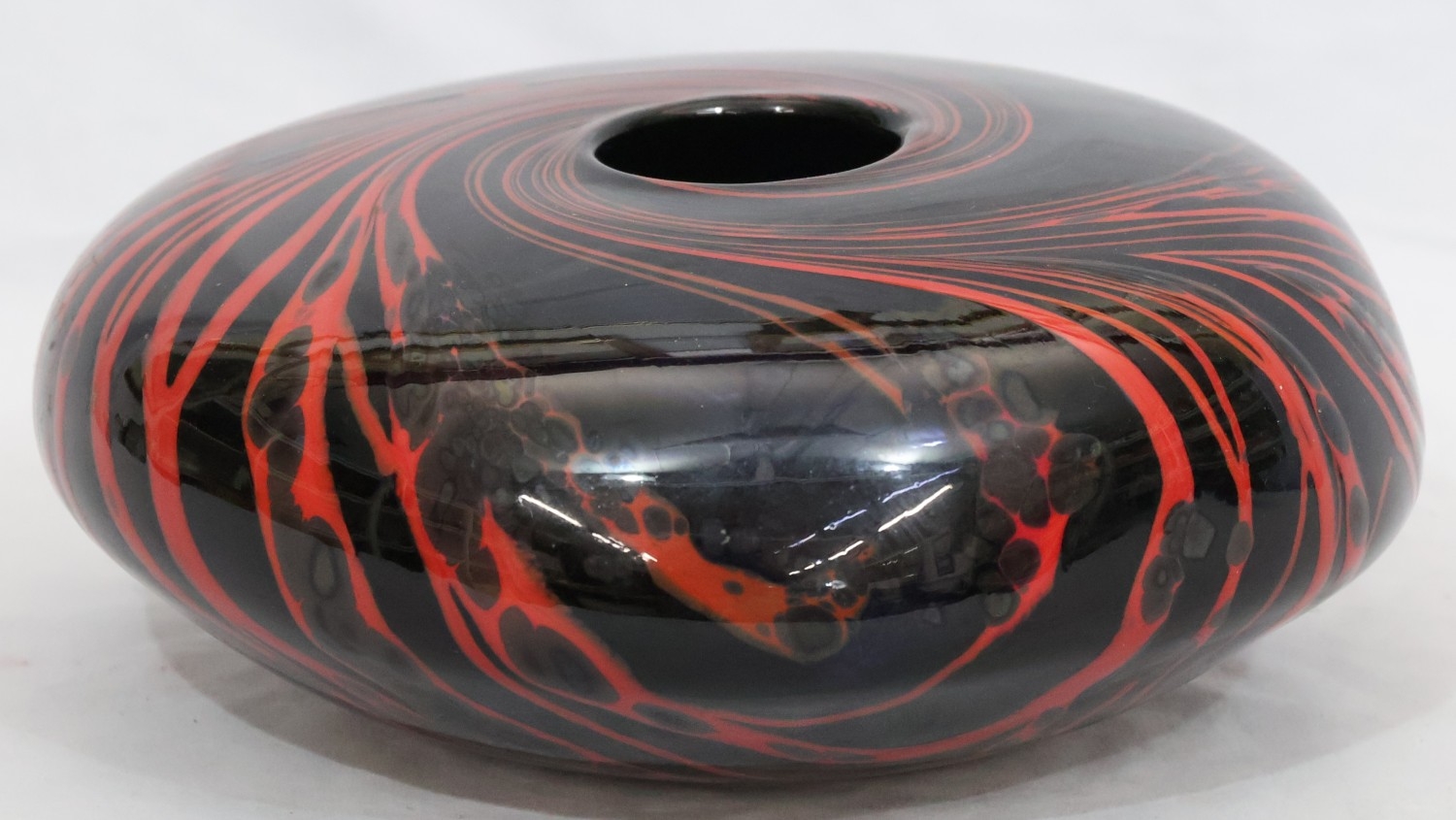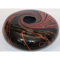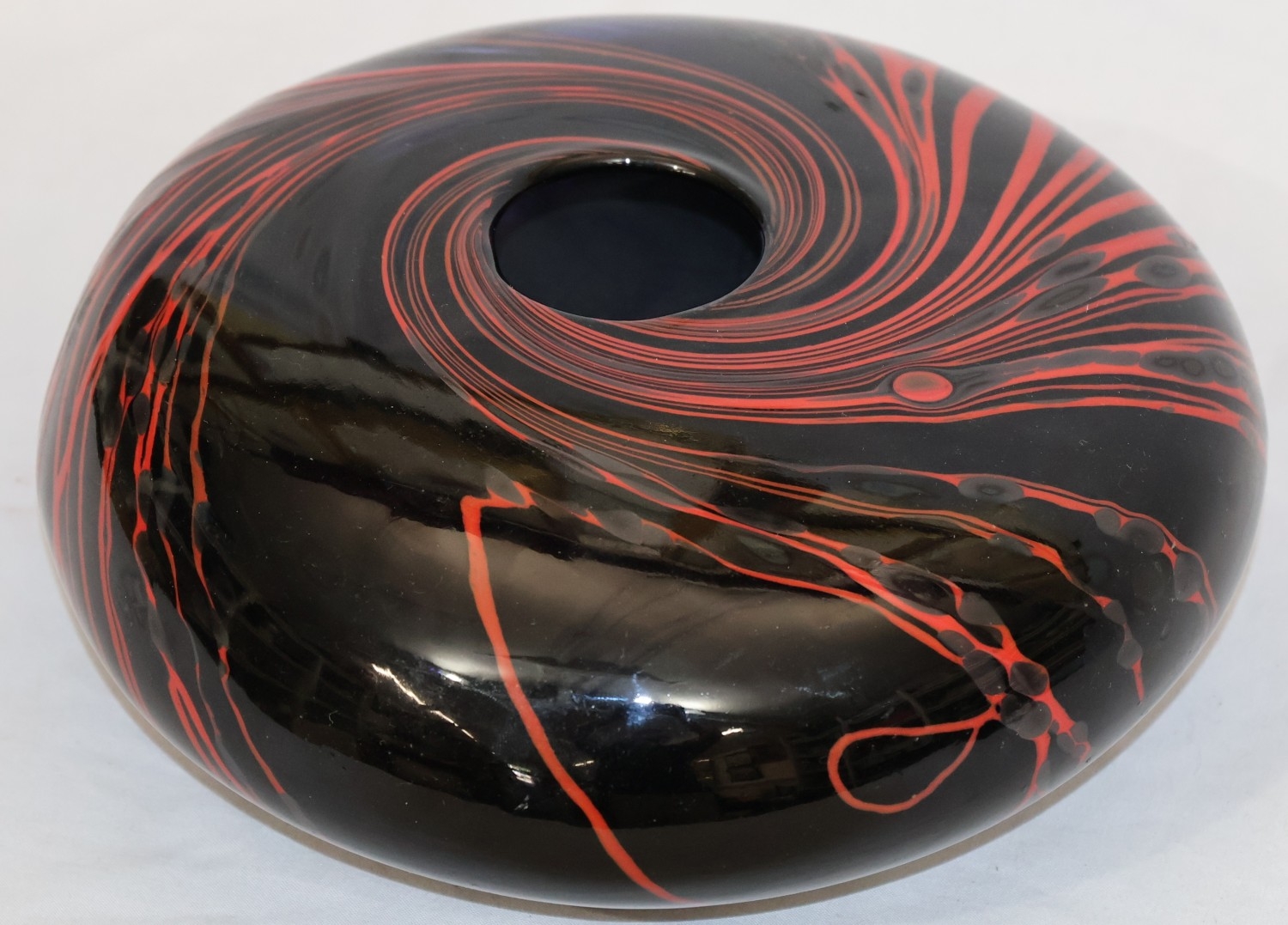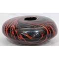 Peter Layton (B.1937) contemporary Art glass round bulbous squat vase on black ground with red swirl decoration, signed to base and dated 1986, 23cm diameter, 9.5cm high