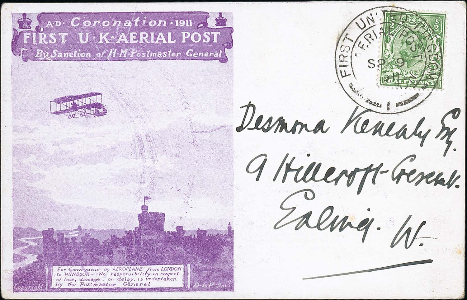 1911 (Sep 9) Violet London to Windsor privilege mail postcard, a KGV ½d tied by the London Aerial Post c.d.s code "1". Sent by S. Kenealy, who writes "The first aerial postcard sent with letters from the King + Queen of England ..... the hard work to ensure the success of the scheme was done by your father who sends this card to his little son". Kenealy was the Aerial Post Secretary at P.C Burton, the official Aerial Post agents. Photo on Page 10.