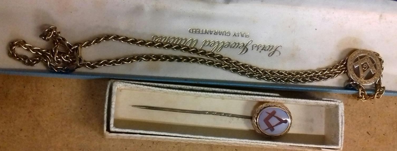 9 ct gold hallmarked masonic pendant on thick 20" chain - 20.9 gm & unstamped masonic tie pin
