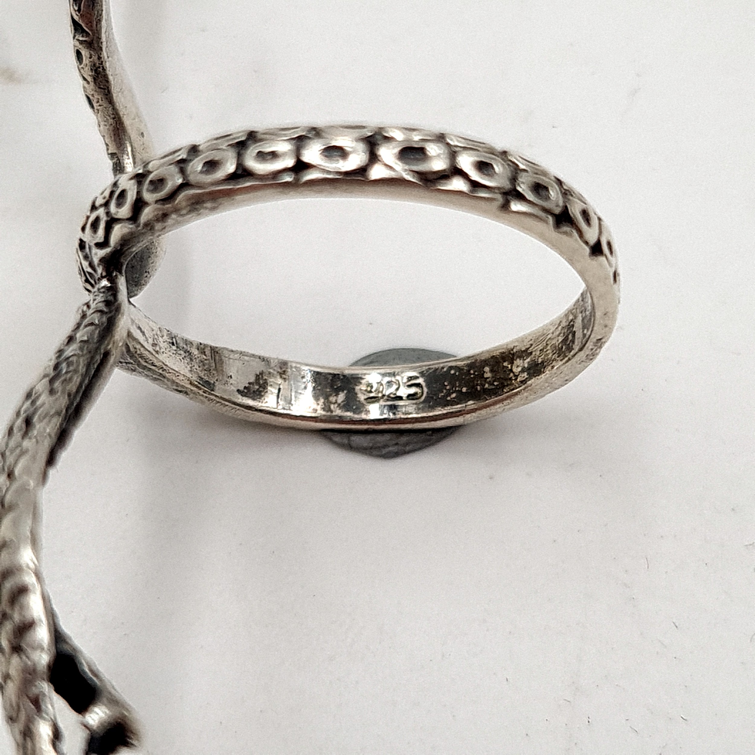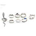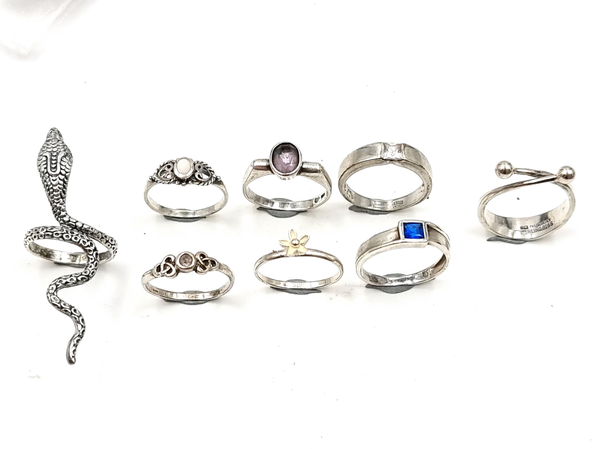 A great dealers lot, which comprising of eight sterling silver rings. This includes examples with gem stone detail. Ring sizes range from M to R. Total weight of rings: 21.10 grams.