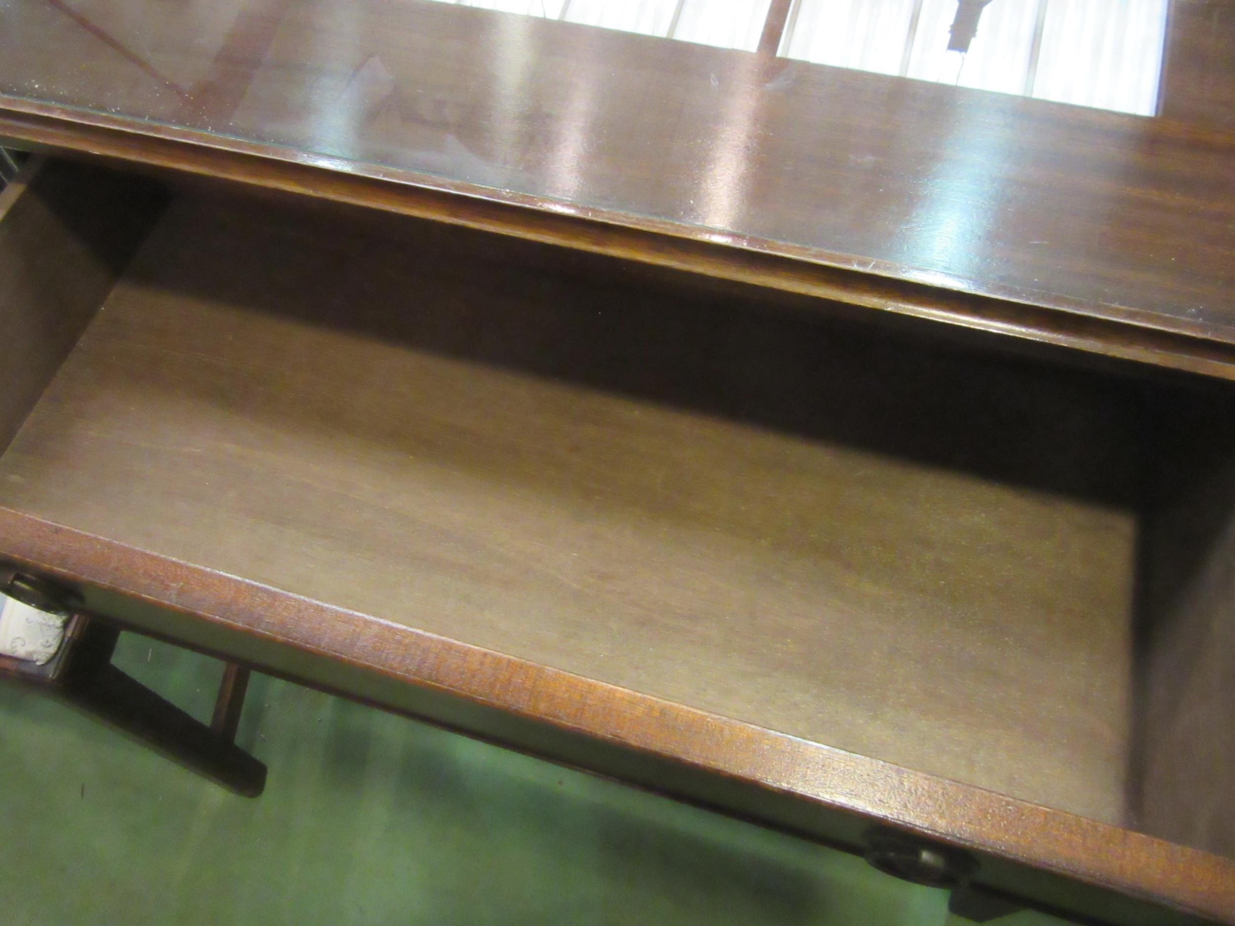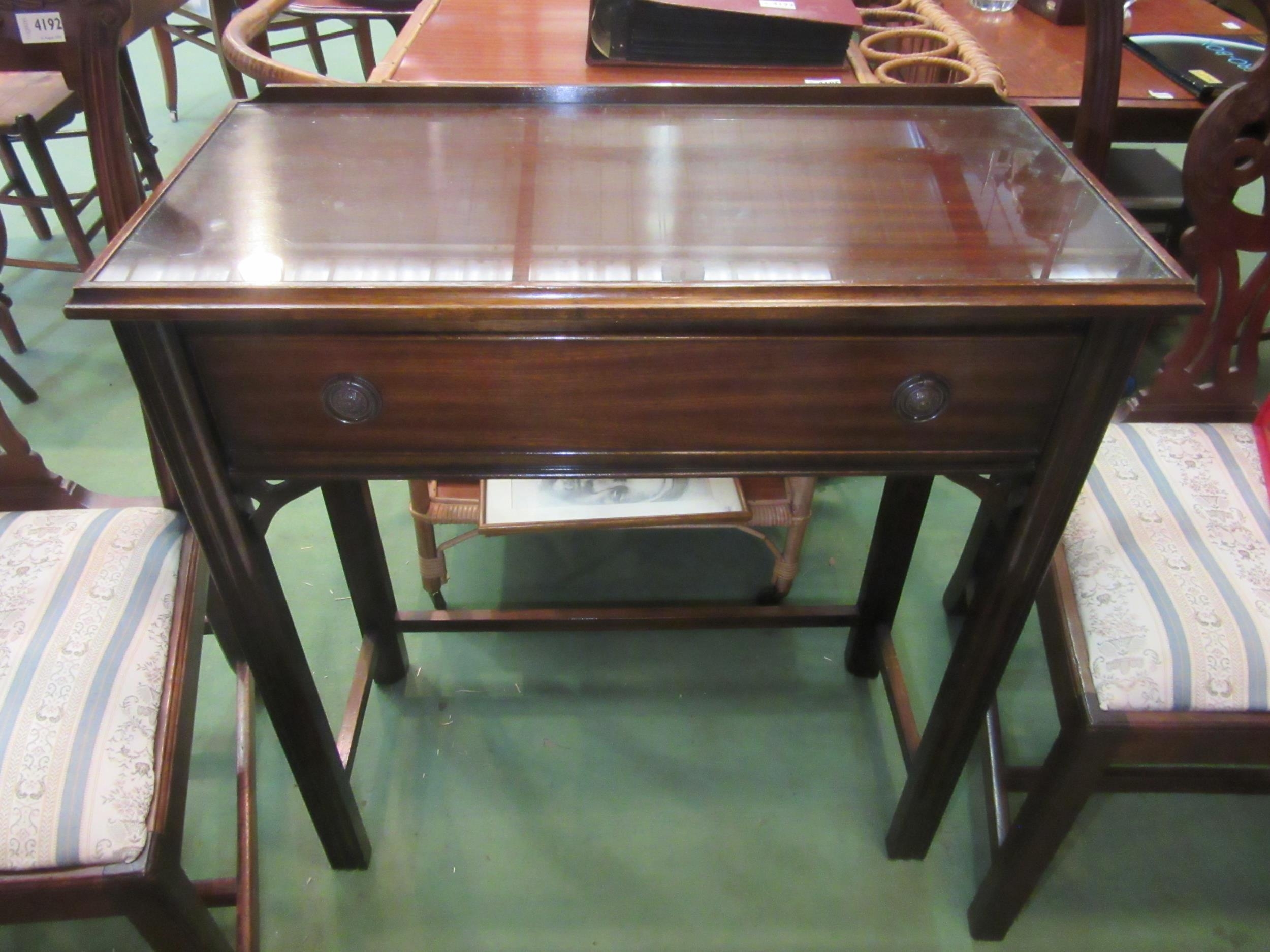 A reproduction mahogany side table in the Georgian style, single drawer, brass ring handles, reeded supports joined by a stretcher, 82cm tall x 76cm wide x 35.5cm deep