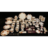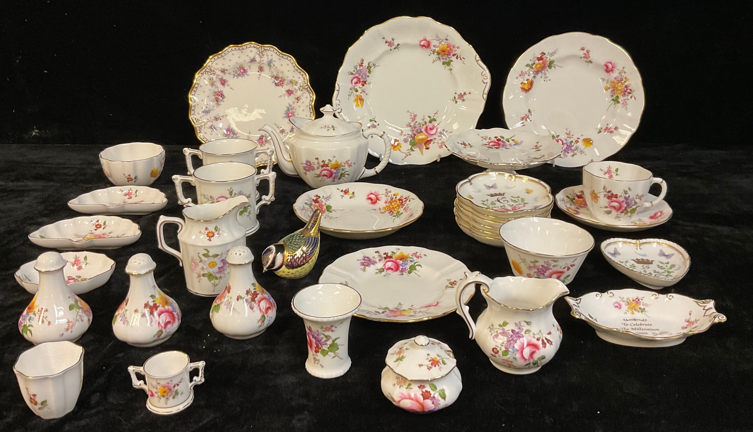 A Royal Crown Derby Posie pattern bachelor's size teapot, a pedestal comport, two milk jugs and sugar bowls, sandwich plate, teacup, saucer and tea plate, salt, pepper pots, mustard pot and cover, royal commemorative loving cup, similar miniature, royal commemorative an Millennium trinket trays, five petal trays, assorted, etc; a paperweight, Blue Tit, silver stopper; a Royal Antoinette side plate; qty