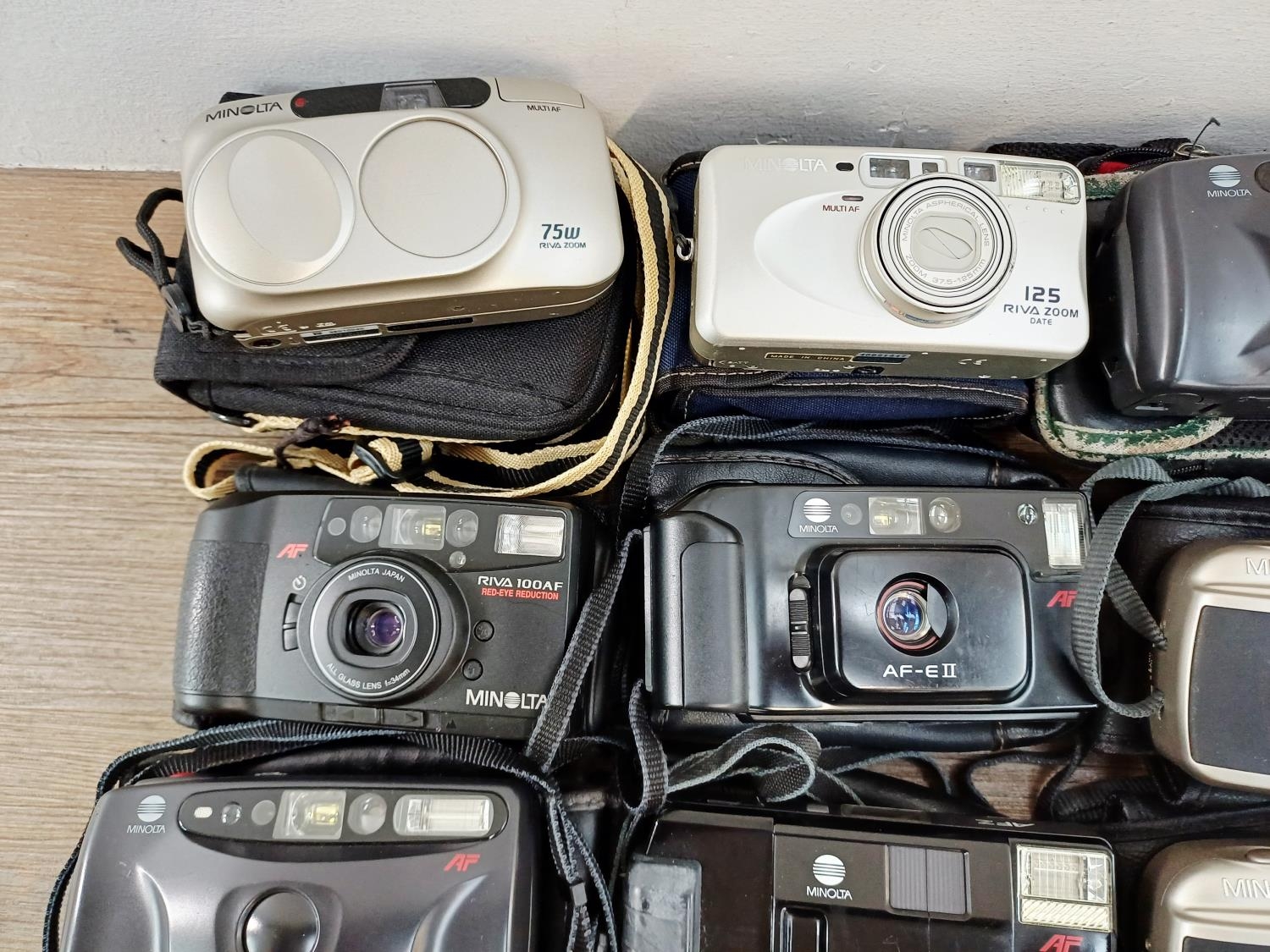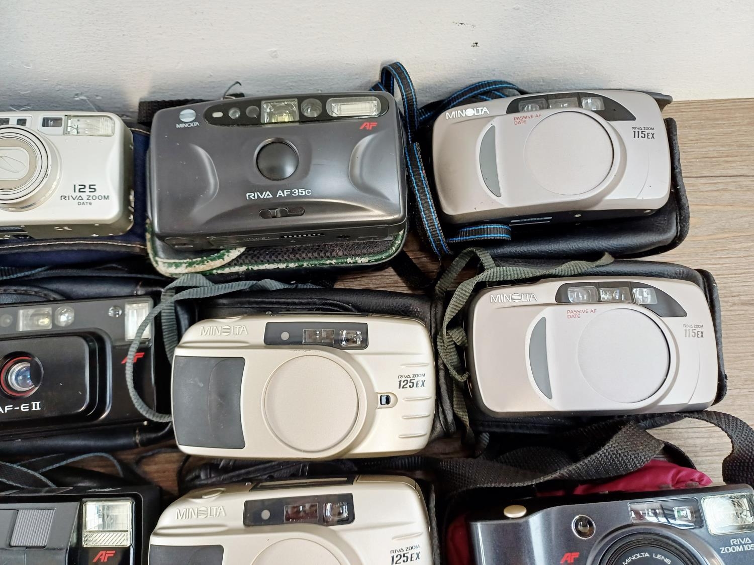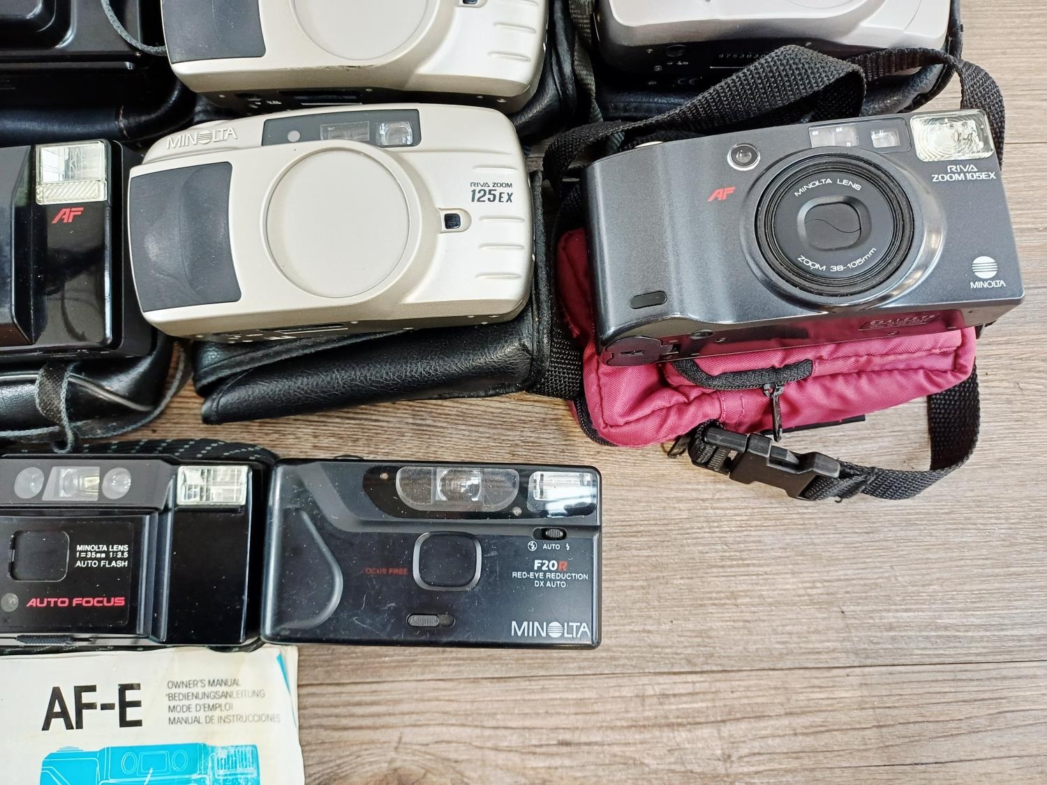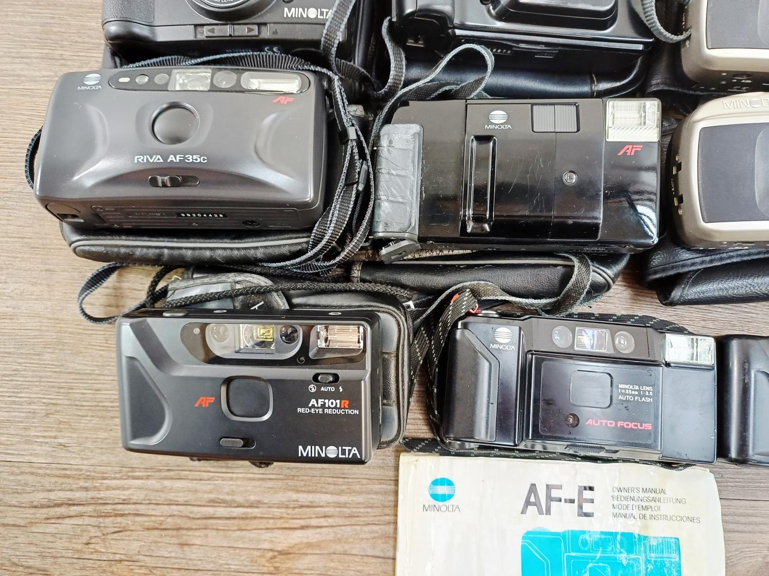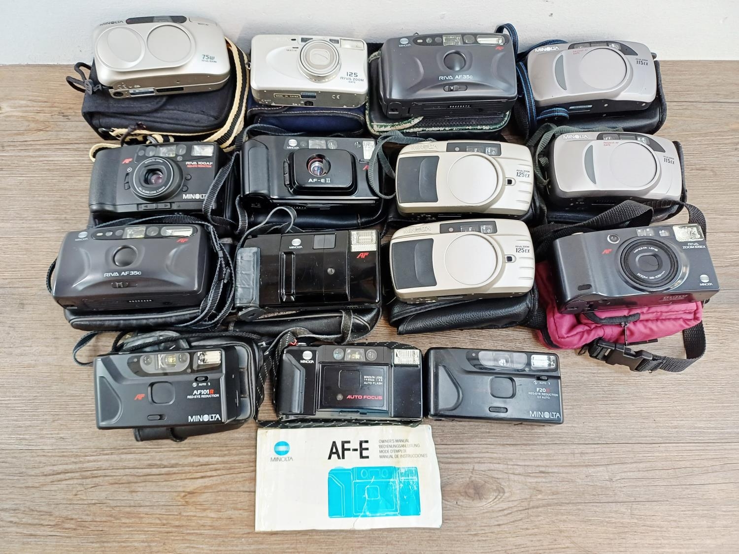 Fifteen Minolta compact 35mm cameras to include two Riva Zoom 115EX, two Riva Zoom 125EX, AF-E with instruction manual, AFZ, AF-E II, Riva Zoom 125 Date etc.