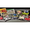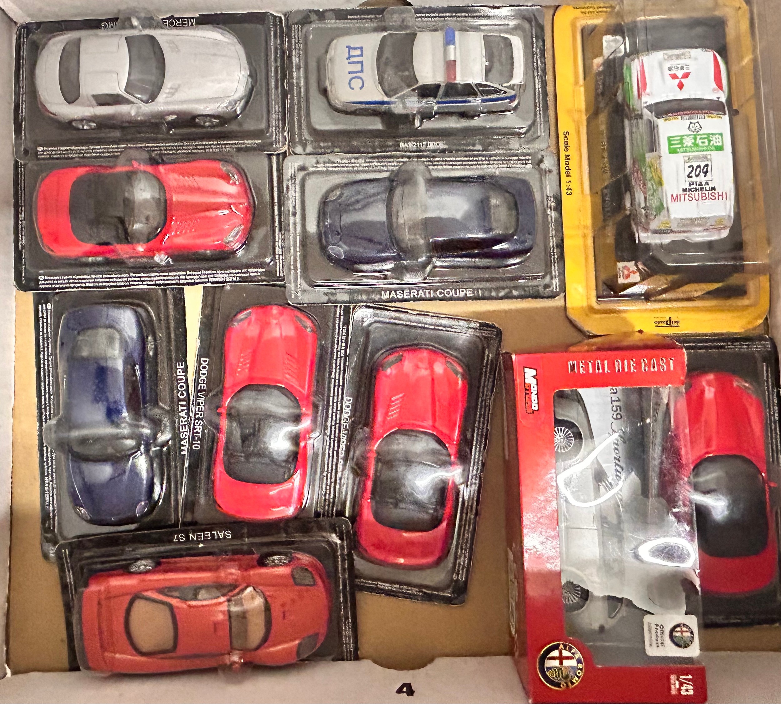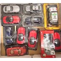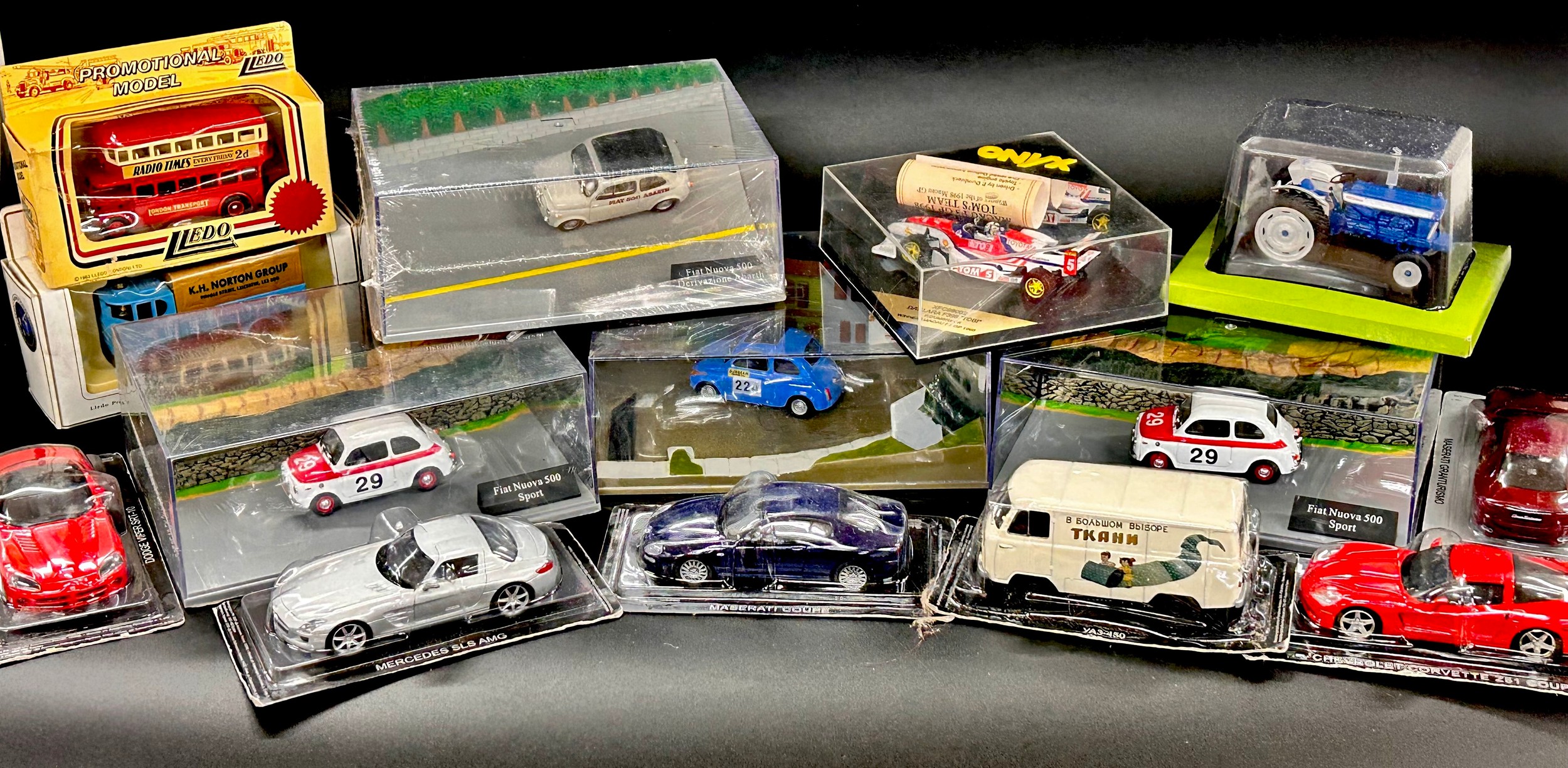 A collection of die-cast model vehicles including four Fiat 500 dioramas