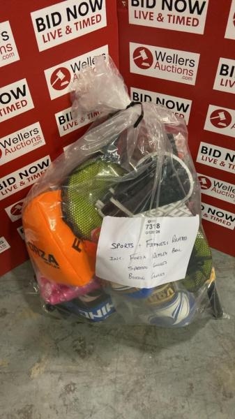 BAG OF SPORTS & FITNESS RELATED ITEMS INCL. FORZA REFLEX BALL, SPEEDO GOGGLES, BOXING GLOVES