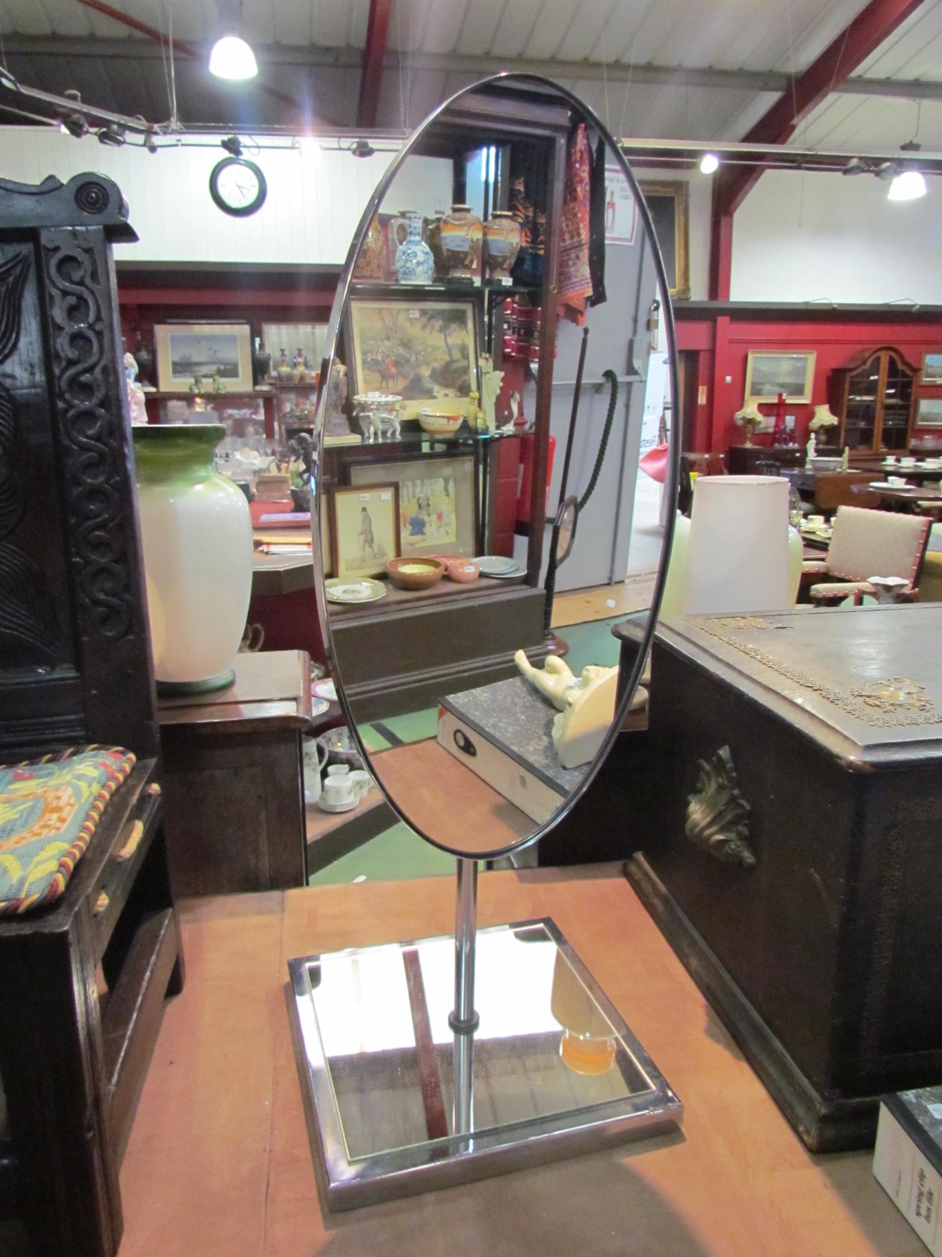 A vintage chrome tilting oval mirror on a square mirrored base, 83cm high (R) £20
