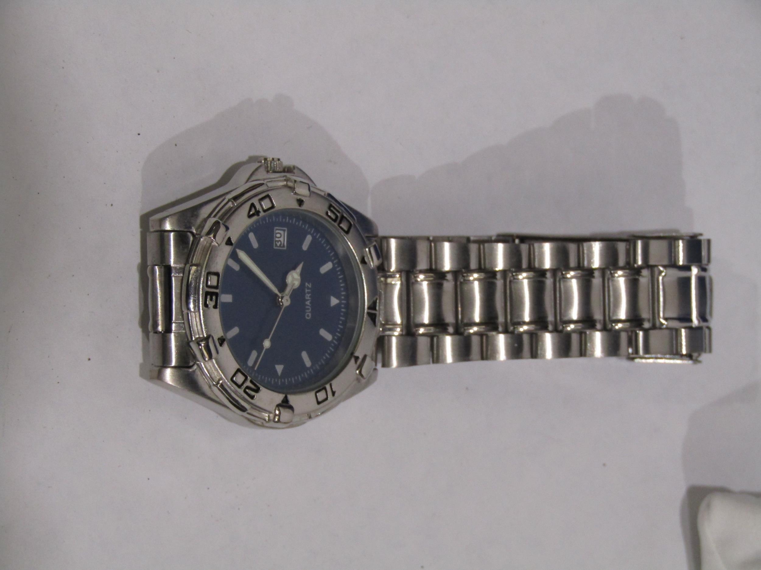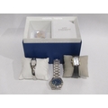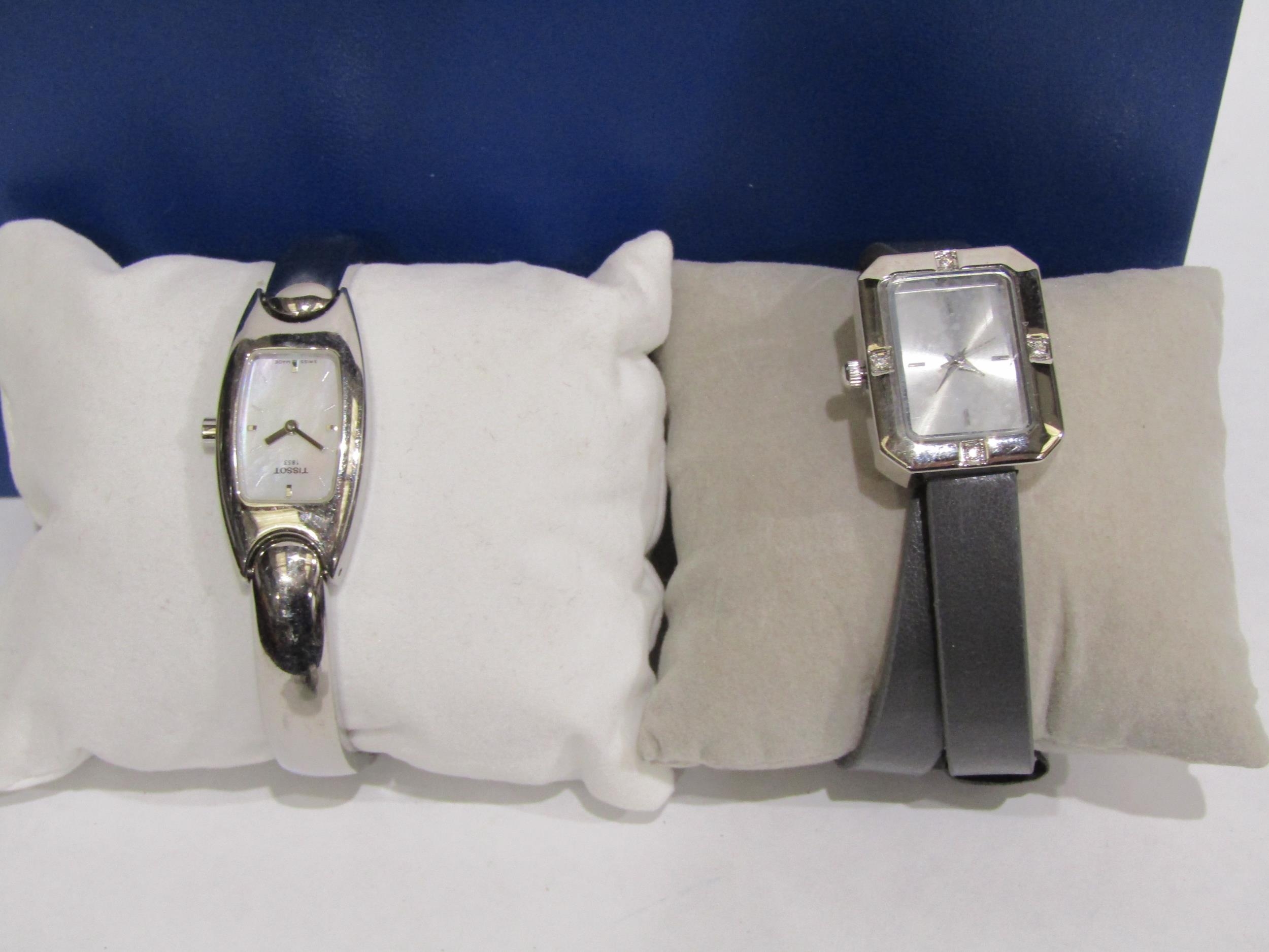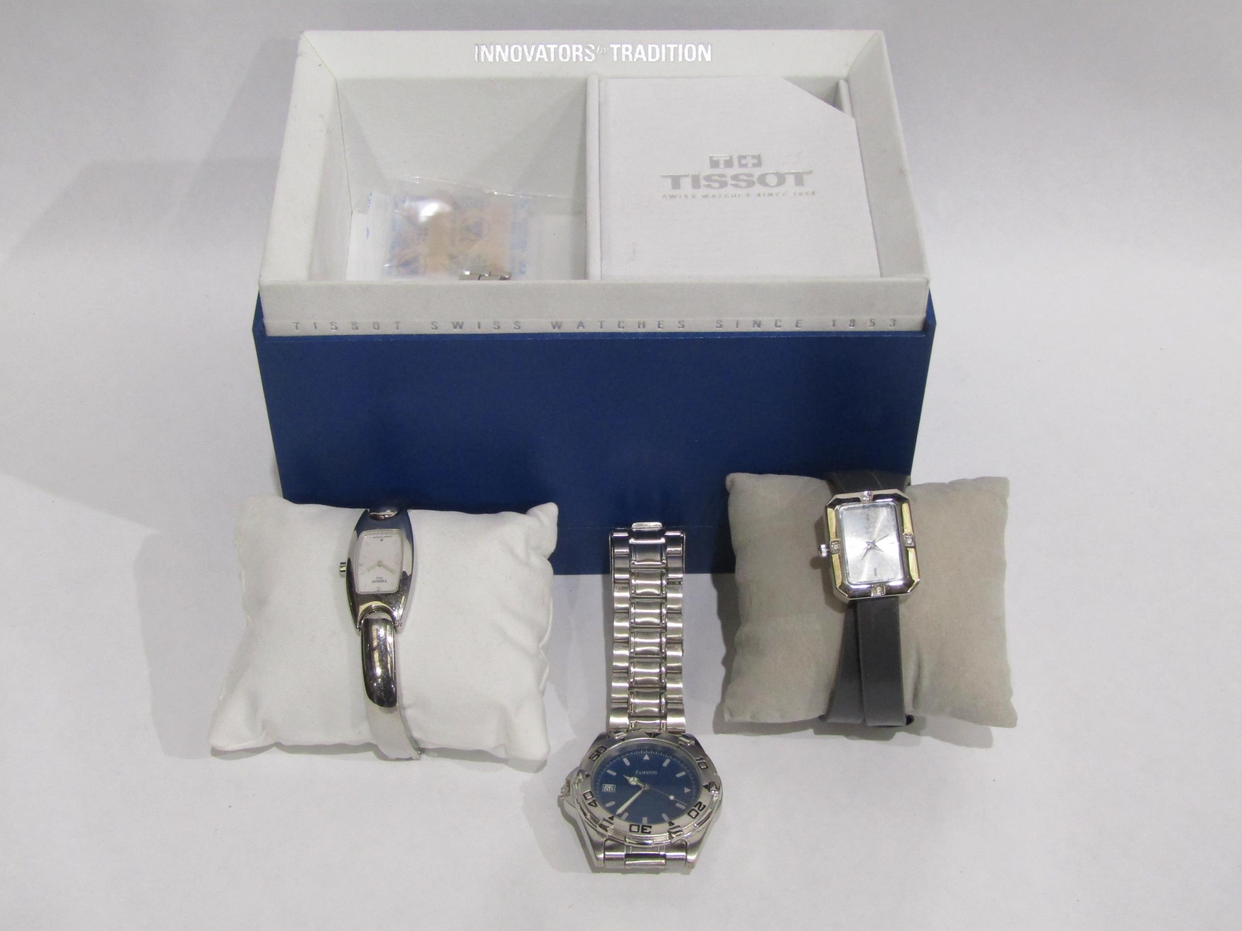 A Tissot lady's wristwatch with mother-of-pearl face, boxed with paperwork, another lady's watch and a quartz gent's watch (3)