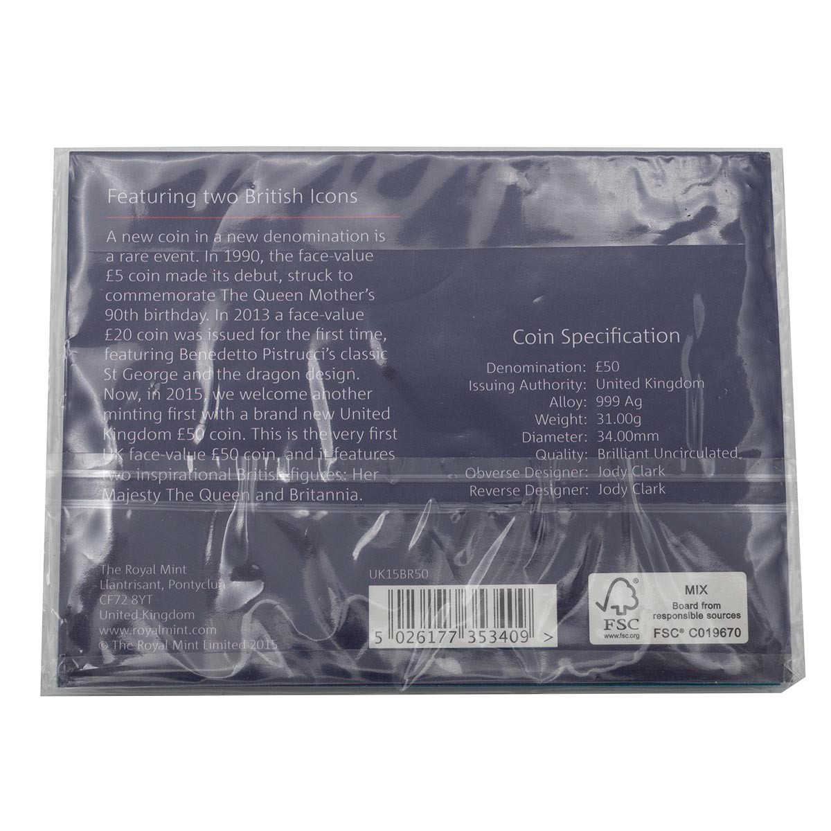 Royal Mint, a 2015 silver Britannia £50 coin, 31 grams.
