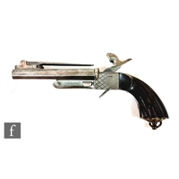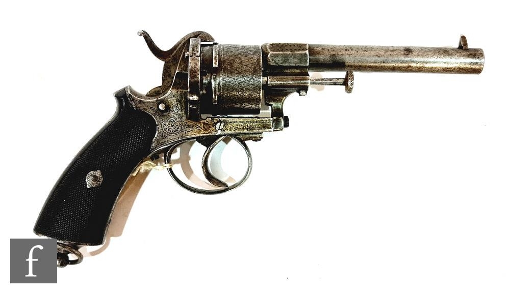 A Belgian military pin fire six shot revolver, engraved decoration, hatched ebonised butt, barrel 9cm.