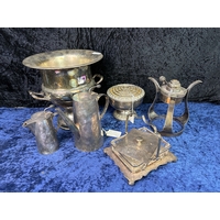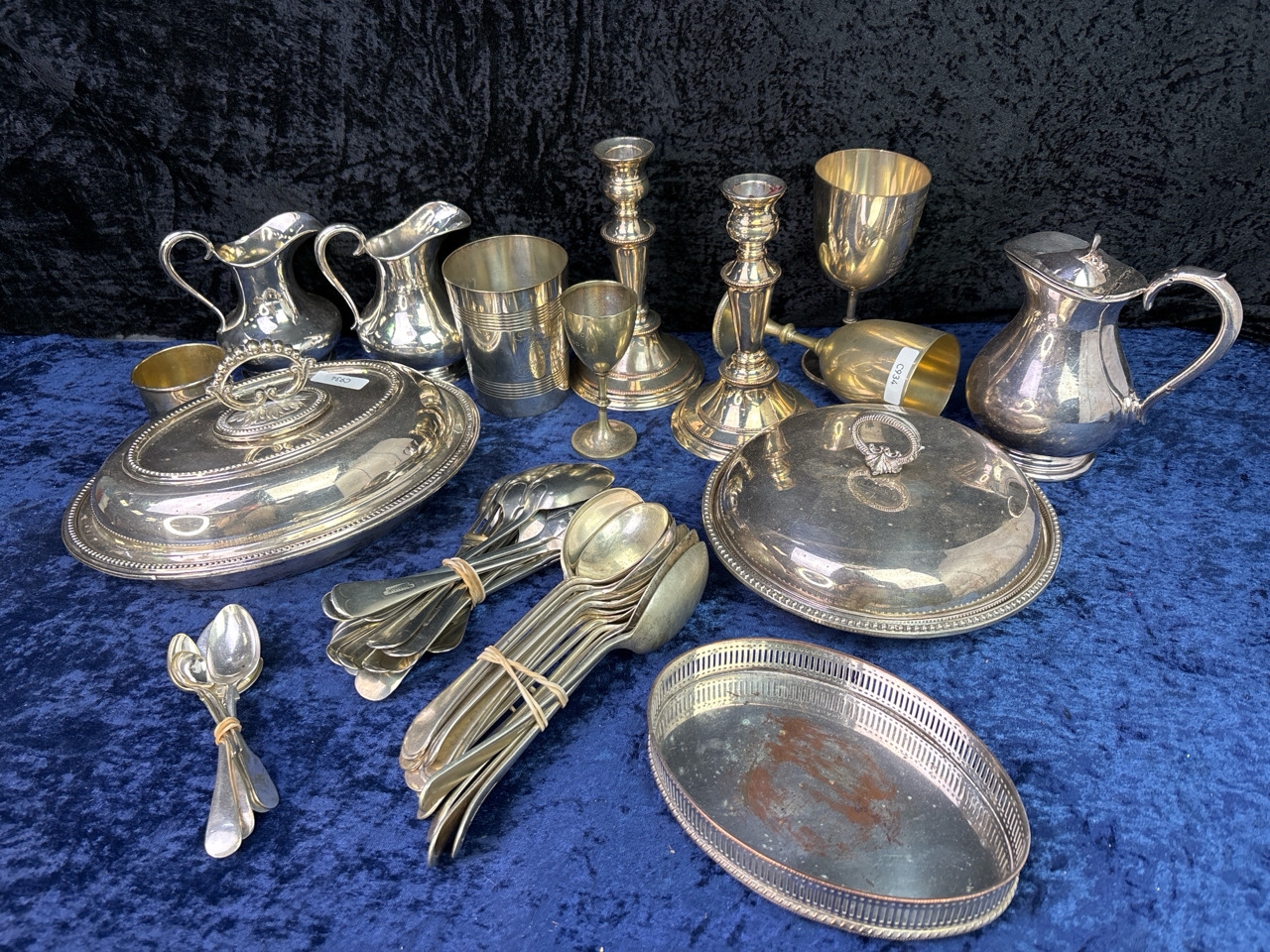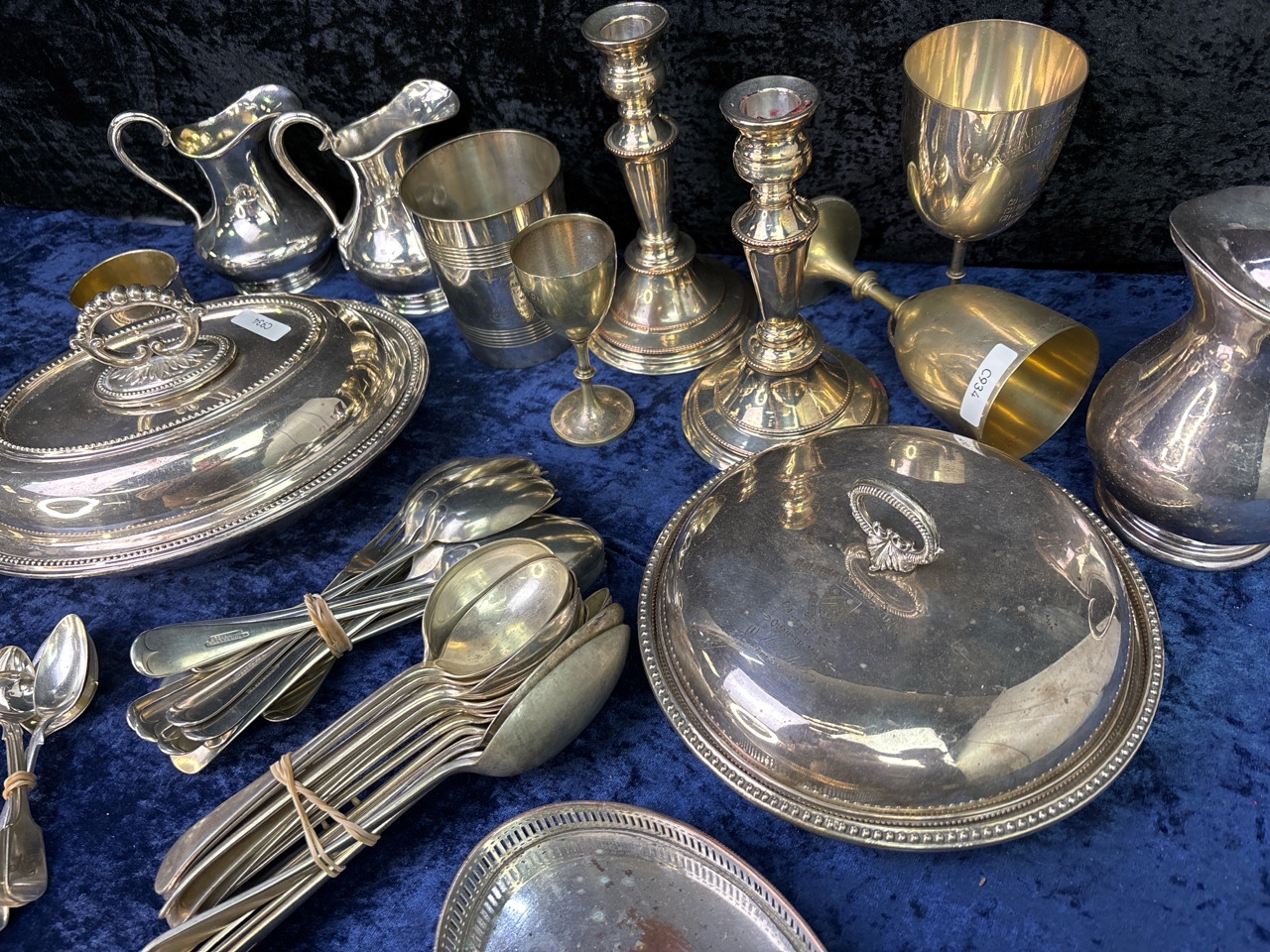 Superb collection of fine, antique and vintage silver plate tableware items inc goblets, lidded serving dishes, jugs, candlesticks, cutlery etc inc makers such as W Rogers and Co, Elkington, Walker and Hale etc