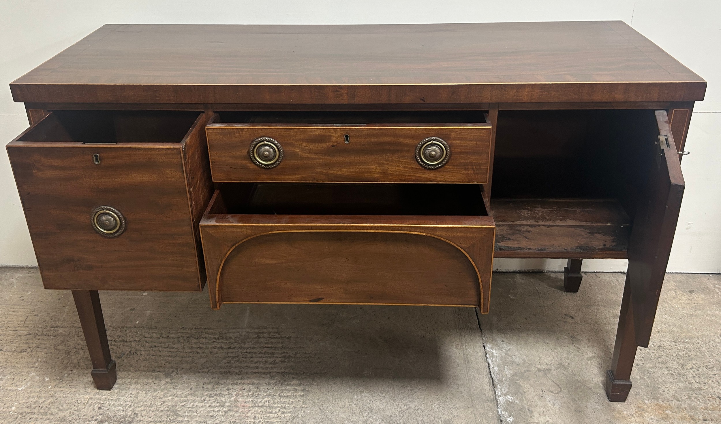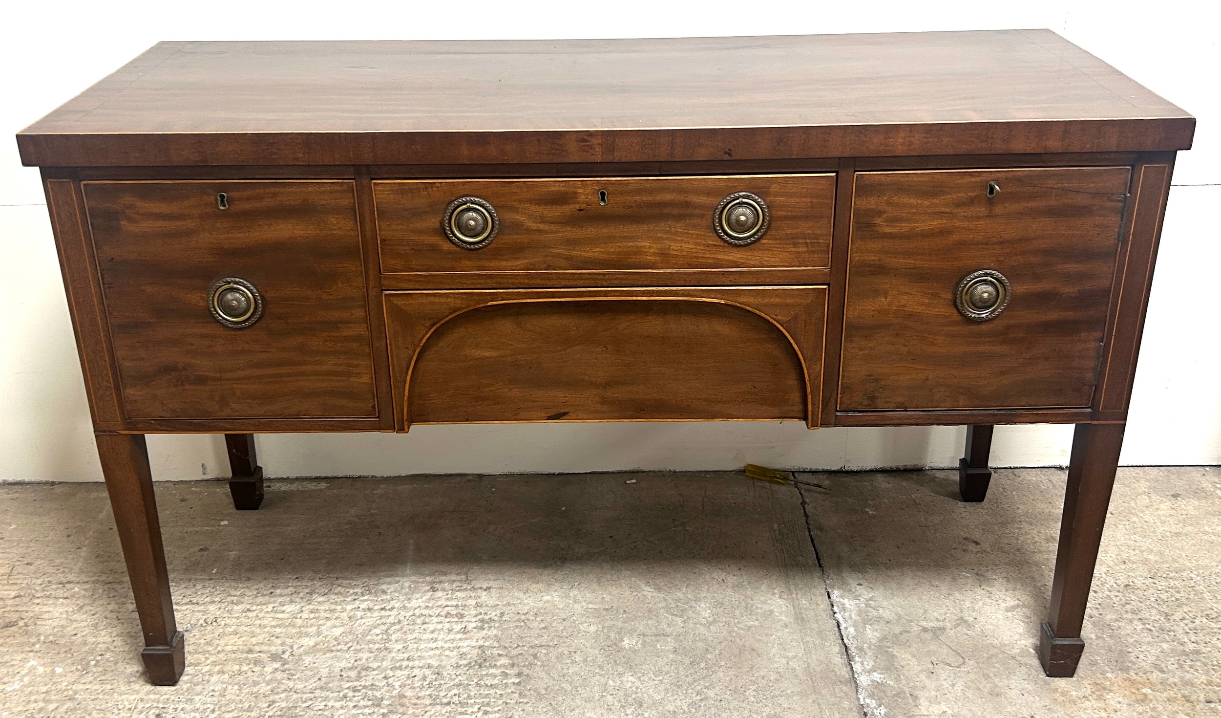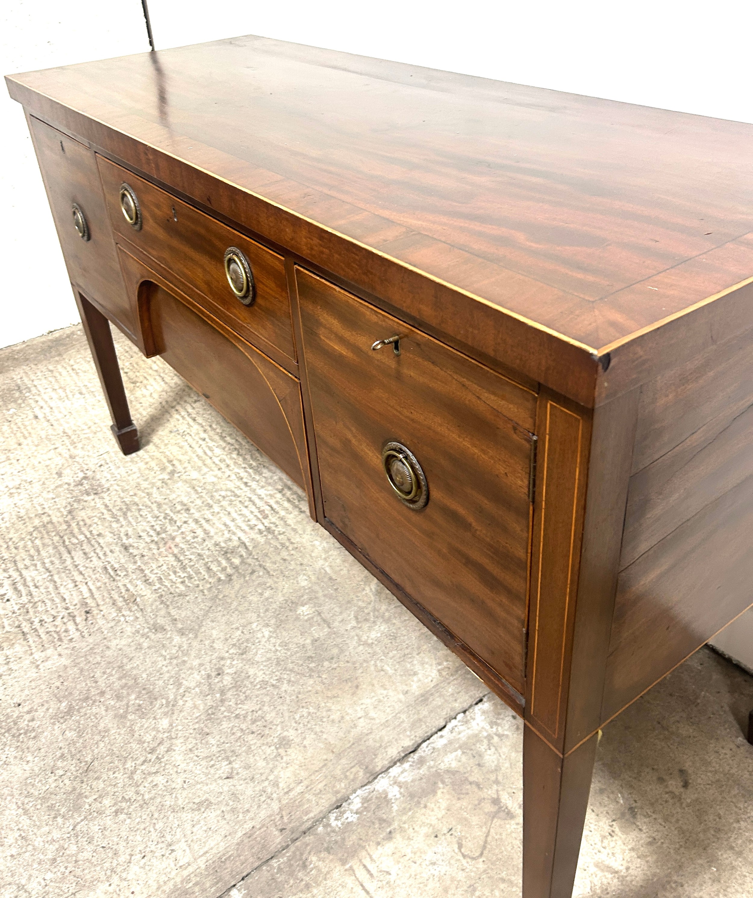 Antique mahogany inlaid regency sideboard measures approximately: 36 inches tall x 59 wide and 22 deep