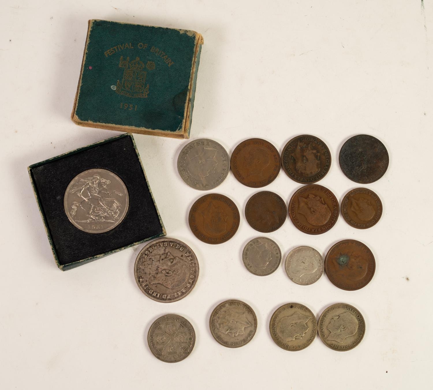 GEORGE V 1935 SILVER CROWN COIN (VF), some staining to obverse, a BOXED GEORGE VI FESTIVAL OF BRITAIN CROWN COIN 1951 (EF) ( box scuffed edges), TWO GEORGE V SILVER FLORINS 1929 AND 1931 box (VF), and TWO OTHERS 1921 (both showing wear) and 11 OTHER GEORGE V AND GEORGE VI SILVER AND COPPER COINS VARIOUS mainly (F) 17 coins in total (17)