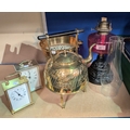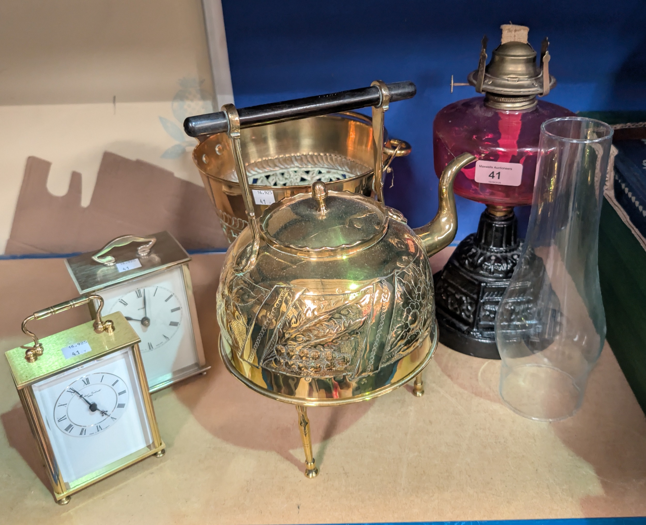 A Vicorian oil lamp with sliced cranberry glass reservoir, a brass coal bucket and tea pot on stand; an English Elegance clock barometer set and 2 modern carriage clocks