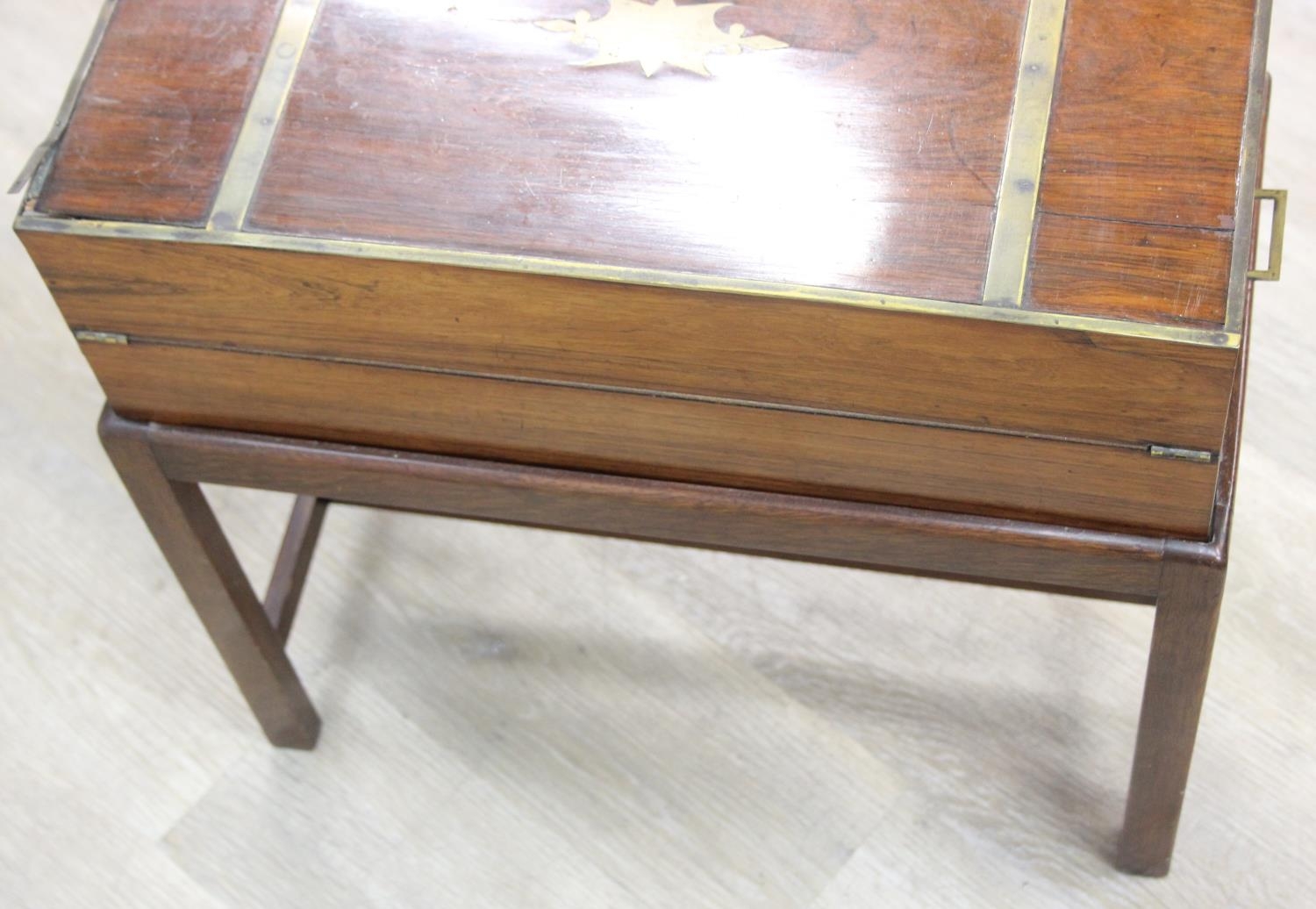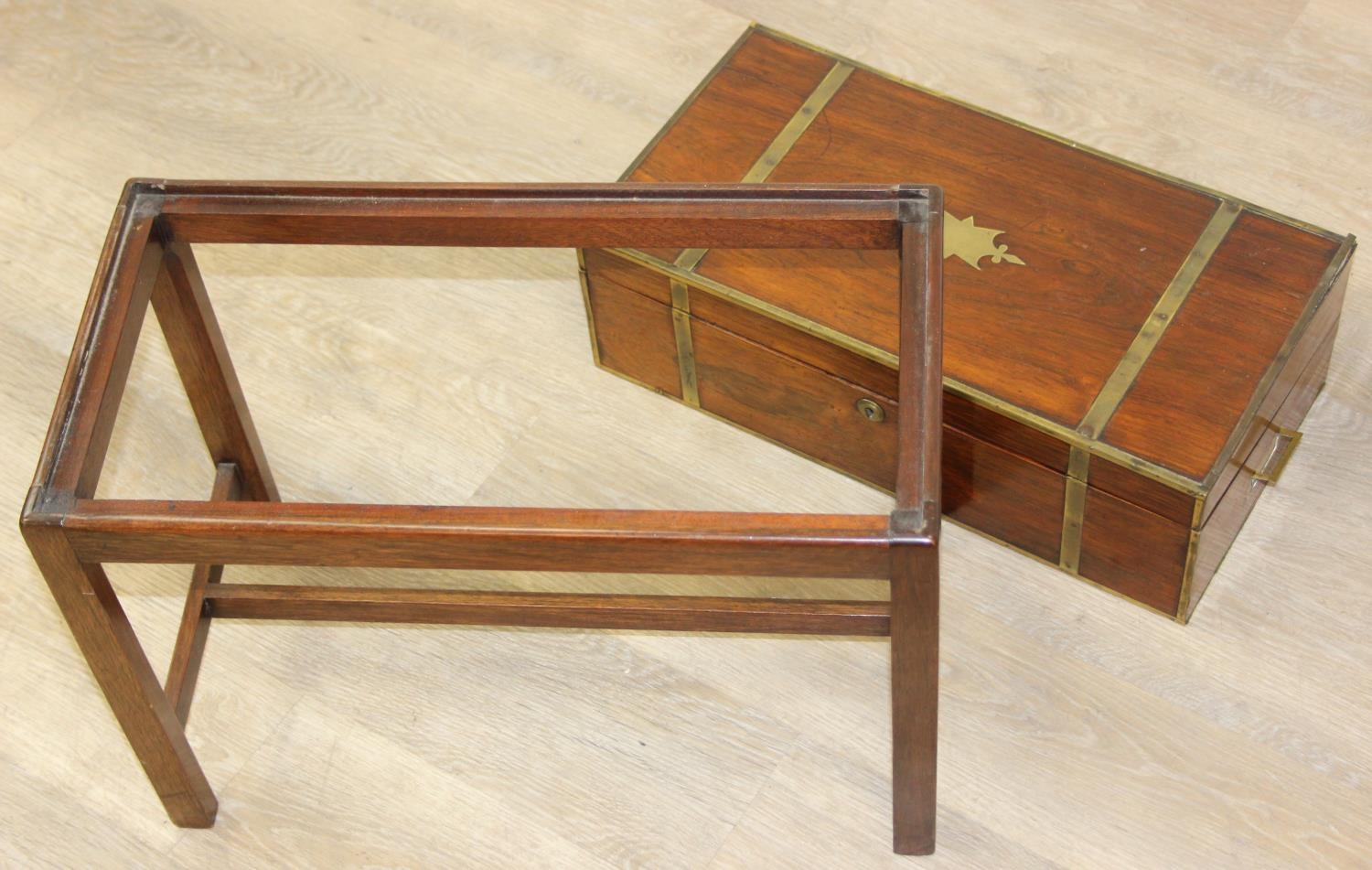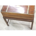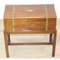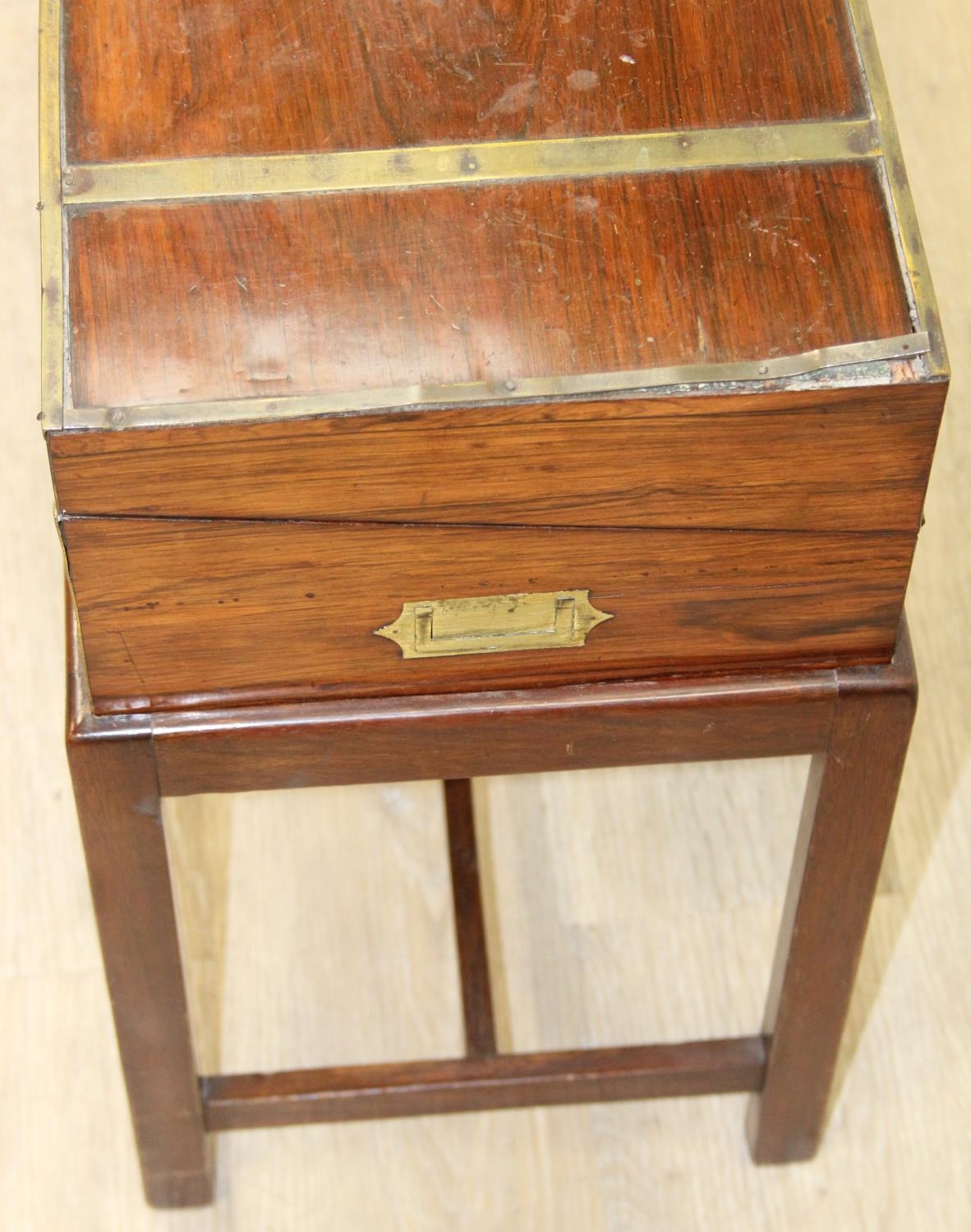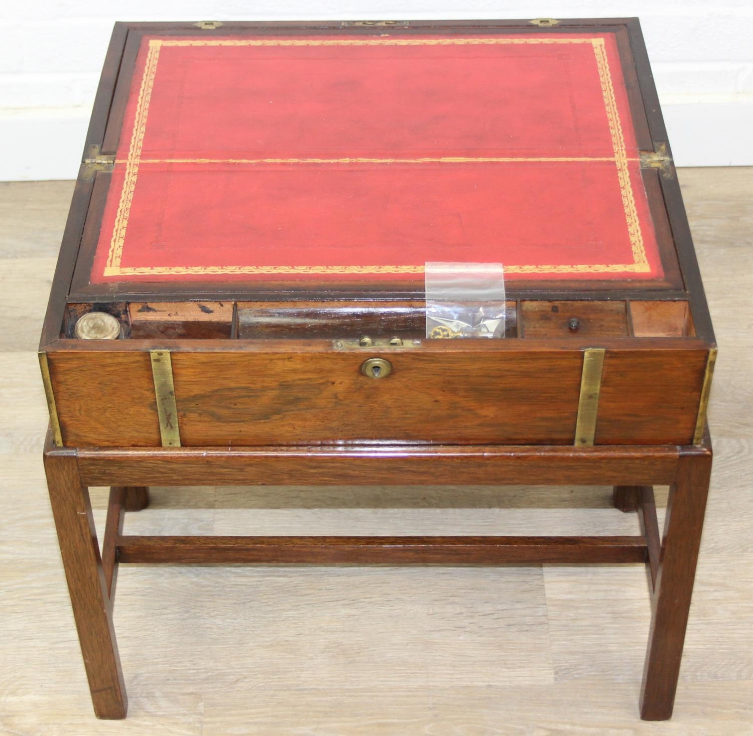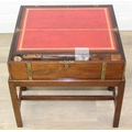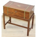 A Campaign style mahogany writing slope with brass bindings on stand, red baize writing platform, 53cm x 29cm x 51cm