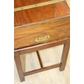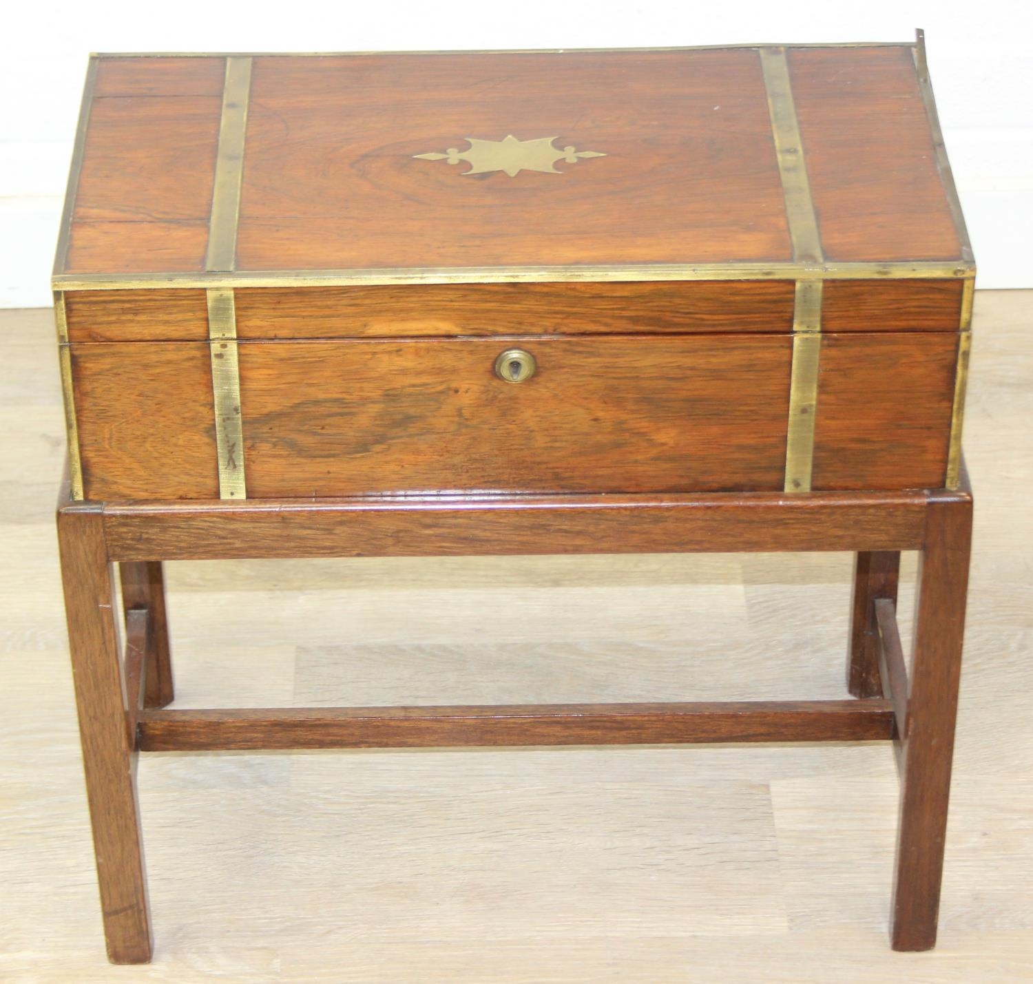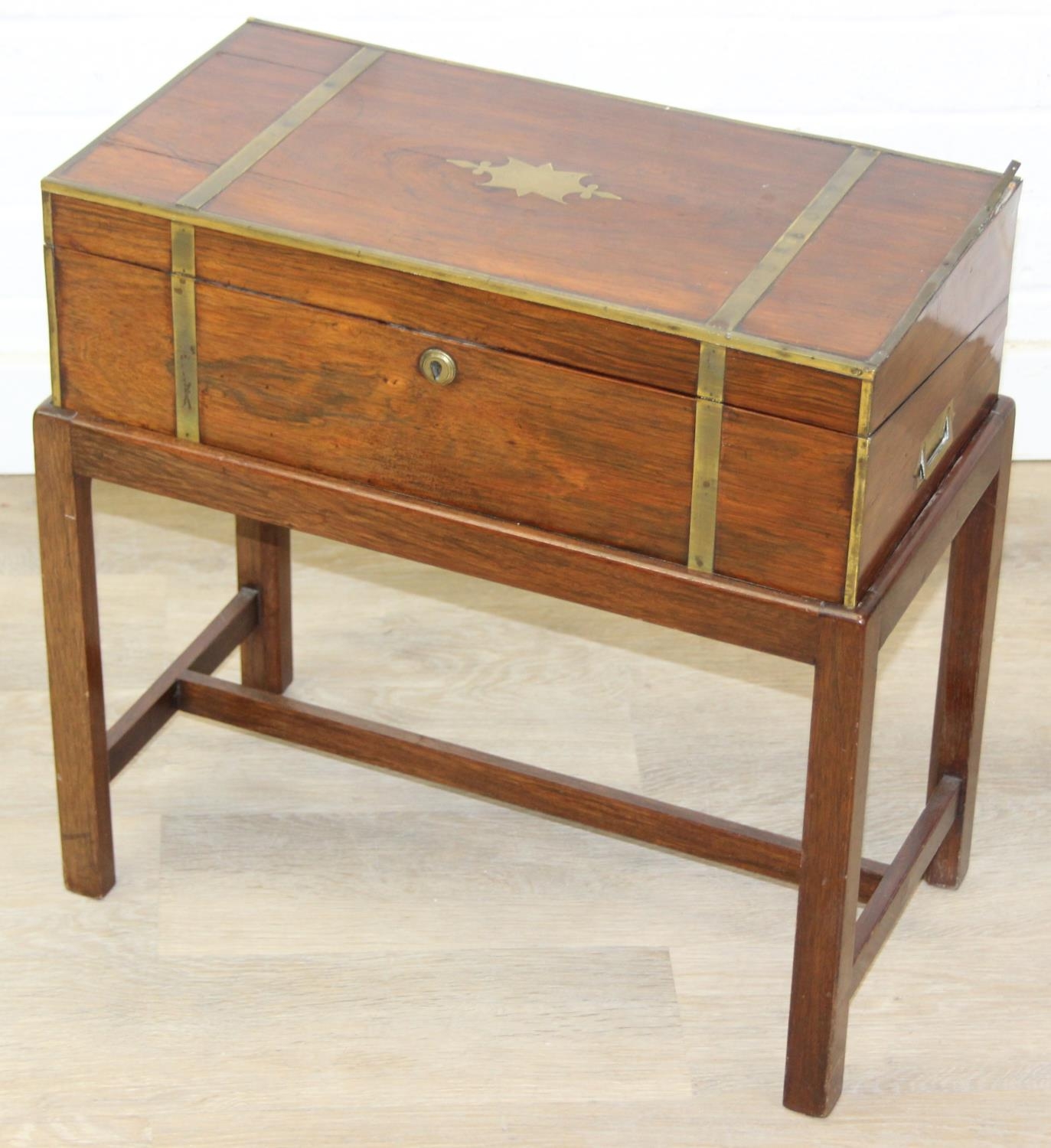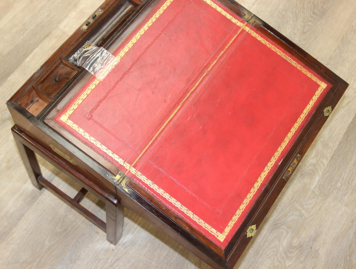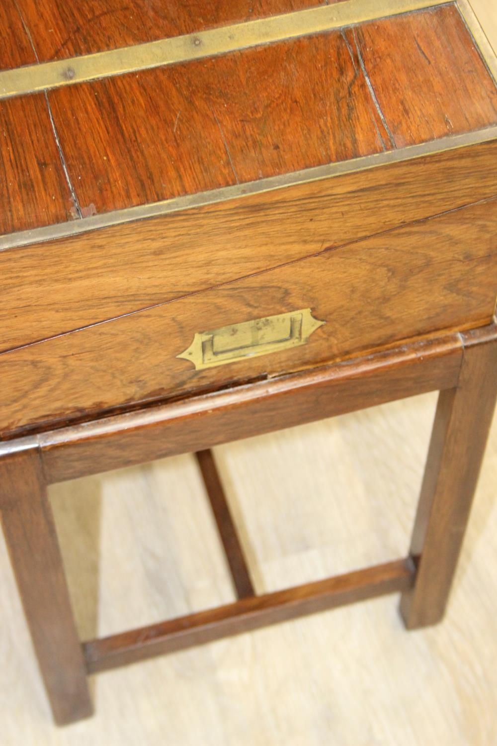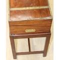A Campaign style mahogany writing slope with brass bindings on stand, red baize writing platform, 53cm x 29cm x 51cm