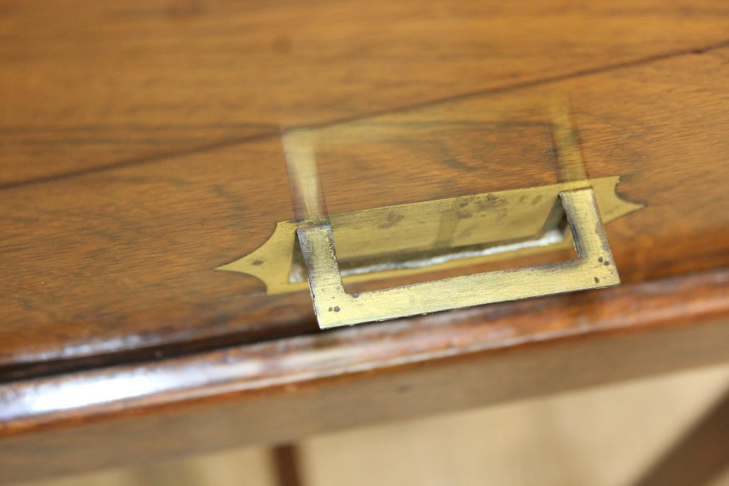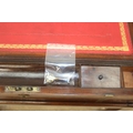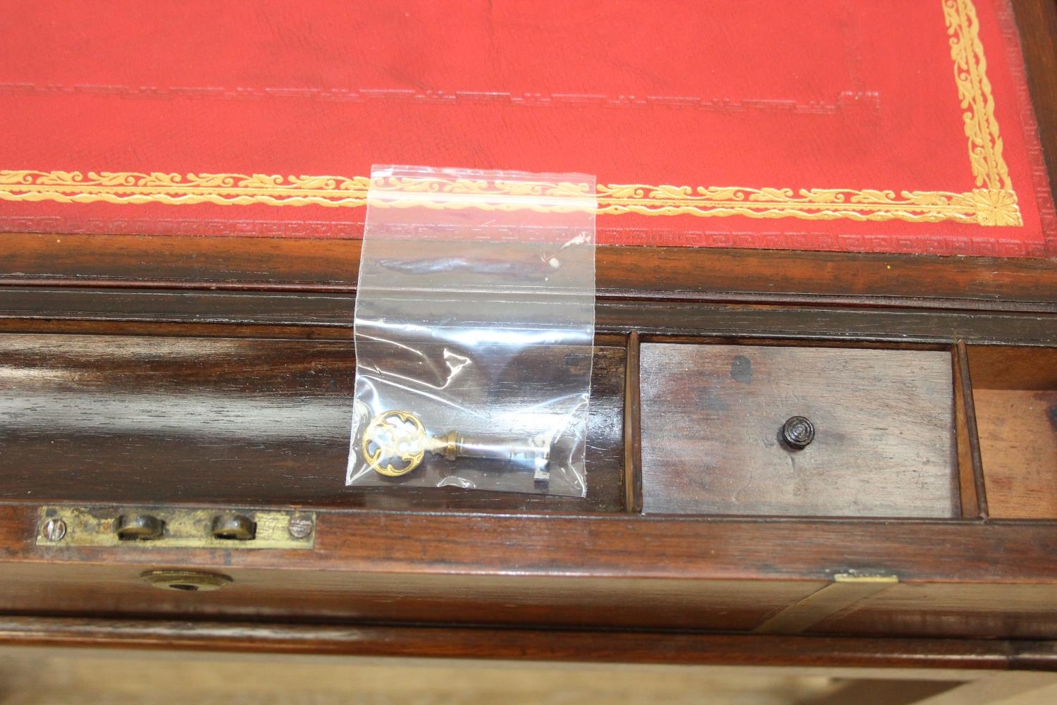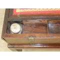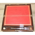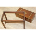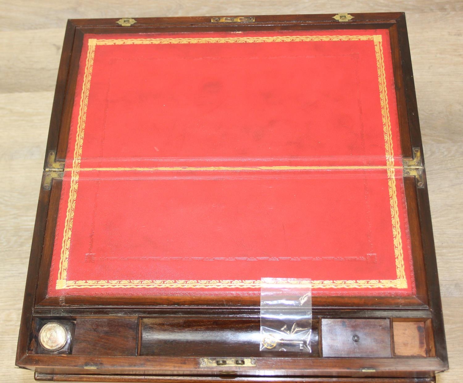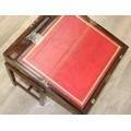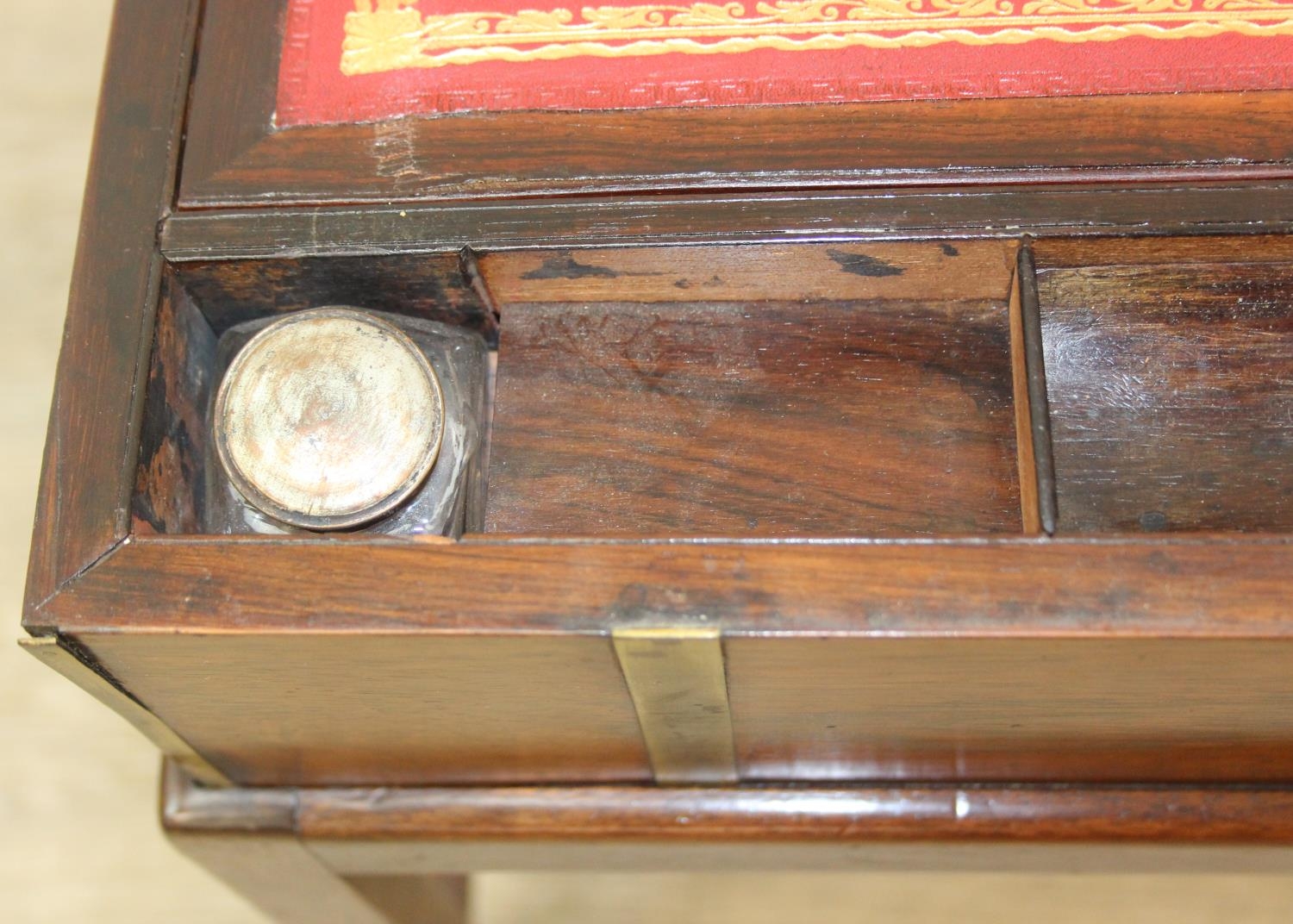 A Campaign style mahogany writing slope with brass bindings on stand, red baize writing platform, 53cm x 29cm x 51cm