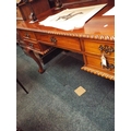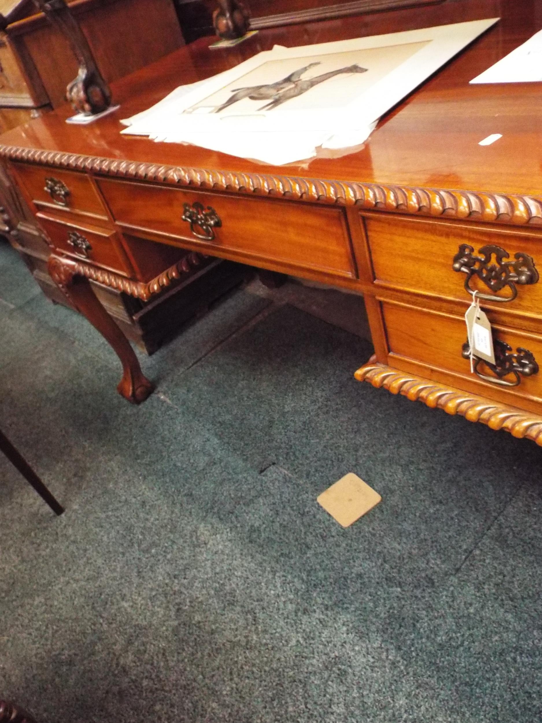 A reproduction stained wood desk having carved borders a long drawer flanked by four short drawer, resting on claw and ball feet