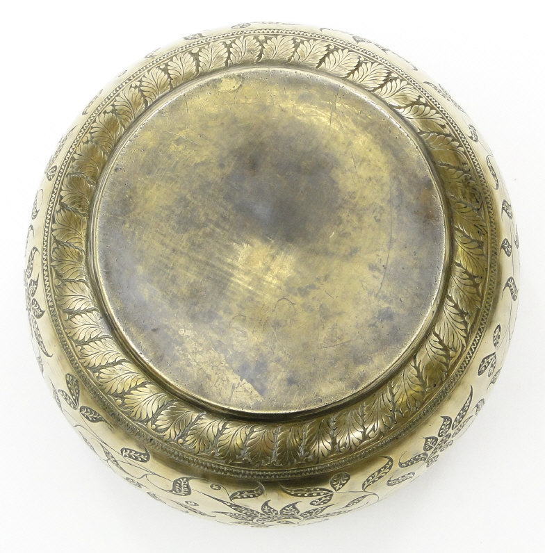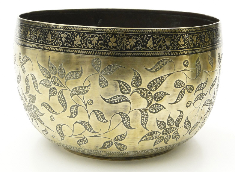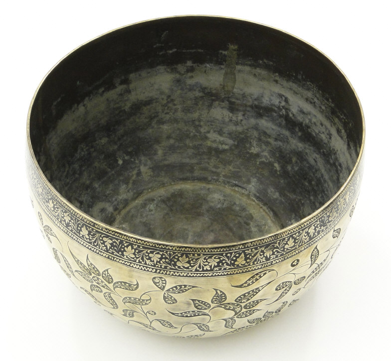 Indian brass jardinière with black enamelled and chased decoration, 22cm diameter