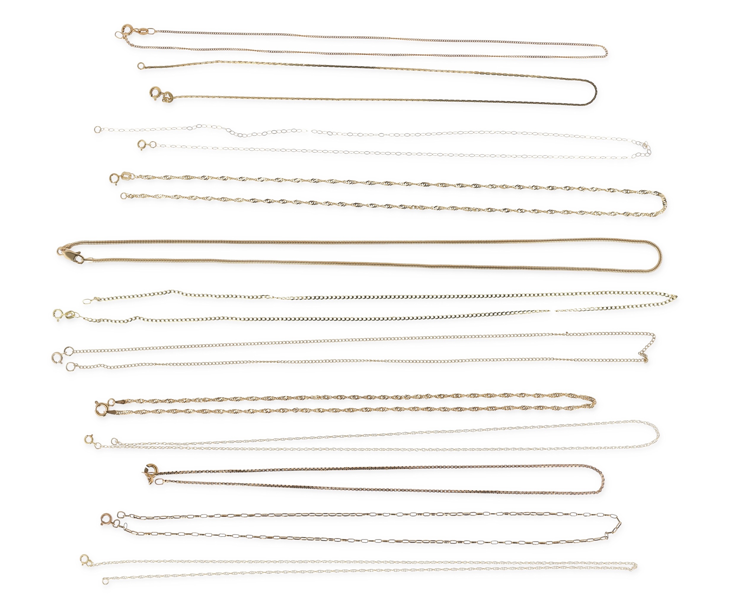 TWELVE 9CT GOLD NECK CHAINS OF VARYING DESIGNS Total weight:...