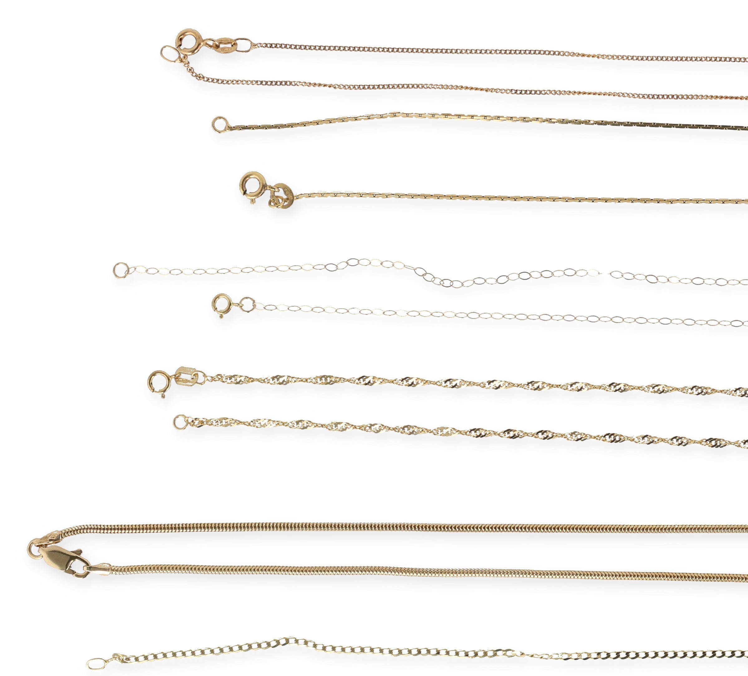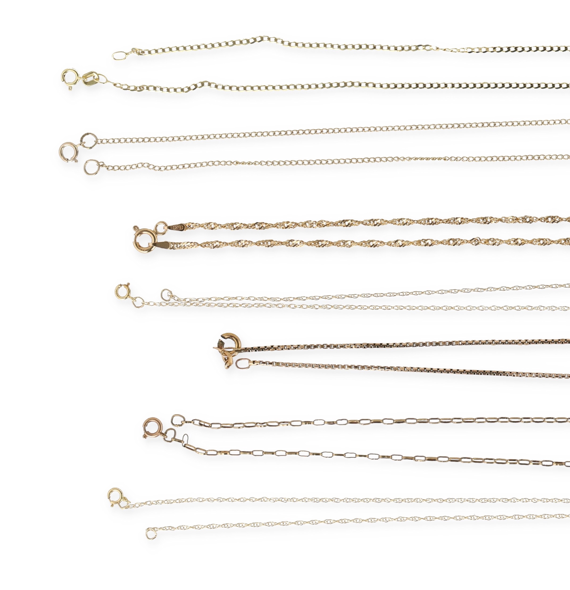 TWELVE 9CT GOLD NECK CHAINS OF VARYING DESIGNS