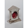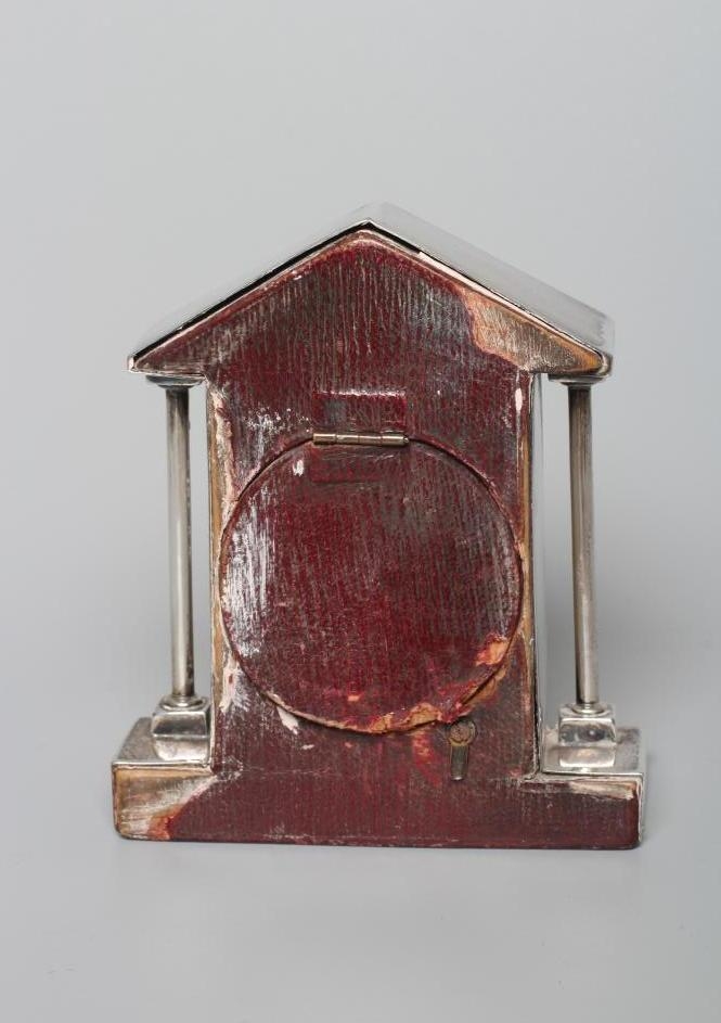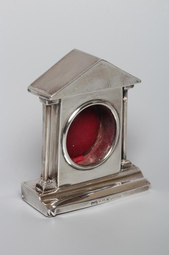 AN EDWARDIAN SILVER POCKET WATCH HOLDER, maker's mark A&B, Birmingham 1903, the triangular portico supported by two plain columns on a stepped base with pen well, 3 3/4" high, loaded