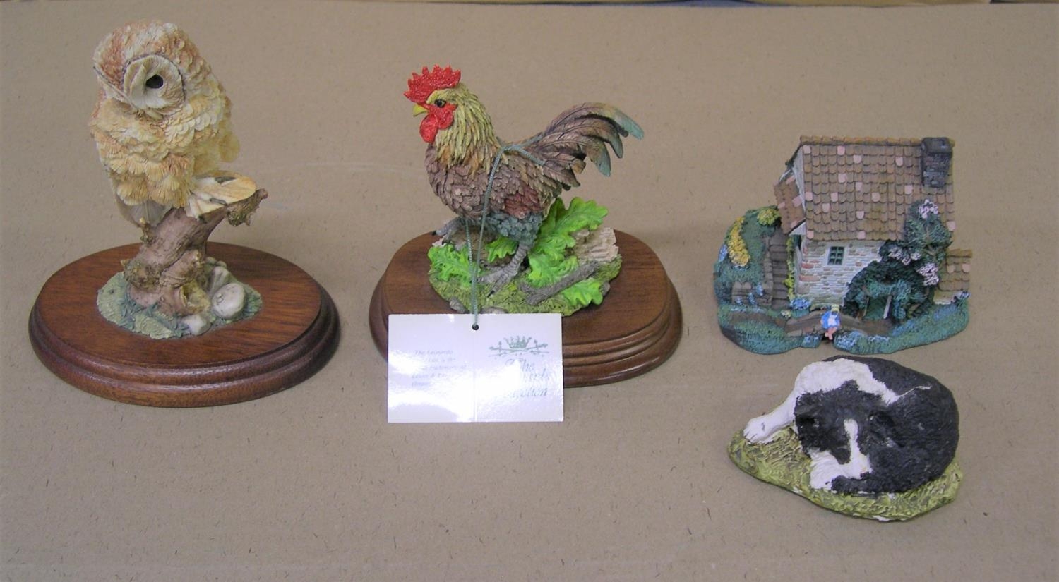 Collection of Country Artists style collectables including Tawny owl, Cockerel etc,