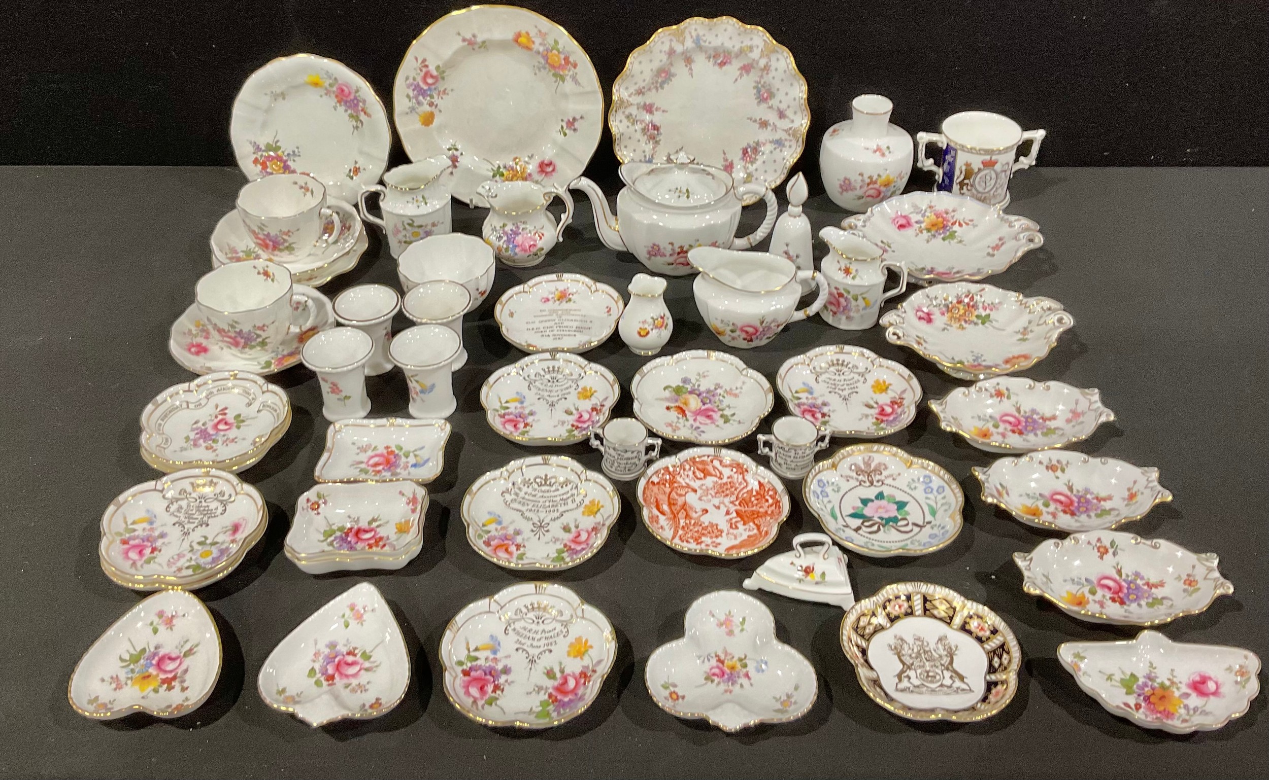 A Royal Crown Derby Posies pattern bachelor teapot and cover; other Posies, including cream jugs, trinket dishes, vases, cups and saucers, etc; a Royal Antoinette shaped circular dessert plate; other Royal Crown Derby, including commemorative ware, etc, qty