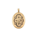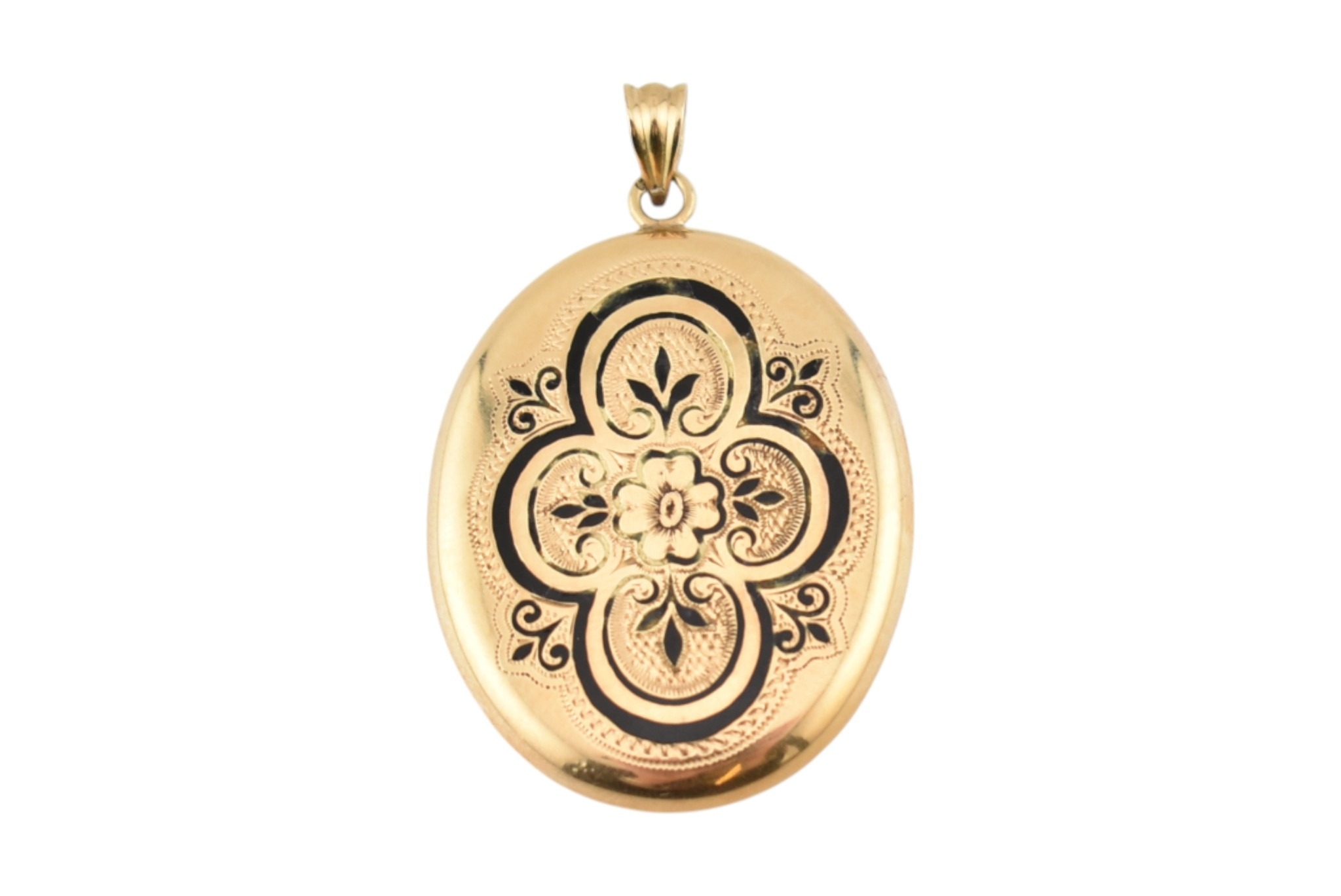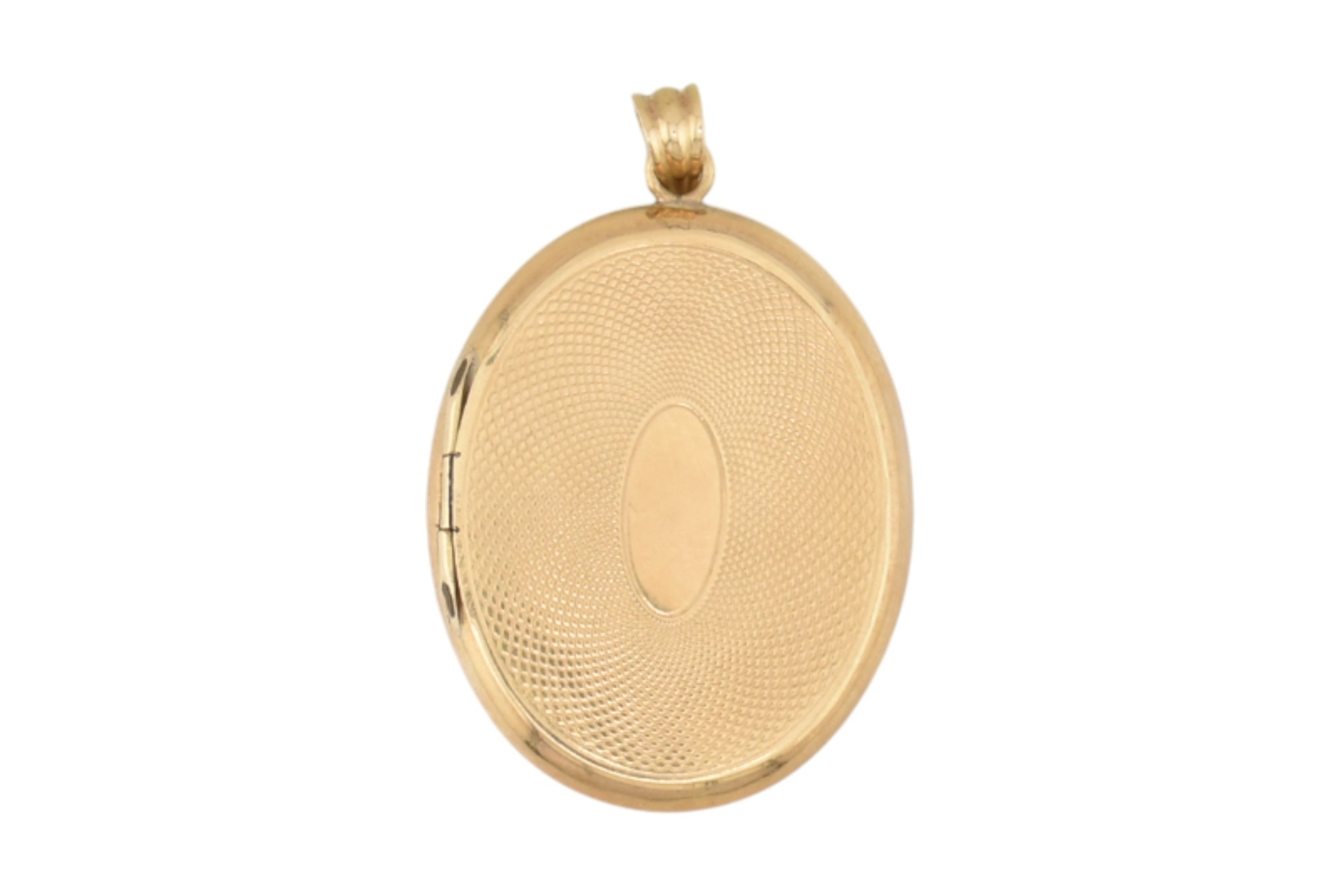 An Austro-Hungarian gold enamel locket pendant. The locket with enamel decoration having engine turned decoration verso, opening to reveal two glazed compartments. Partial mark to bail is illegible. Surface tests indicate 14ct gold. Total weight 5.6g. Measures 4cm including bail.