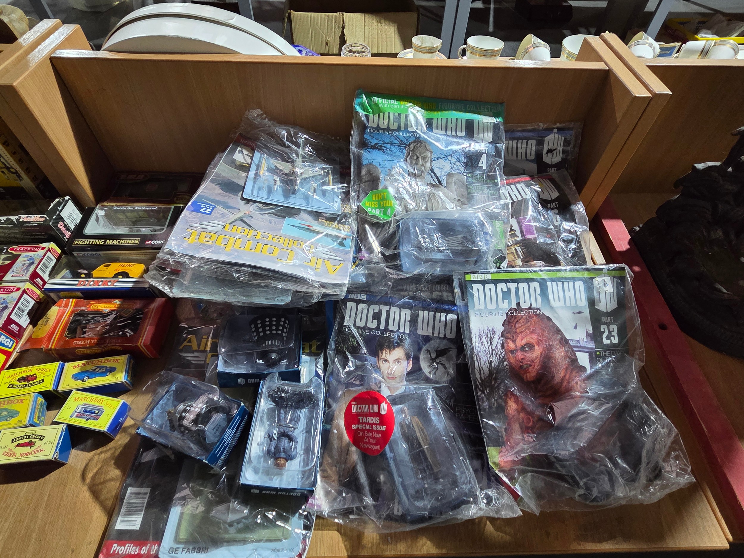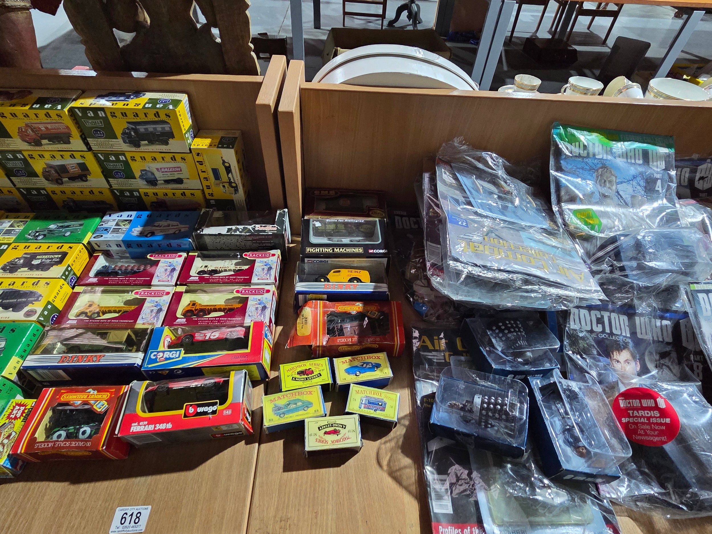 Boxed Vanguards cars and Doctor Who collector's magazines and figures and aeroplanes