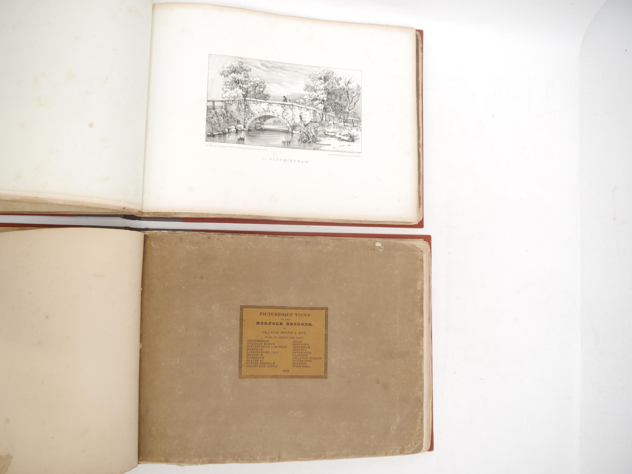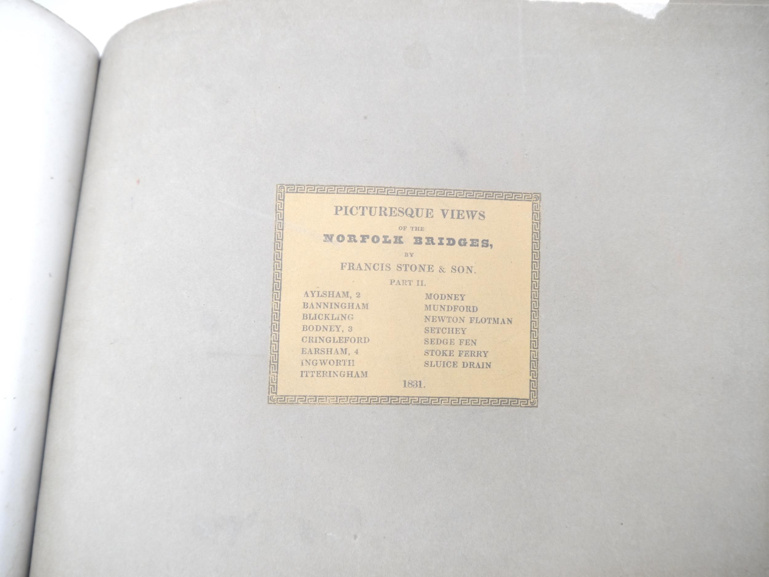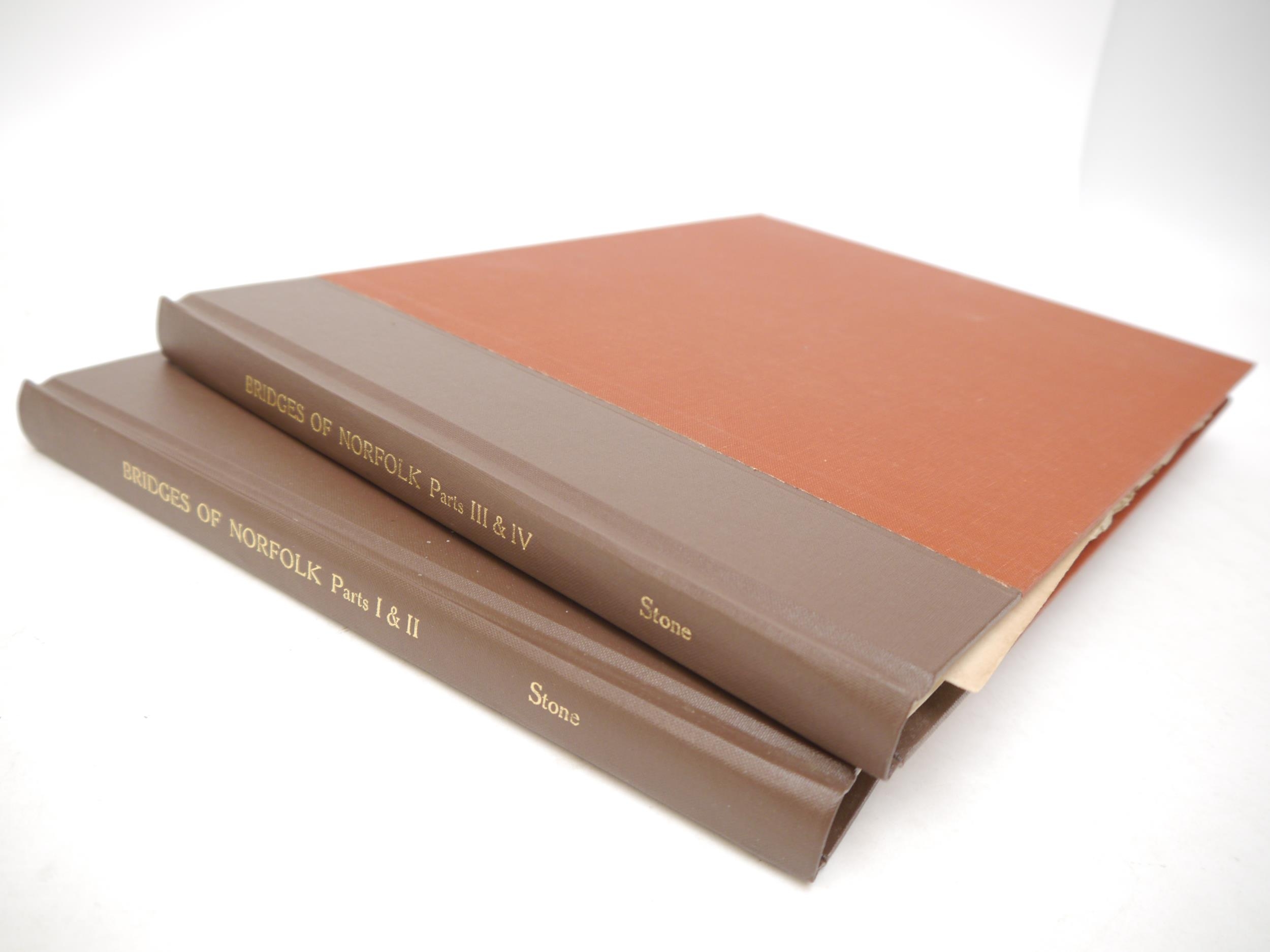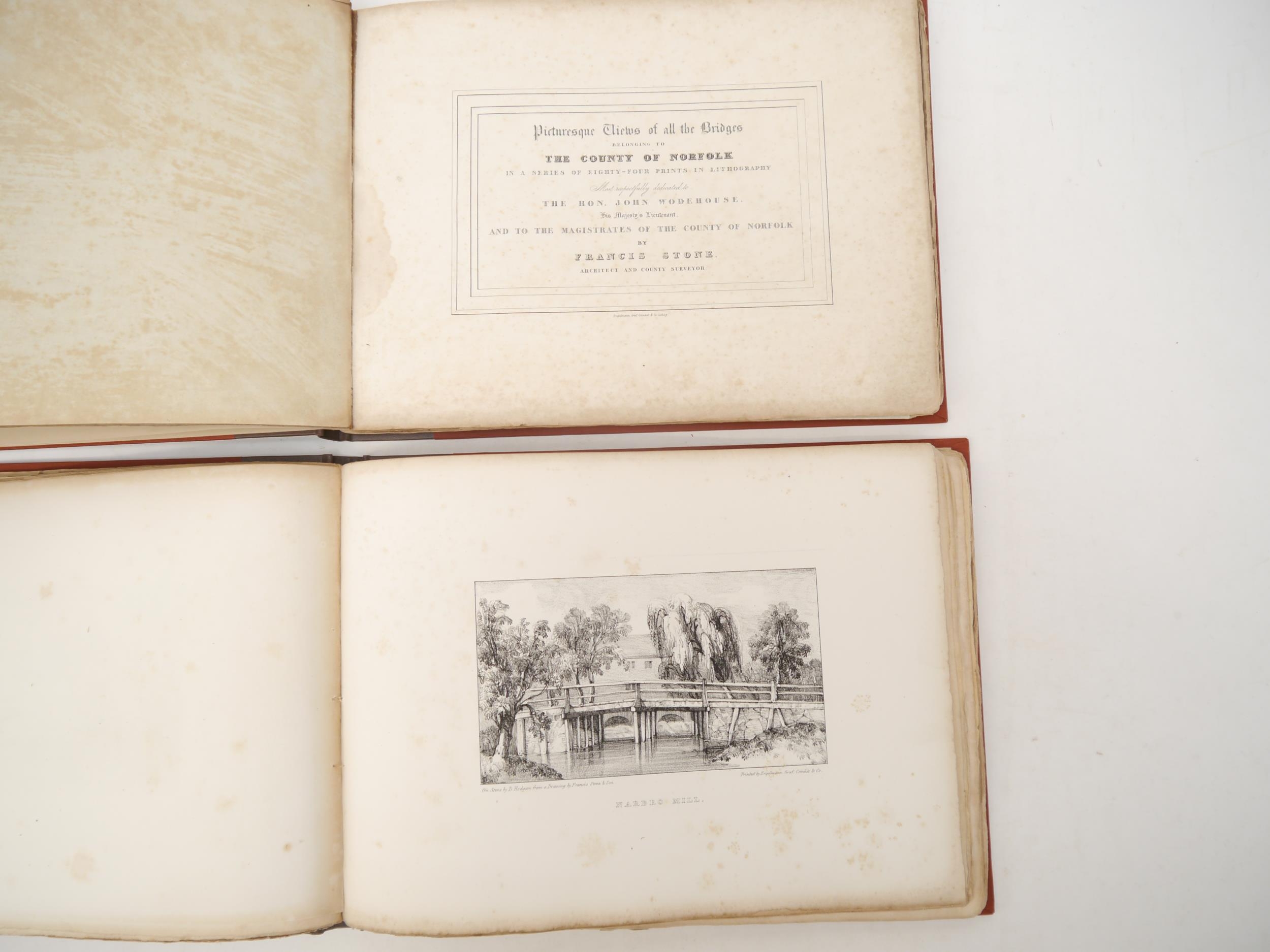 Francis Stone: 'Picturesque views of all the Bridges Belonging to the County of Norfolk in a series of Eighty-Four Prints in Lithography', [1830], 1st edition, lithograph title + 83 (of 84) litho plates by Engelman after Francis Stone, lacks 'Harpham' plate, 'Larlingford 1' supplied loose at front, bound in 2 modern cloth volumes, original brown card wraps for the 4 parts bound in (wrap for part 1 without printed label). From the collection of Father Peter Harris (2) (E) £50-100