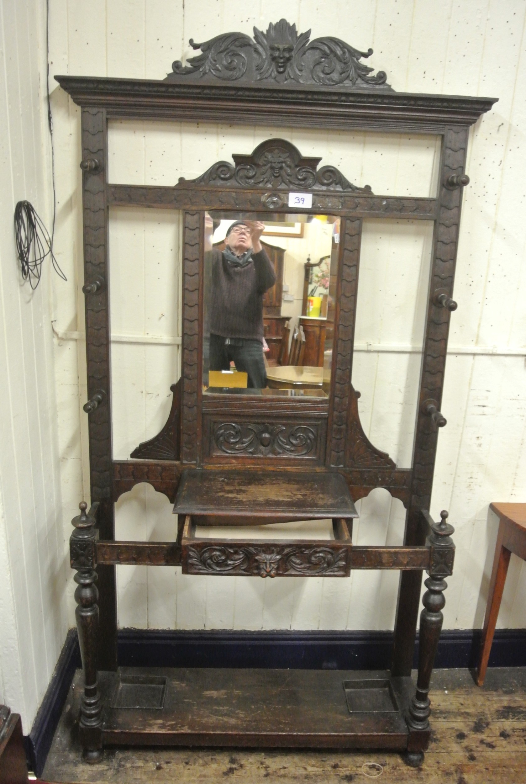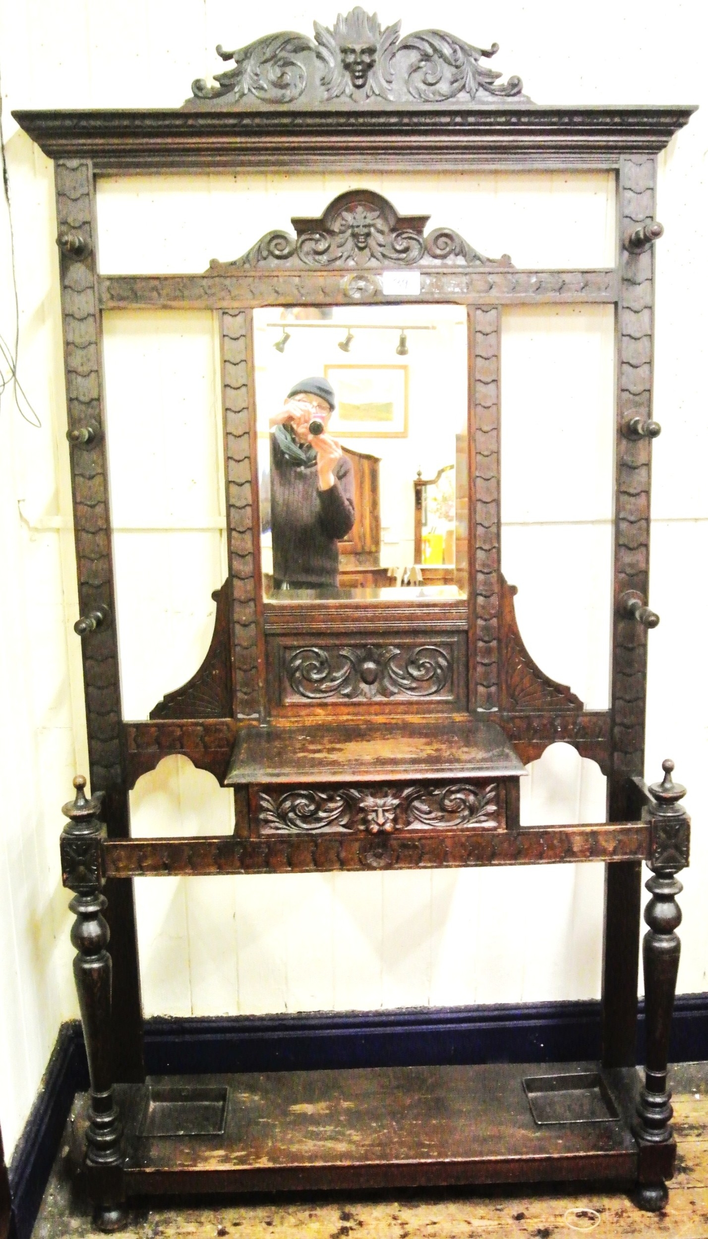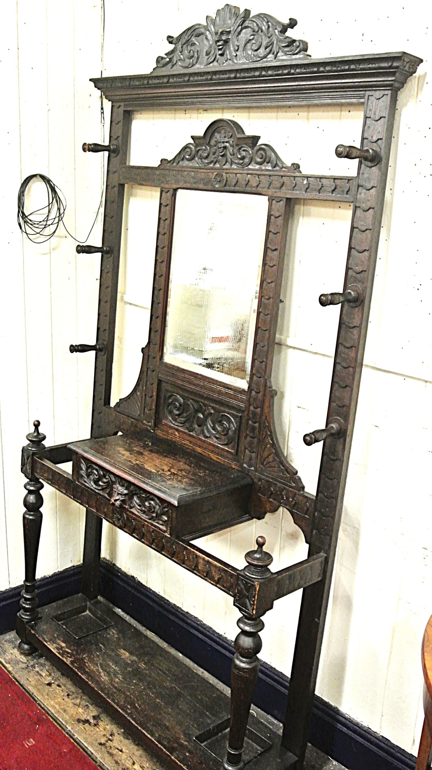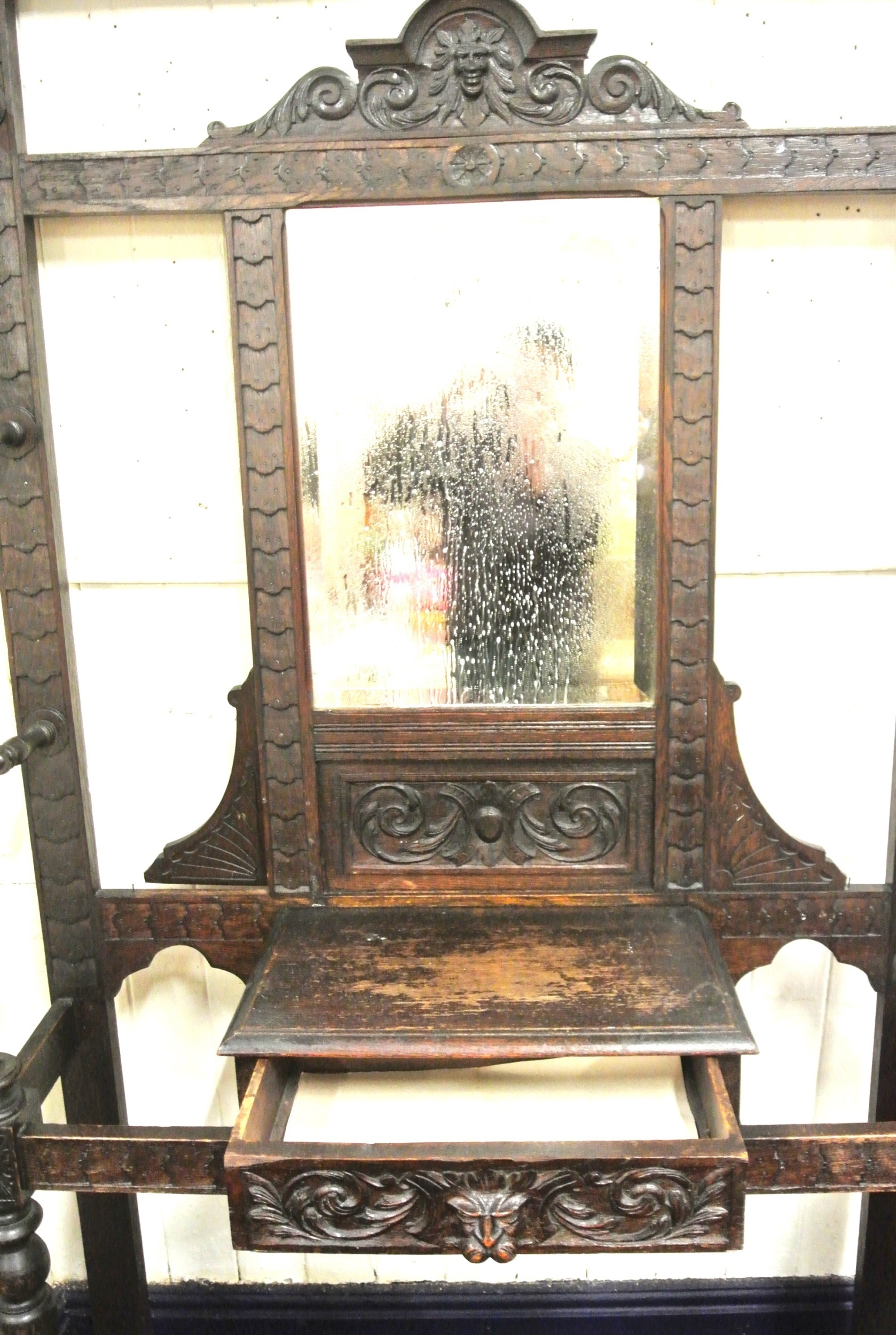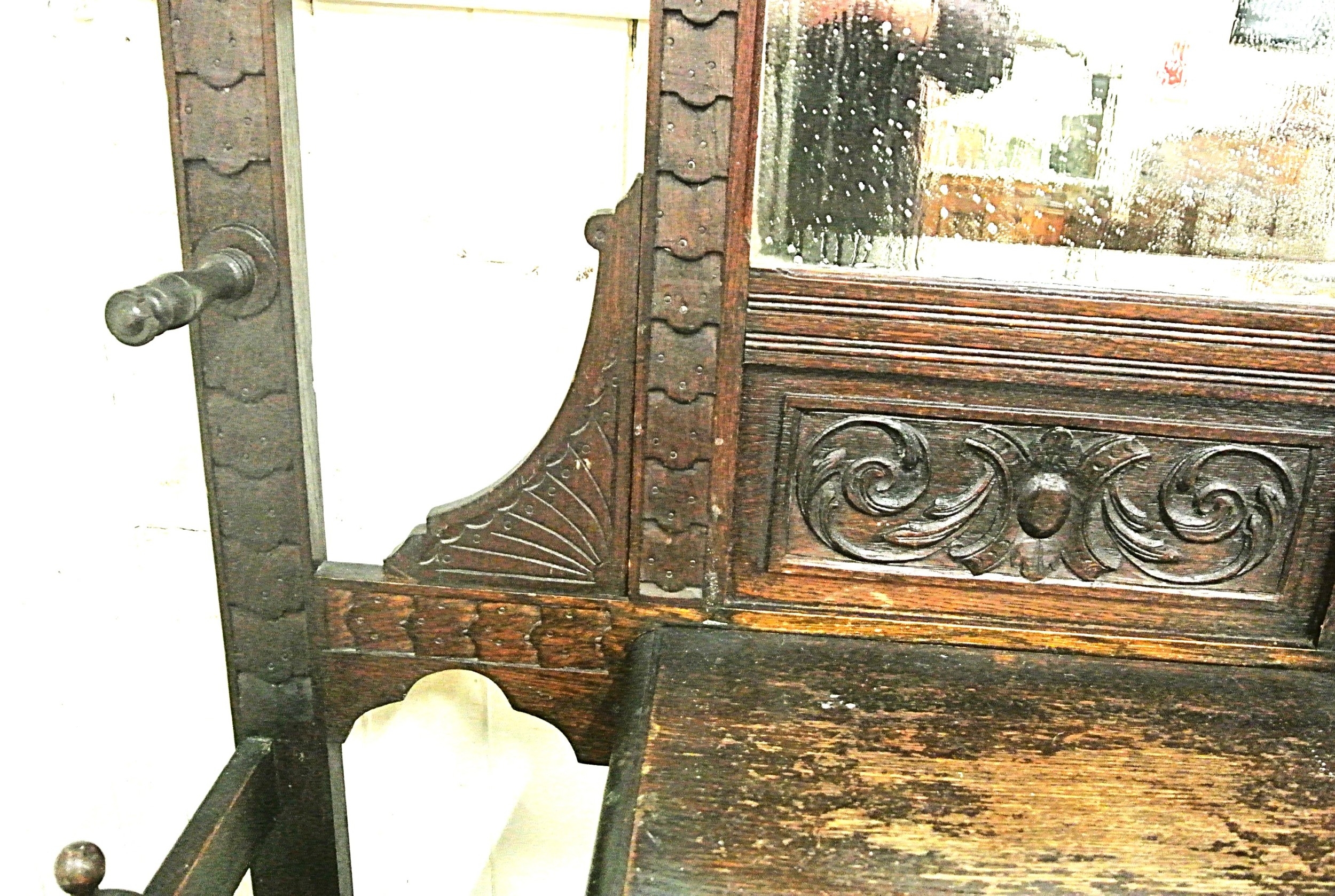 Arts & Crafts oak hallstand with scroll and figured decoration, mirror inset, glove drawer, and turned columns