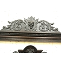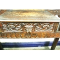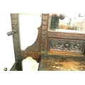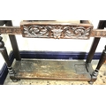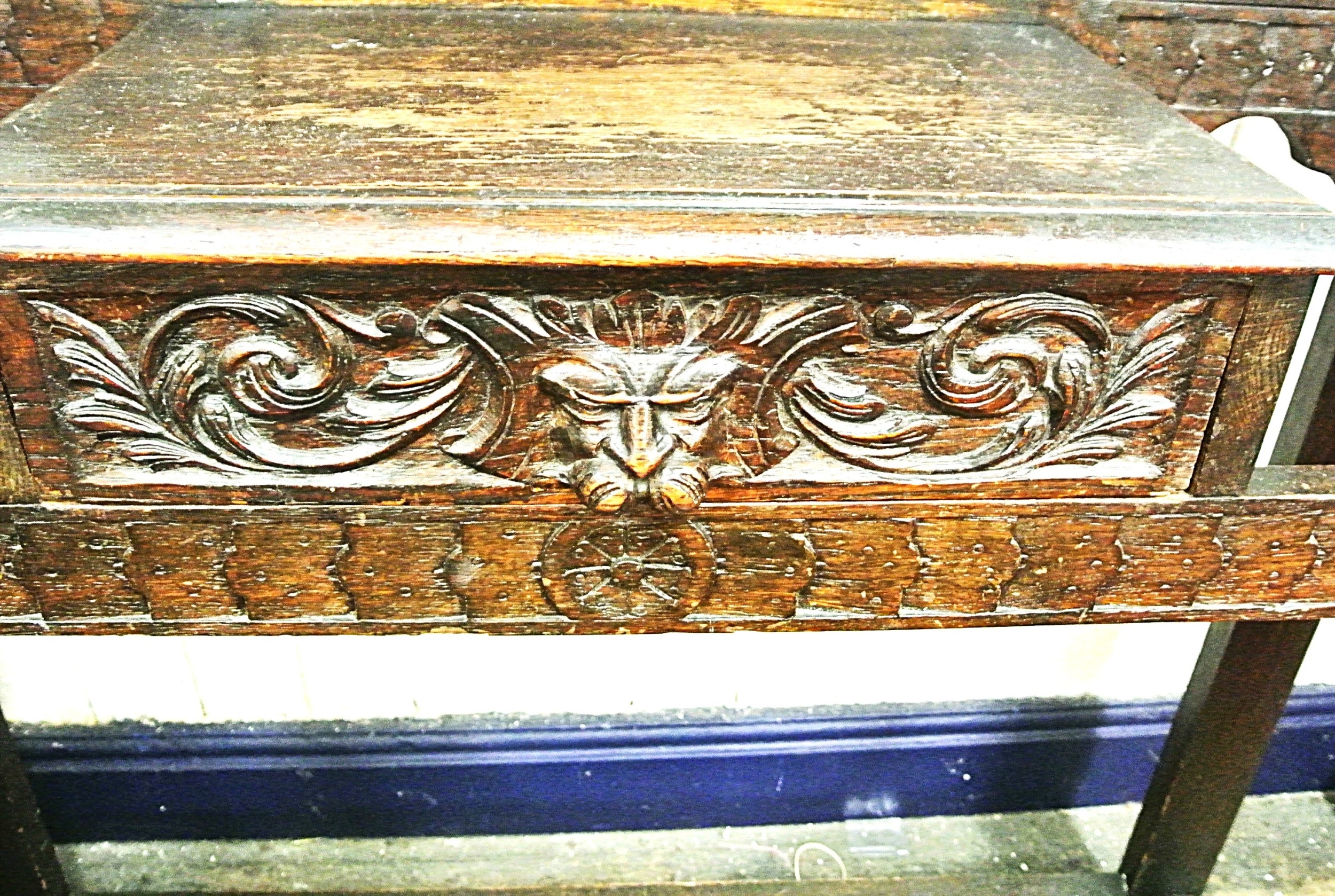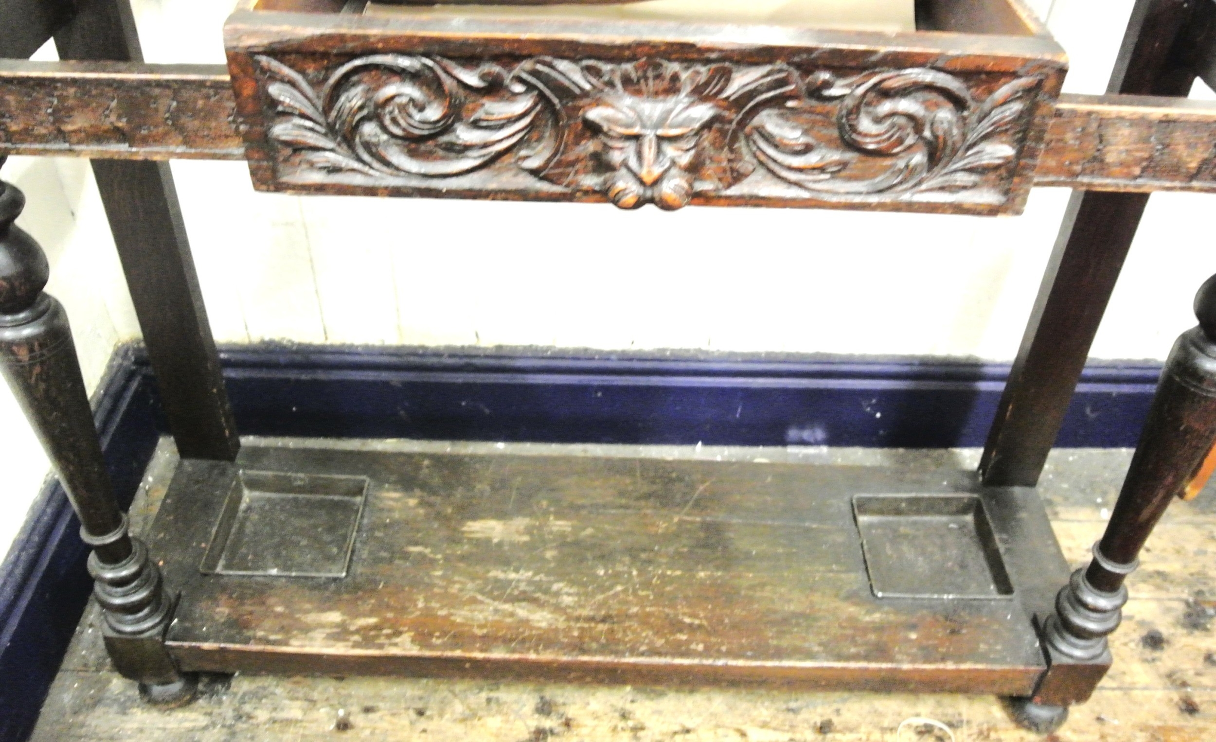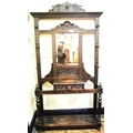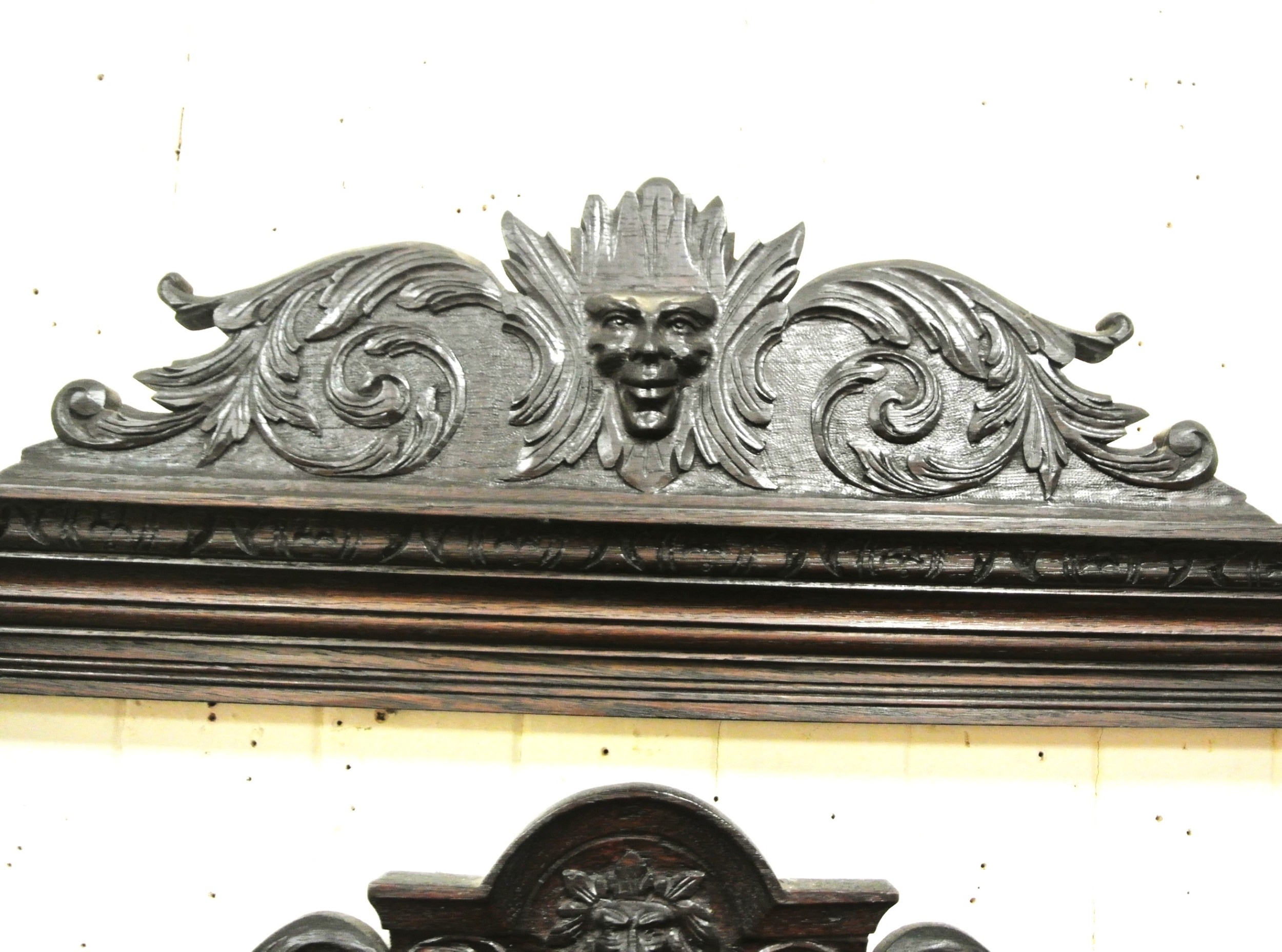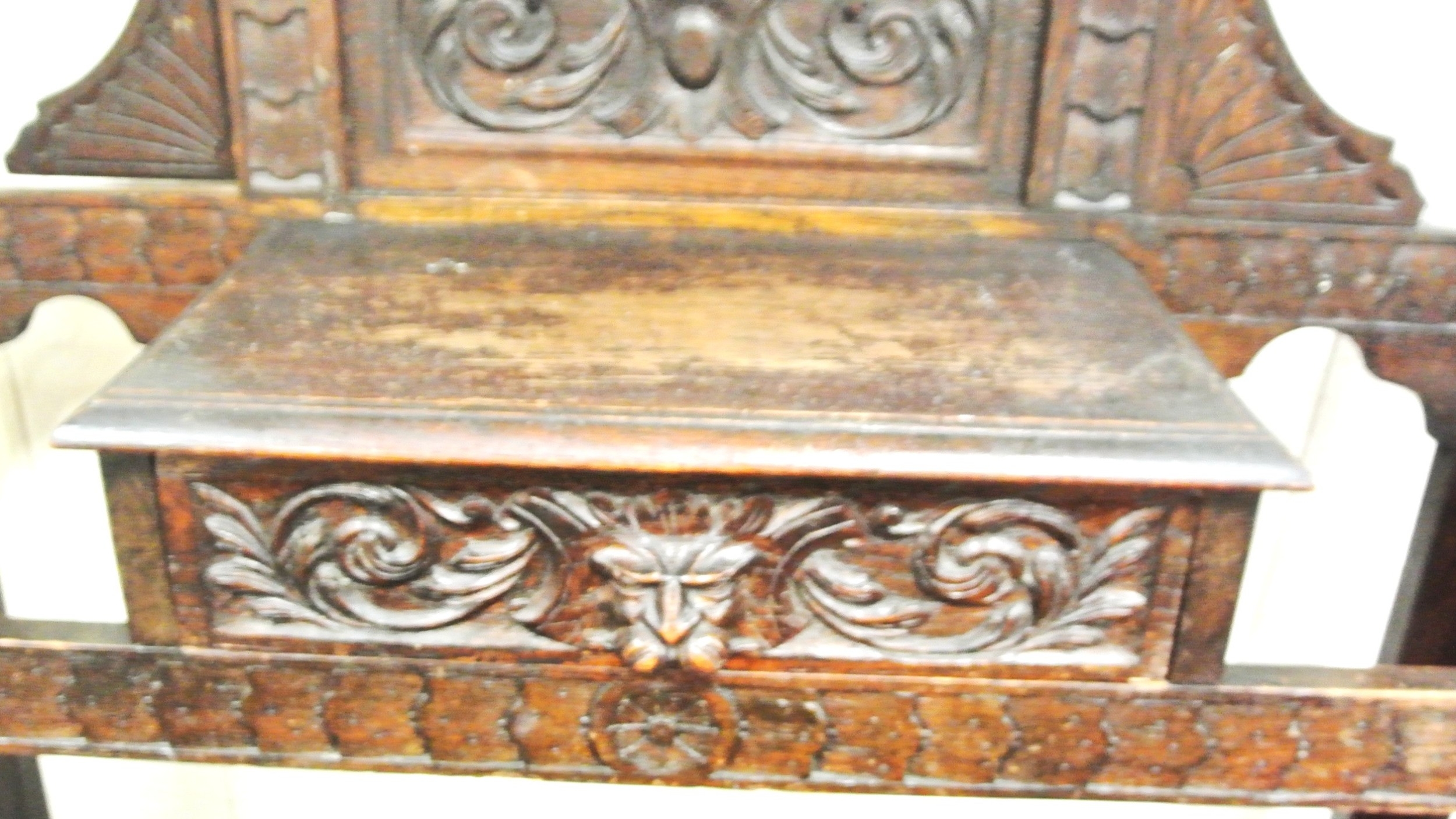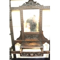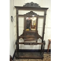 Arts & Crafts oak hallstand with scroll and figured decoration, mirror inset, glove drawer, and turned columns