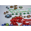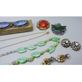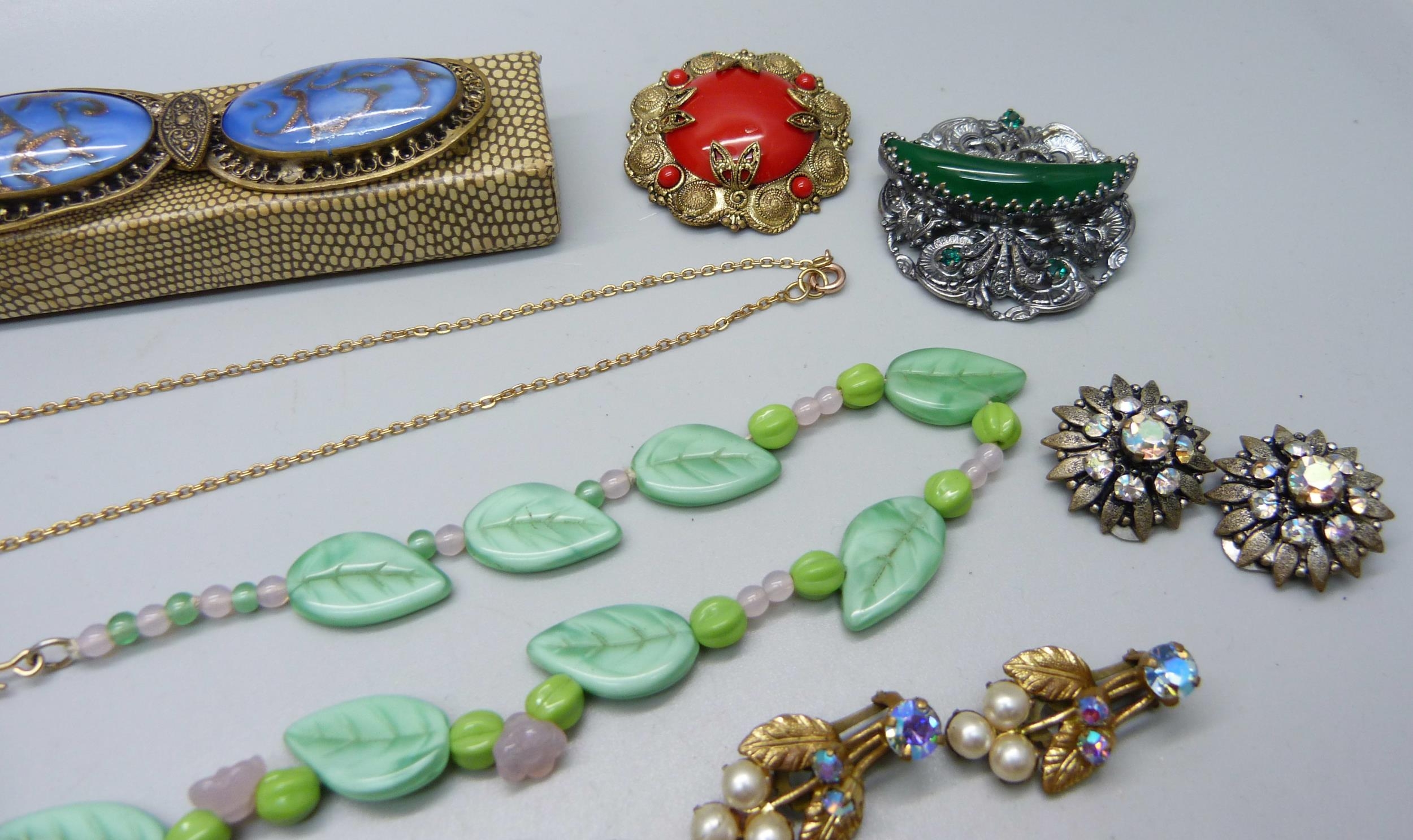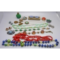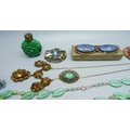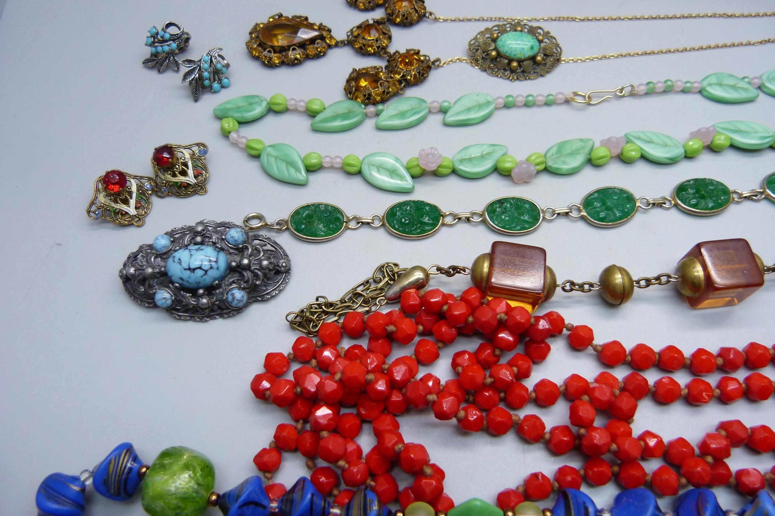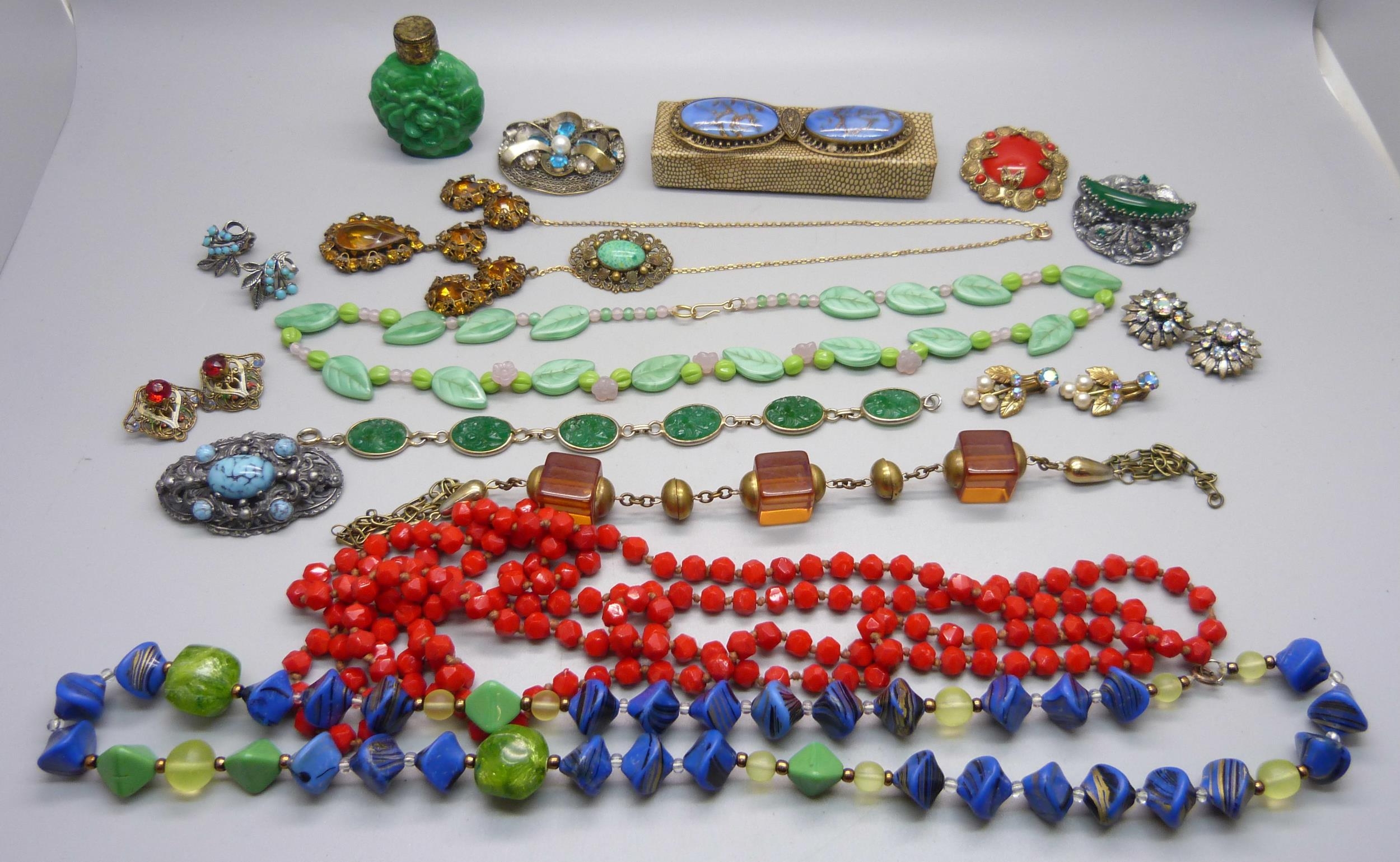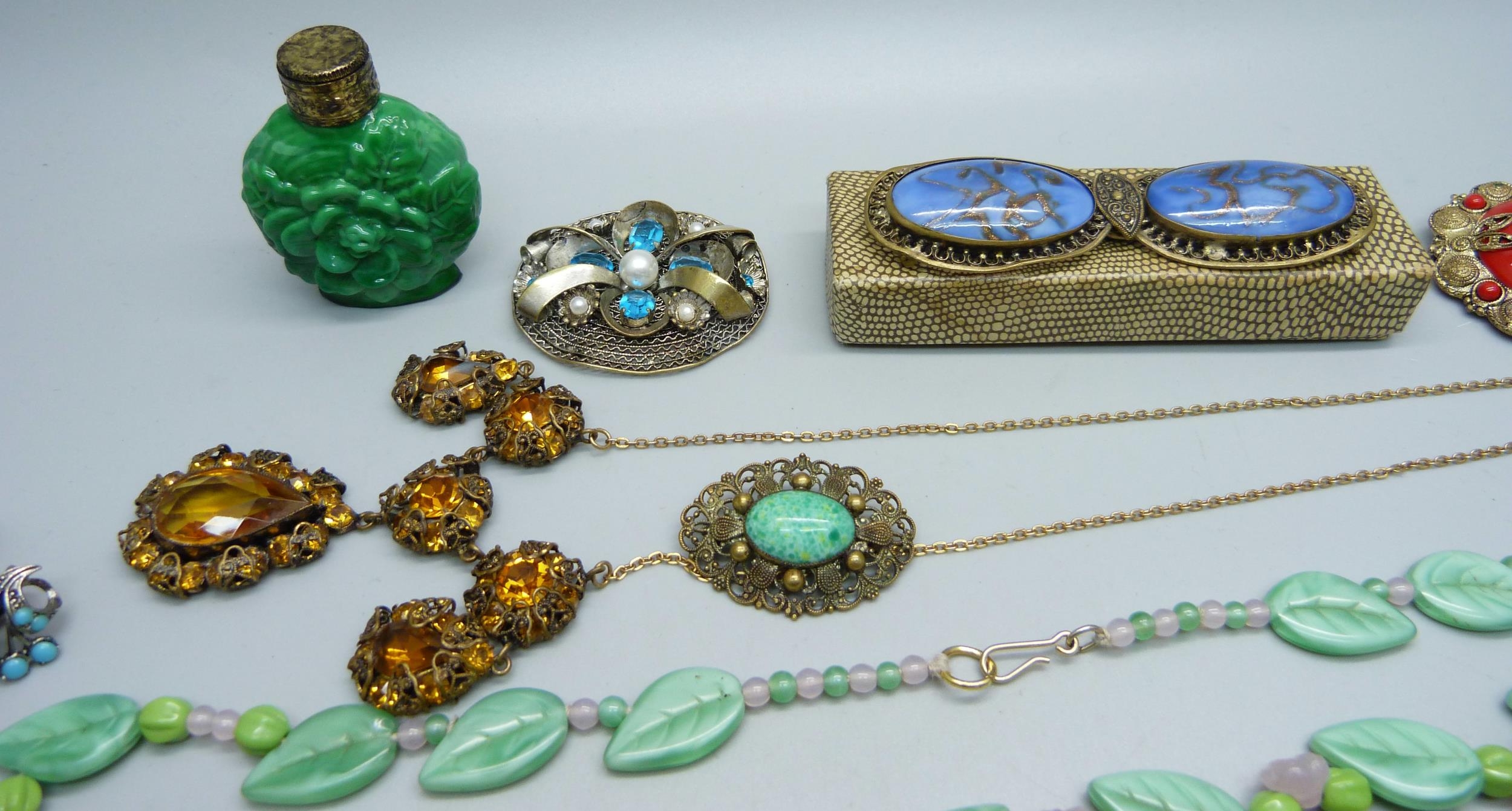 A collection of vintage costume jewellery including Czech and a malachite glass scent bottle